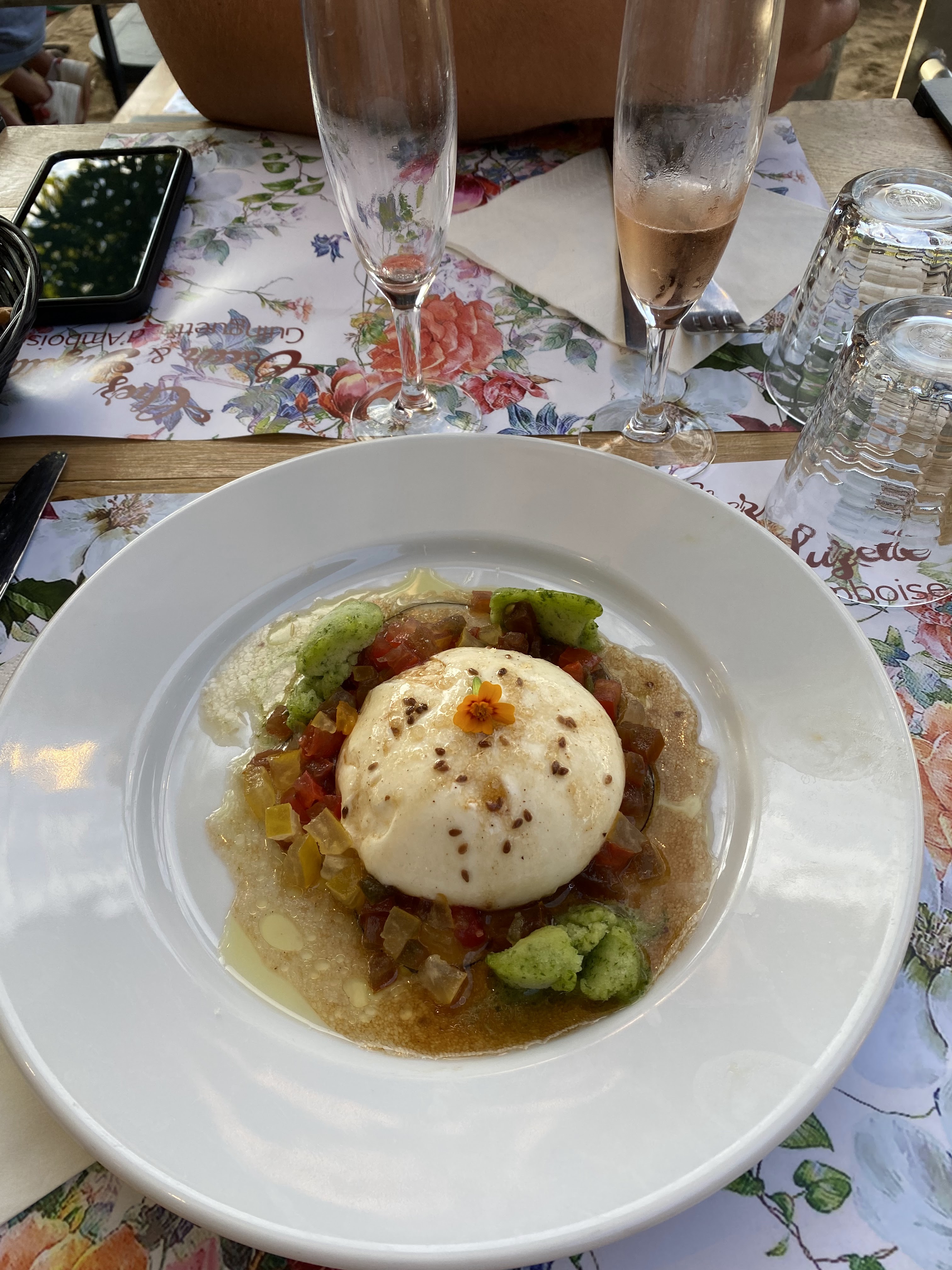 Nous nous sommes arrêtés un midi de semaine dans cette guinguette qui paraissait fort agréable. Le menu ne proposant que quelques plats rassure donc dans un lieu peu adéquat : le parking du marché d'Amboise et le pigeonnier attenant. L'accueil et le service débutent bien et les serveuses, surtout l'une d'entre elles, s'affaire à accueillir, servir, débarrasser et encaisser. Toutefois, et là réside le problème, 25 minutes d'attente pour une salade et une entrée froide (aucune cuisson donc). L'entrée choisie, une burrata, tomates d'antan, pesto et glace à la roquette sonne le glas de ce repas. La burrata était de qualité mais les tomates d'antan sont de simples tomates rondes et la glace à la roquette était tout simplement inexistante... Enfin, en temps de covid-19, les cuisiniers n' avaient qu'à moitié voire pas du tout de masque !