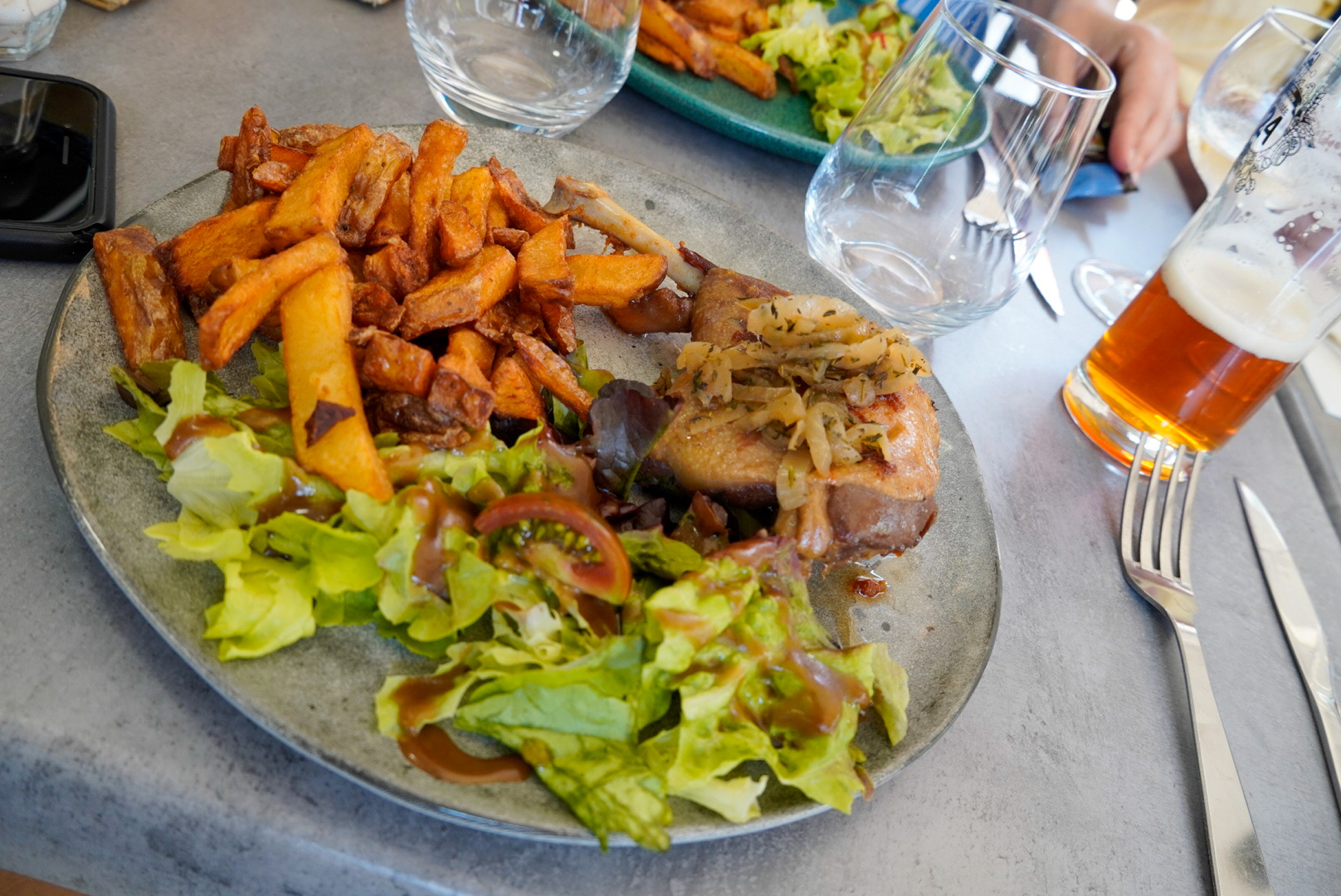 Déçue. Attente 10mn pour avoir la carte puis 1/2h pour le plat. La serveuse nous précise que l'attente est dûe à la cuisson du confit de canard!! Arrivée du plat enfin : petite cuisse de canneton, accompagnée d'une petite poignée de frites cuites et recuites, crammées et huileuses, et salade. Le dessert était correct.