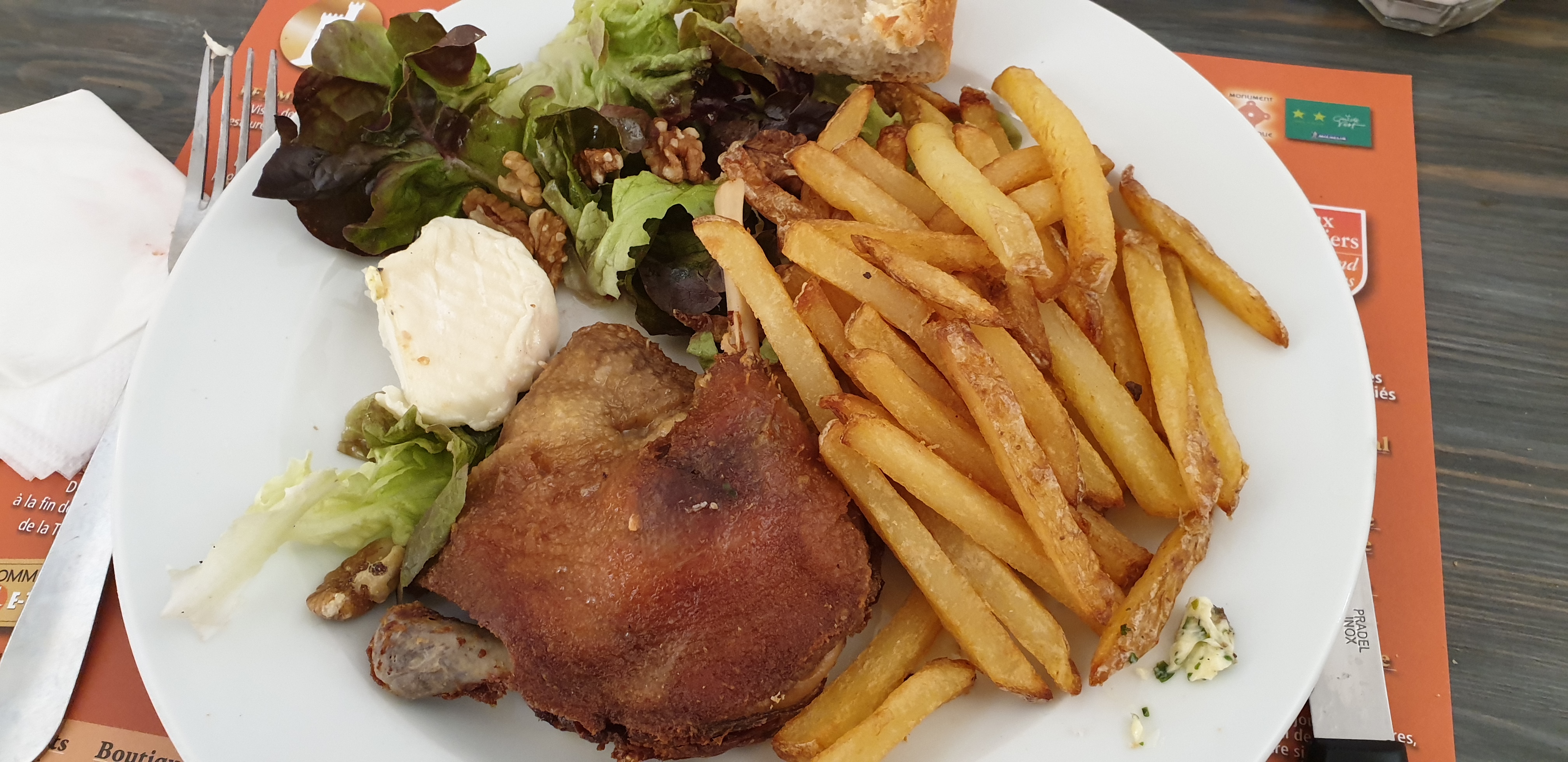 Une carte avec beaucoup de choix(pizza, hamburger, confit, salades, camembert au four....) Assiettes copieuses et le prix est raisonnable Le service est impeccable et les serveurs sont sympathiques😊👌je recommande vivement 👍😉
