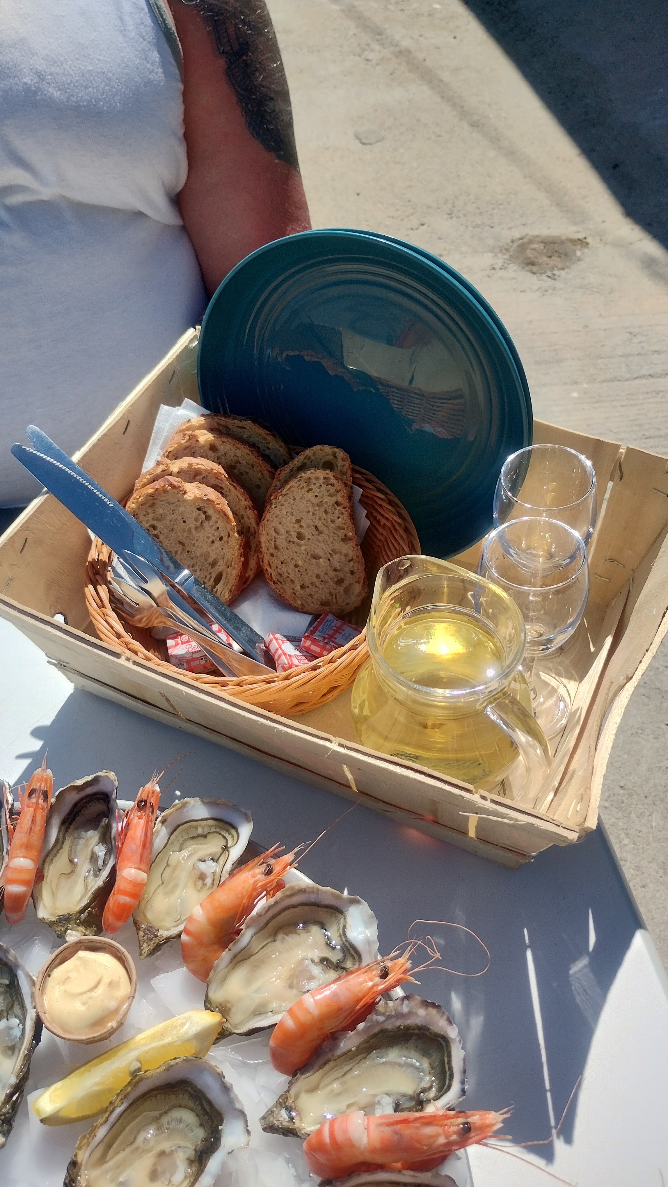 On a pu se régaler avec huîtres et crevettes en mangeant sur la berge sans le pass sanitaire ! Merci pour ce plateau complet, même le beurre et le pain étaient prévus ! Un repas plus que sympathique avant de repartir !