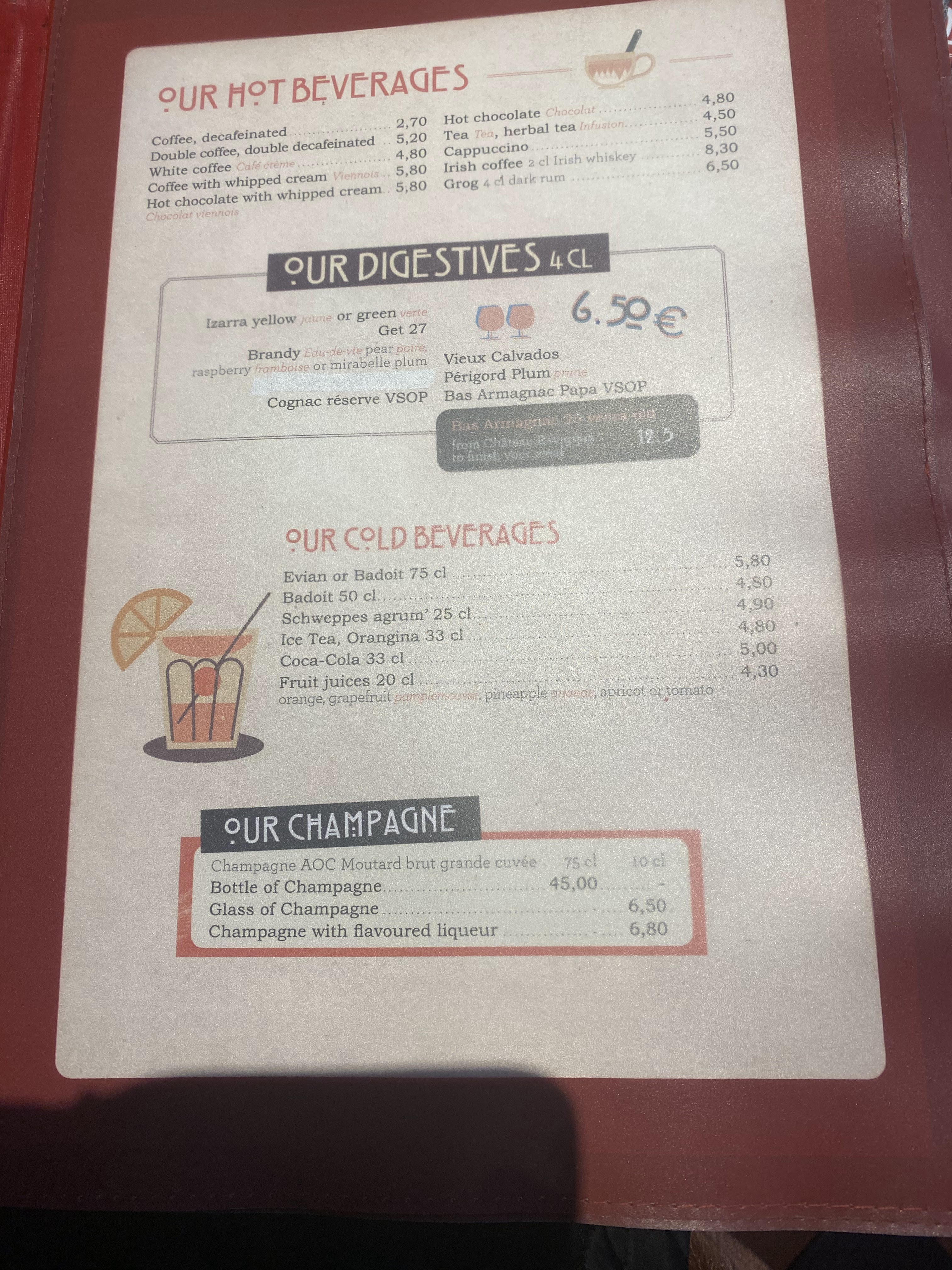 J'ai commandé «l'Escalope de canard auvergnate» et une crème brûlée pour le dessert. Honnêtement, j'ai trouvé que la nourriture était plutôt correcte. Copieux et savoureux mais rien d'extraordinaire. Je n'ai pas réservé de table et on m'a poliment dit d'attendre seulement 20 minutes. Pour les touristes, il y a des menus en anglais. Nous avons eu de la chance avec un serveur anglophone (une jeune femme vraiment sympathique).