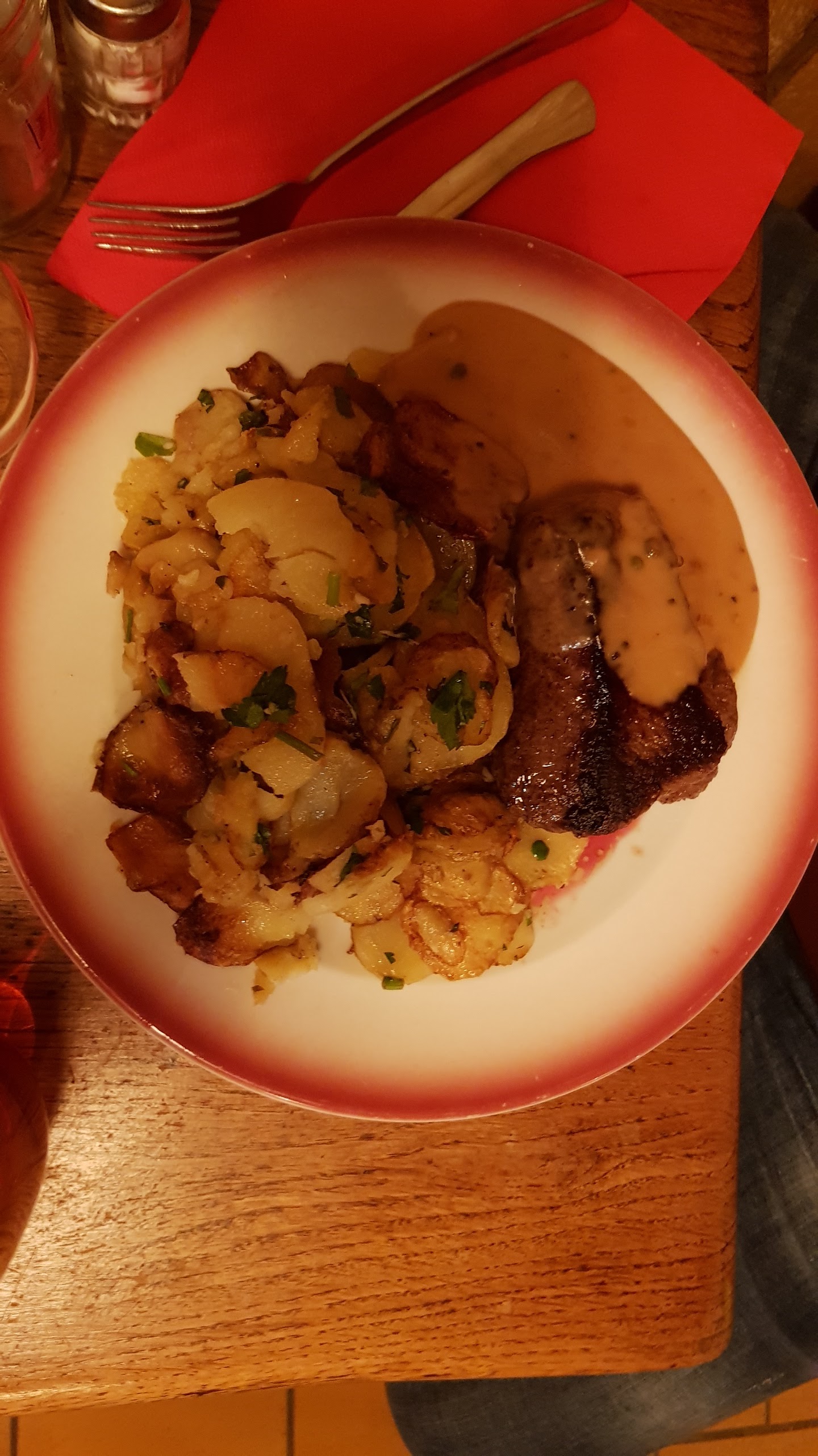 La côte de bœuf était correcte. Très gras et sans assaisonnement (peut-être que l'assaisonnement est une chose américaine ?) Les pommes de terre étaient super ! Le pâté de foie d'oie était correct. Mais pas à mon goût. Essayé pour la première fois.