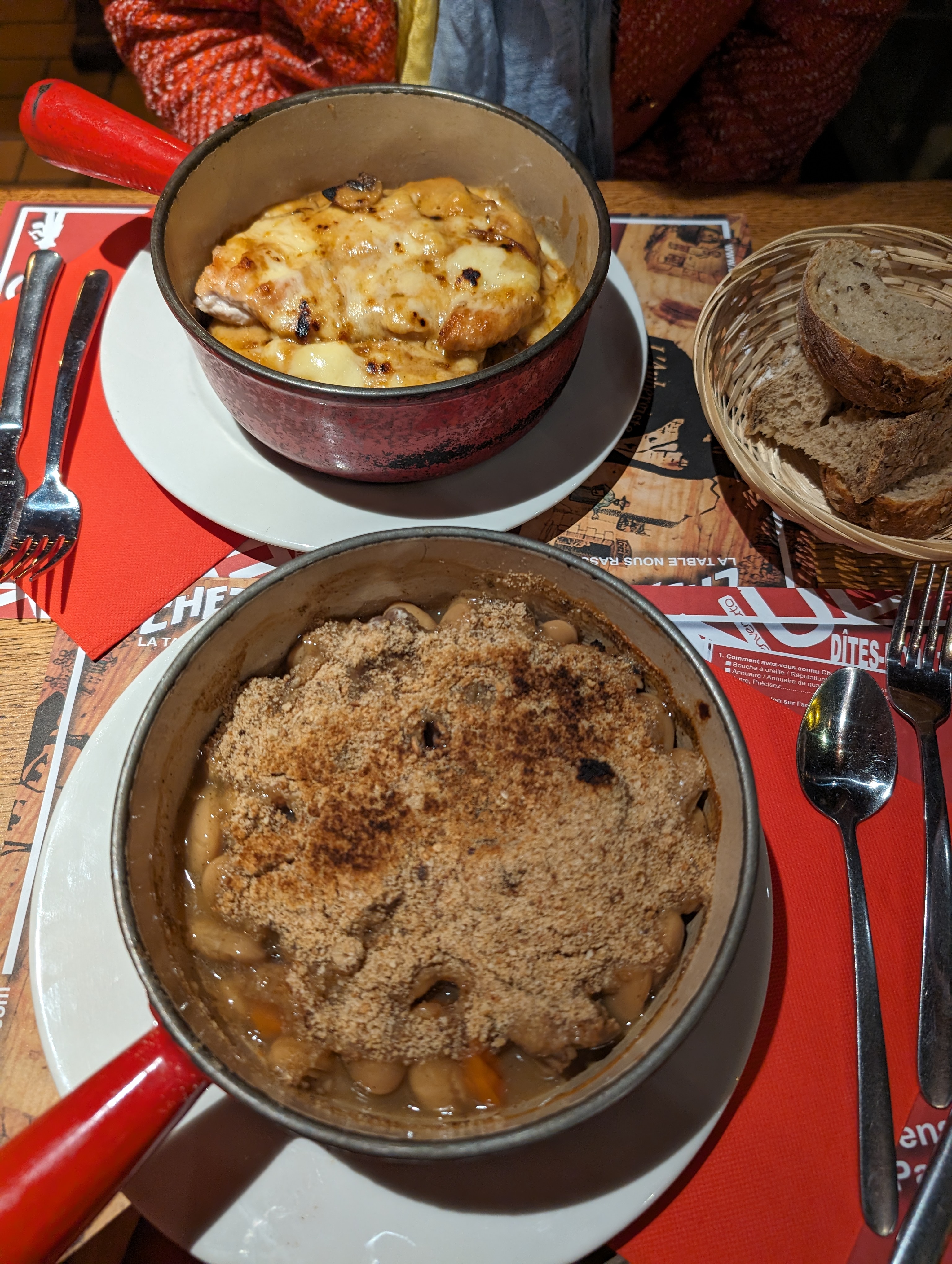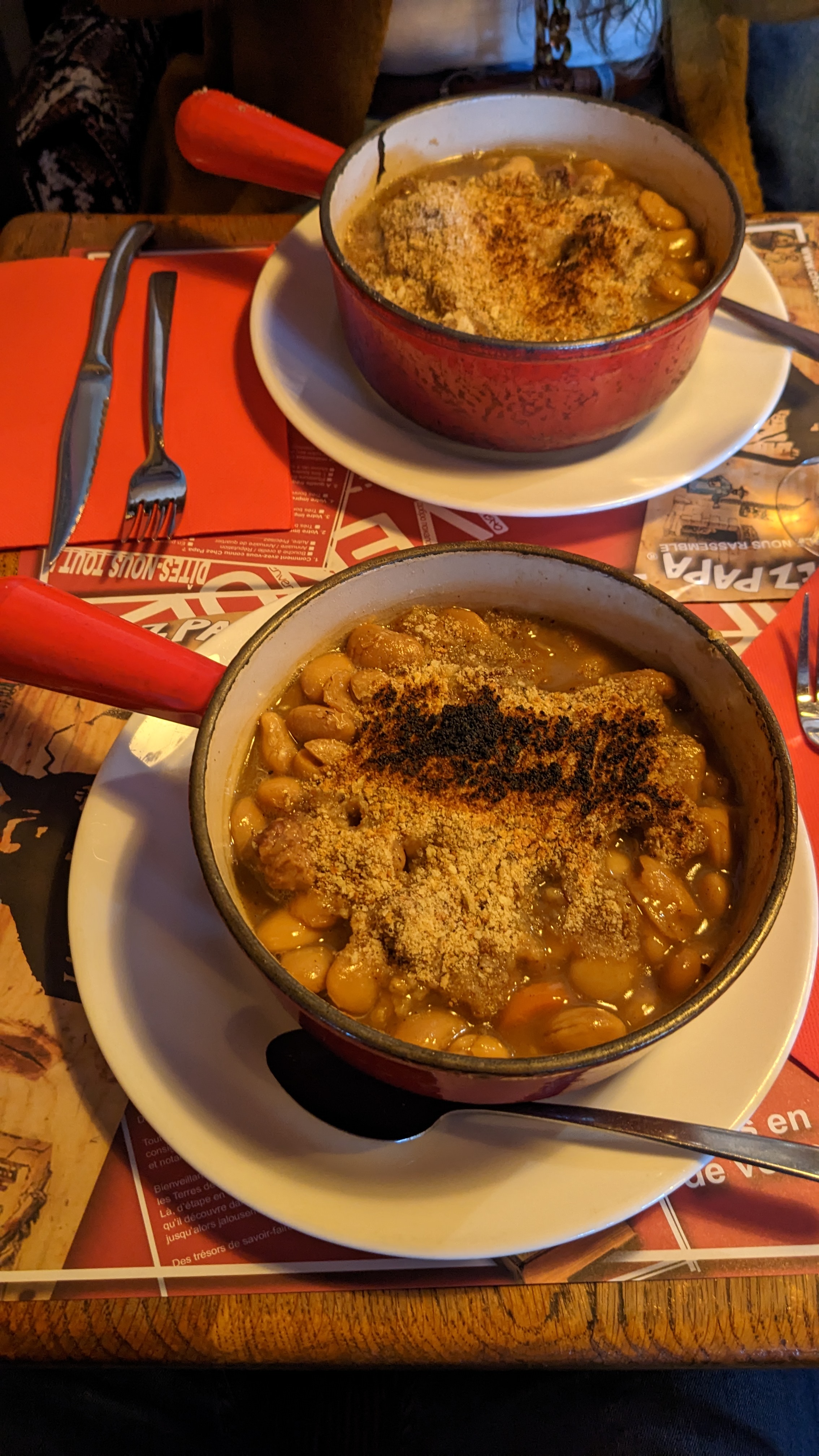 Visité à 23h30. Heureux de trouver un endroit qui ne ferme pas à 21h30 pour dîner sans chichi. Je ne voyais pas comment réserver en ligne, alors j'ai appelé. Maria parlait anglais et était très accueillante. J'ai été impressionné par le cassoulet - j'ai lu de nombreuses critiques avant de décider de l'essayer ici, et les critiques ne lui rendent toujours pas justice. Deux pilons de canard, du veau, des saucisses et beaucoup de haricots et une garniture de crumble constituent une énorme et copieuse surprise. Le crumble aux pommes était croustillant, comme annoncé. Hautement recommandé.