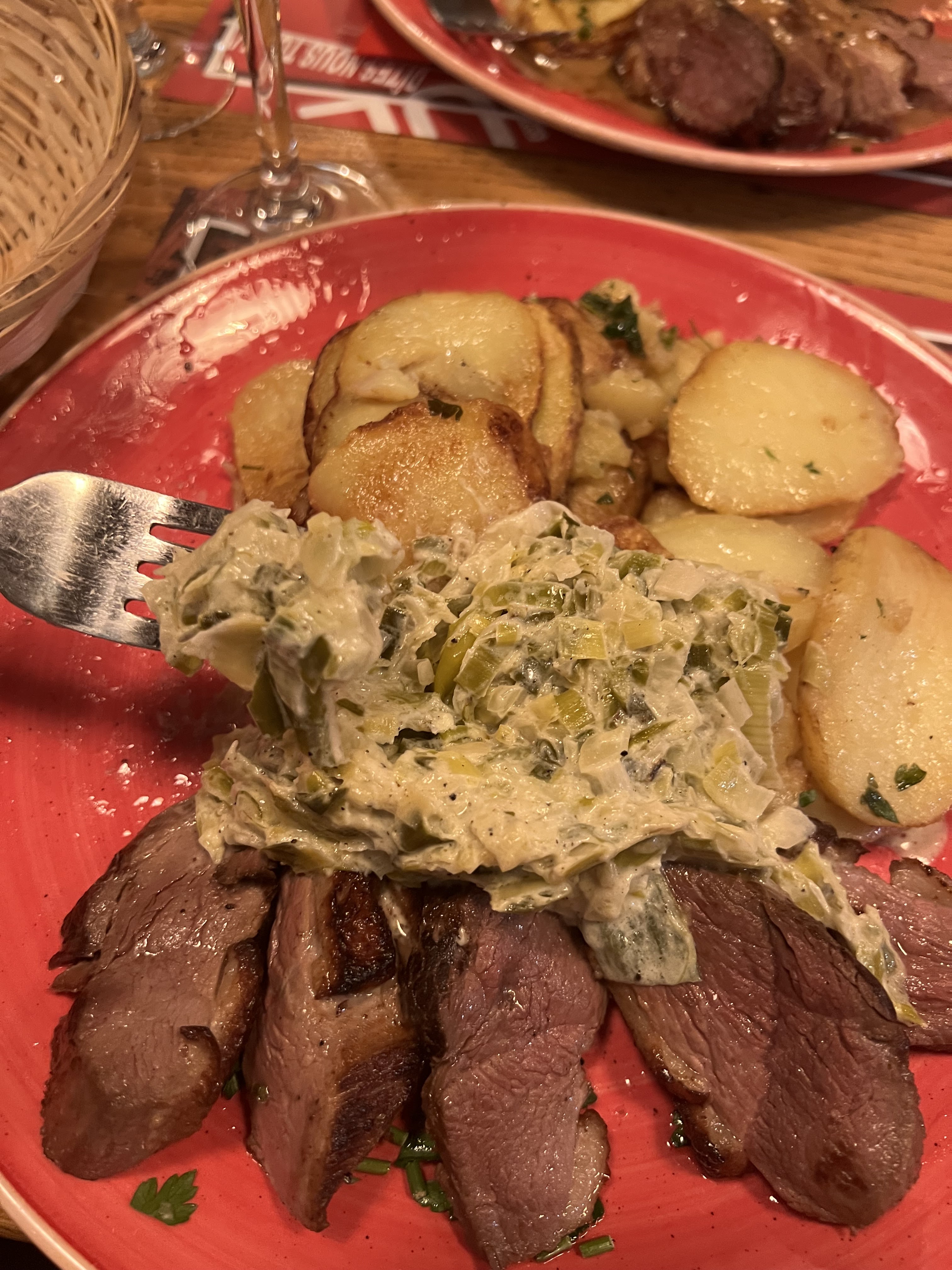 J'ai commandé le magret de canard avec un poireau confit et une bière - une de leurs spécialités selon eux. Le canard était à peine chaud et presque complètement sans saveur, le poireau confit lui-même essayait de compenser cela mais... n'était tout simplement pas si savoureux. Le service était bien. Assiette géante de nourriture, même si c'était principalement des pommes de terre.