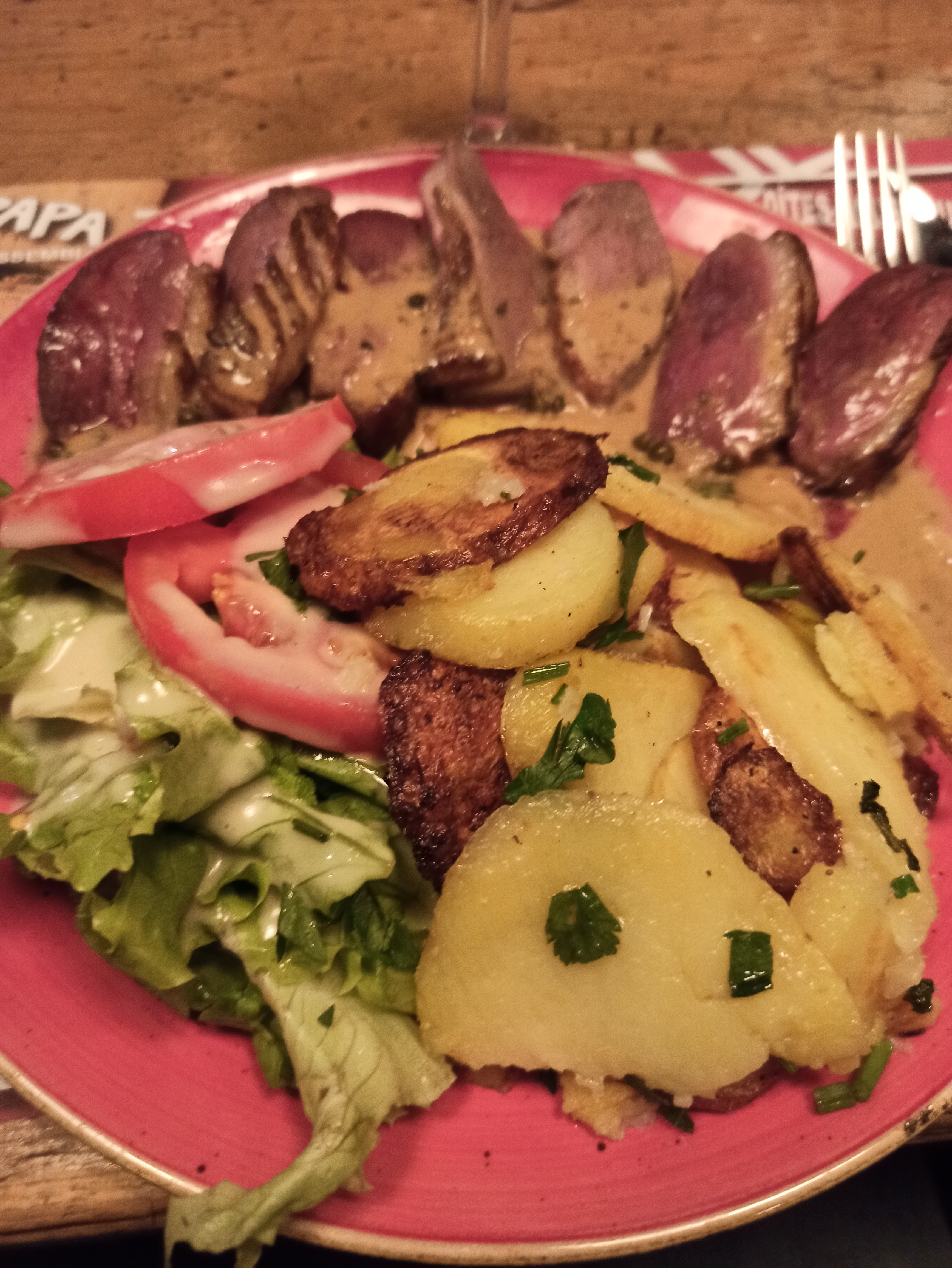 L'endroit idéal pour manger du canard. Ambiance charmante. Propriétaire sympathique. Serveur sympathique. Je recommande vivement le magret sauce au poivre vert, accompagné de délicieuses pommes de terre sarladaise. Goûtez également le foie de canard poêlé.
