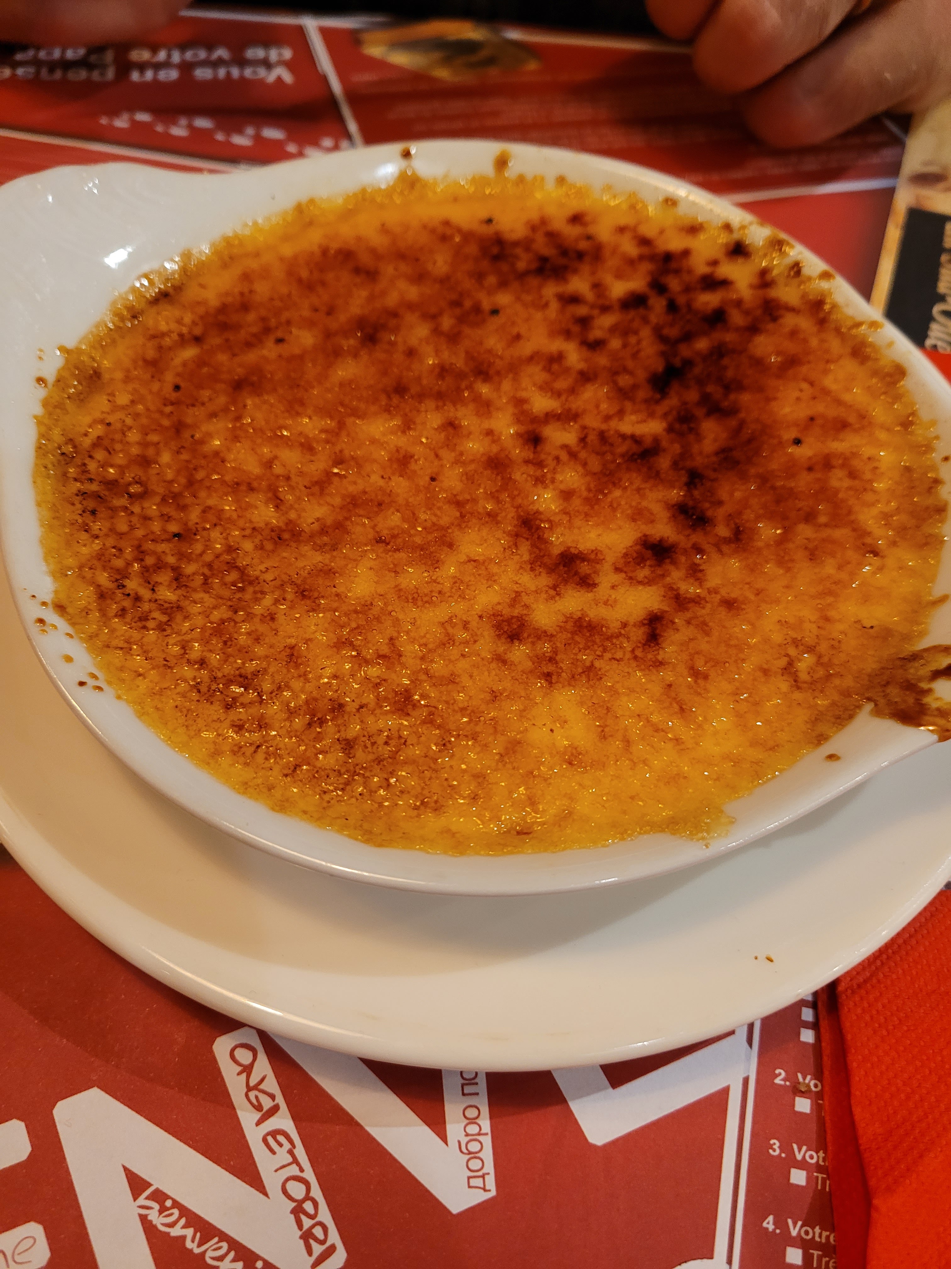 La nourriture est plutôt bonne mais comme dans une grande partie de Paris, c'est un peu trop cher pour ce que c'est. Nous avions une bonne place près de la fenêtre ouverte à côté de la rue. Le service était bien. J’ai commencé avec les escargots de Papa, qui étaient un peu trop fades et auraient pu utiliser plus d’assaisonnement et absorber davantage les saveurs de la sauce. Le plat principal était du canard confit avec des poireaux et des pommes de terre. Les pommes de terre étaient excellentes ; le canard était plutôt bon mais aurait pu avoir un meilleur cuisinier sur certains d'entre eux. Le dessert était une crème brûlée avec une crème anglaise riche, même si la croûte aurait pu être incendiée davantage.