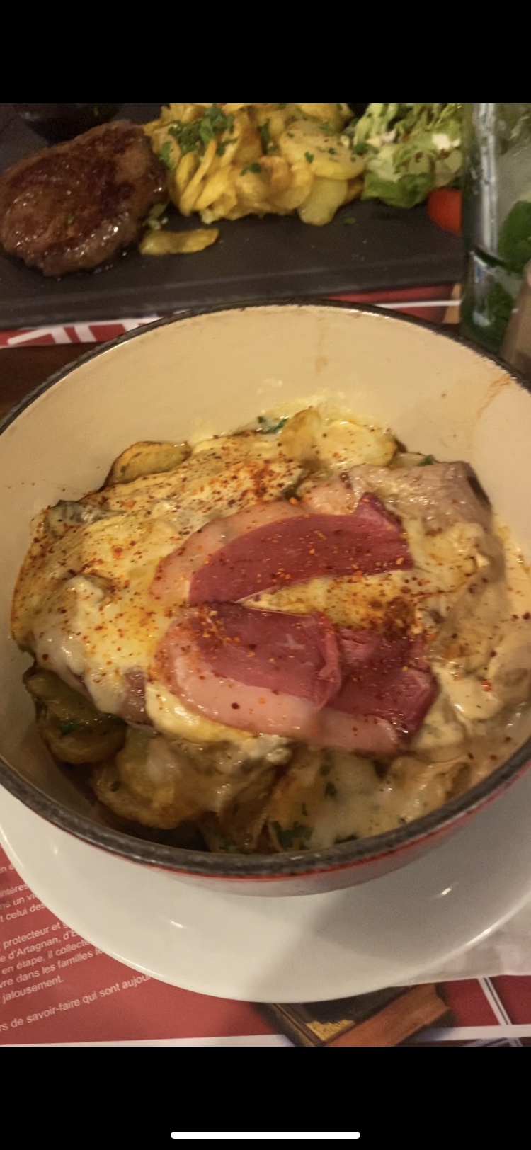 Ce restau est une TUERIE ! Bon ce n'est pas donné mais vraiment c'est un régal. J'ai pris l'escalope de veau qui est servie dans une cassolette avec sauce champignon, du jambon de pays, des tranches genre chorizo il m'a semblé, et des pommes de terre en tranches dorées, le tout gratiné au cantal et avec une persillade.. j'ai rarement aussi bien mangé. Mon ami avait pris le trio de canard qu'il a trouvé délicieux. De même pour la brioche perdue et la tarte tatin flambée, à tomber. J'y retournerai sans hésiter. L'accueil est super sympa en plus. Superbe adresse.