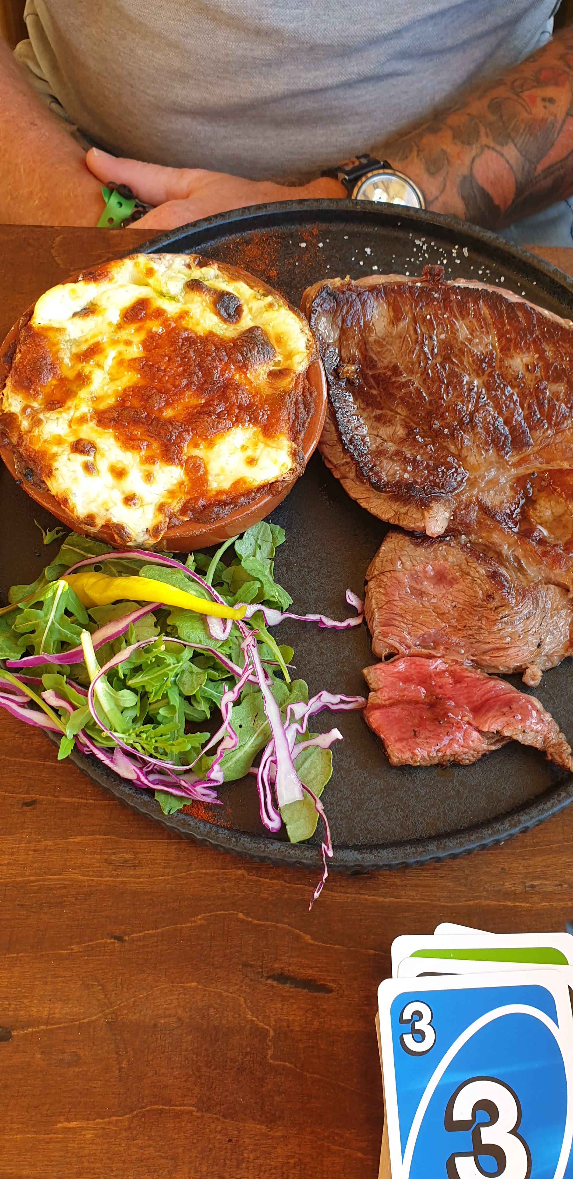 Nous sommes arrivés il n y avait qu’un seul couple , la manageuse nous a placé juste à côté ! Nous avons refusé car nous voulions mon mari et moi avoir de l intimité ! Il y avait suffisamment de petites tables ! J ai pris un gratins de gnocchis c était infect … mais le coucher de soleil a sauvé le repas .. nous préférons largement les petits bouchons en bas :les pieds dans le sable,nourriture délicieuse et une meilleure équipe avec le même coucher de soleil !