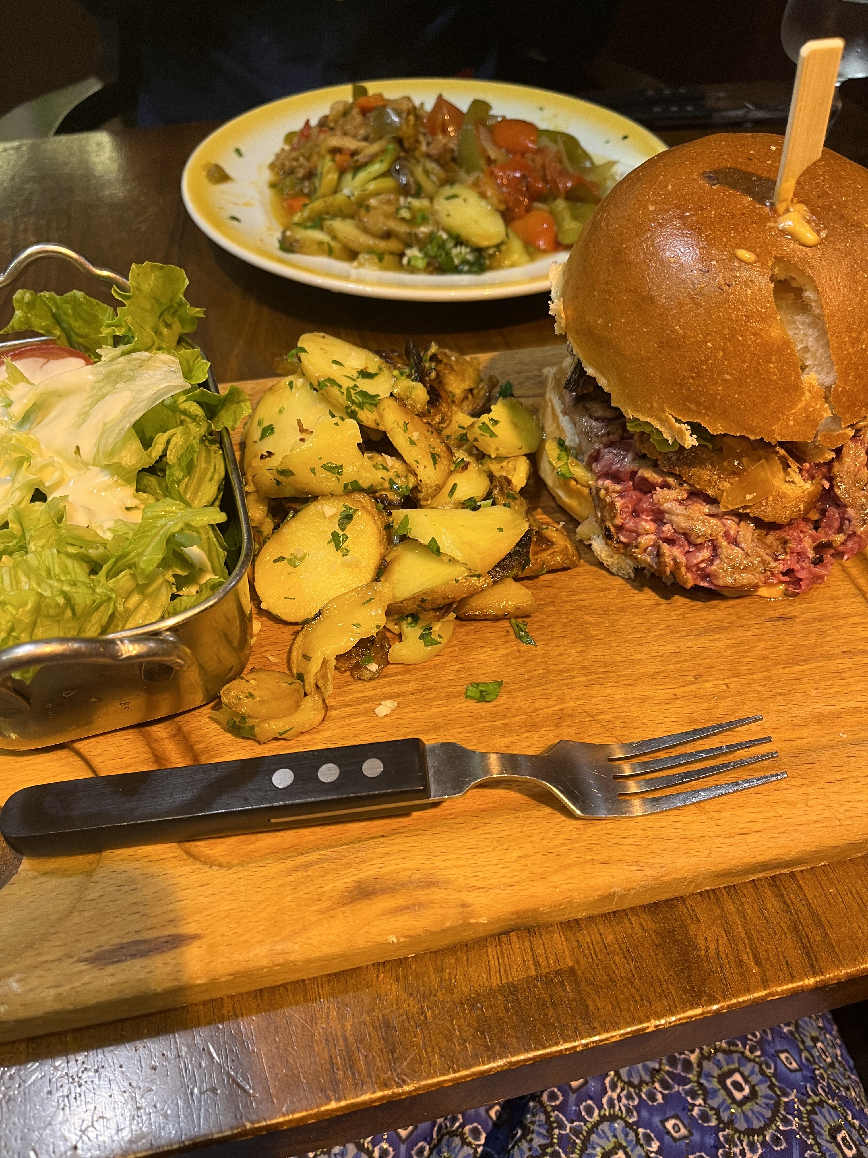 Le service était incroyable, ils étaient si gentils avec nous même avec la barrière de la langue. La nourriture était délicieuse, mon mari et moi avons partagé un hamburger et ils nous ont partagé les assiettes sans que nous le demandions. Le burger était juteux et savoureux et les accompagnements étaient incroyables. Si vous déambulez comme nous, n’hésitez pas à vous arrêter !