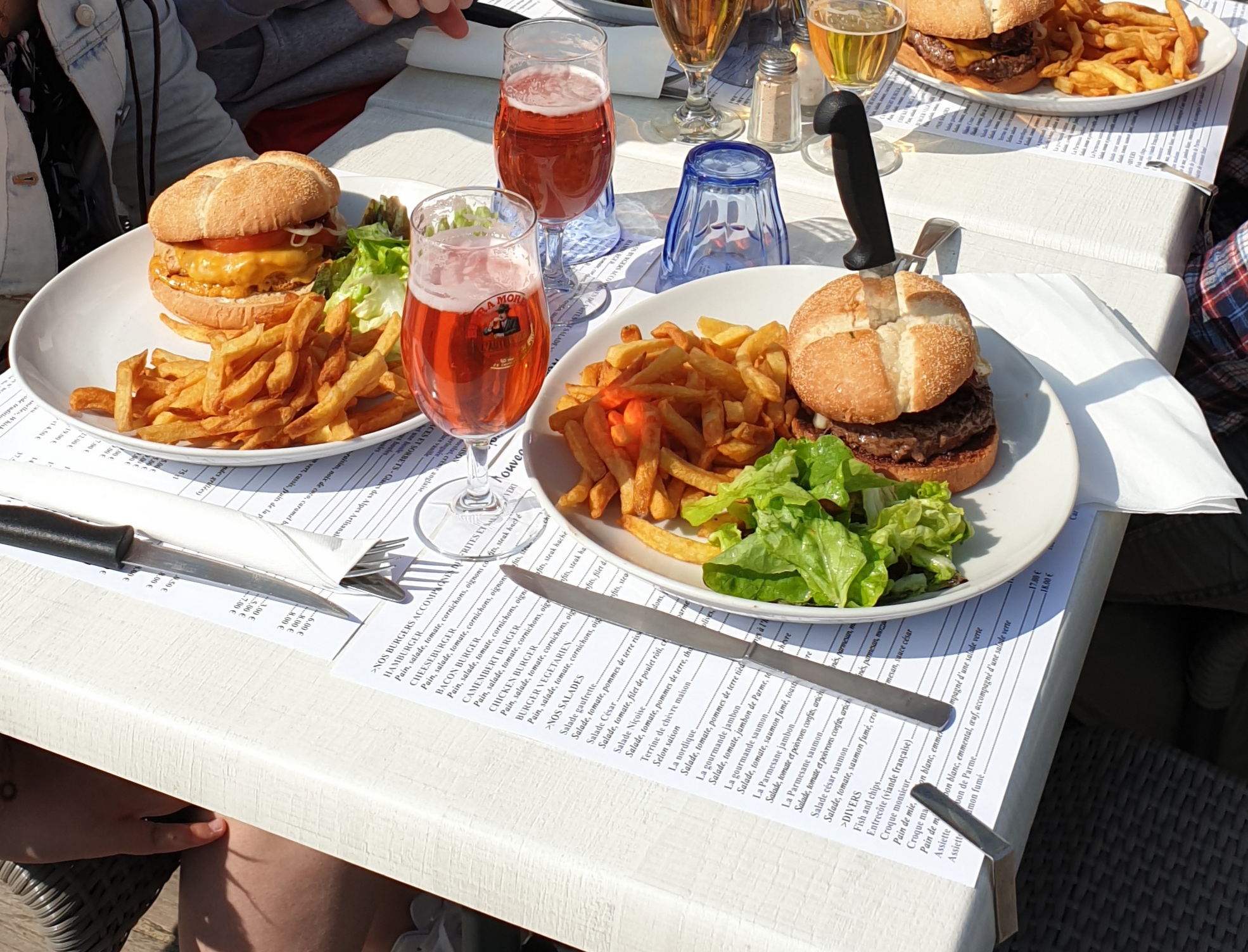 On cherchait un resto pas trop chère, et on a trouvé : un diabolo fraise et un shweppes agrumes, un Cheeseburger très bon 14€50 et le veggie burger aussi 15€50, en dessert un banana split 8€50 pour 2👍 ~ 46euros, prix un peu élevé pour un repas en bord de plage mais reste raisonnable 😎👌