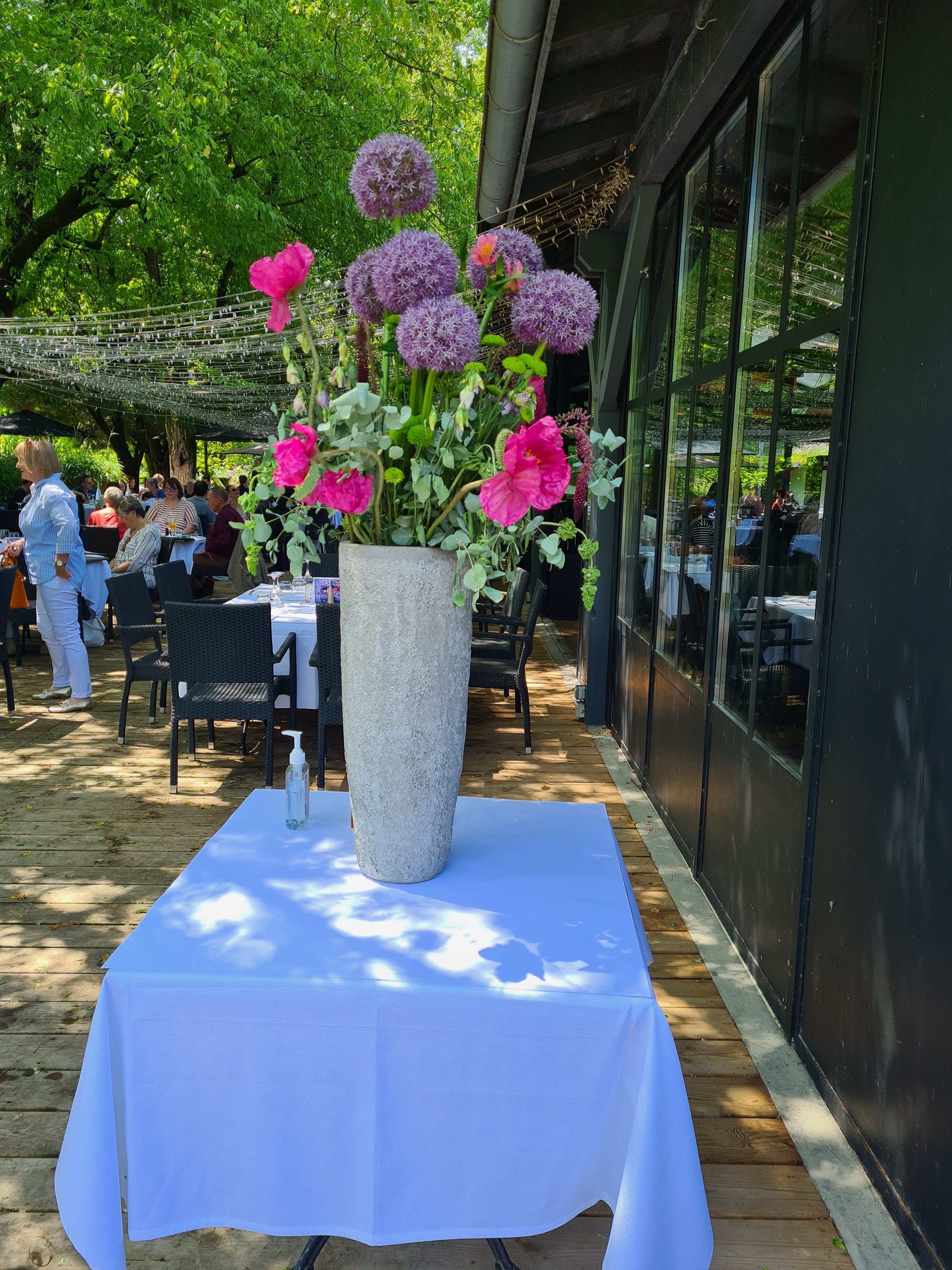 Un endroit merveilleux au milieu d arbres magnifique. Une terrasse immense . Un personnel très attentionné et professionnel. Une excellente cuisine. Que demander de plus peut-être du soleil que nous avons eu ce jour là. J oubliais les chiens sont acceptés nous avons pu y aller avec notre petit westie mais une autre table avait un gros chien. Une belle adresse.