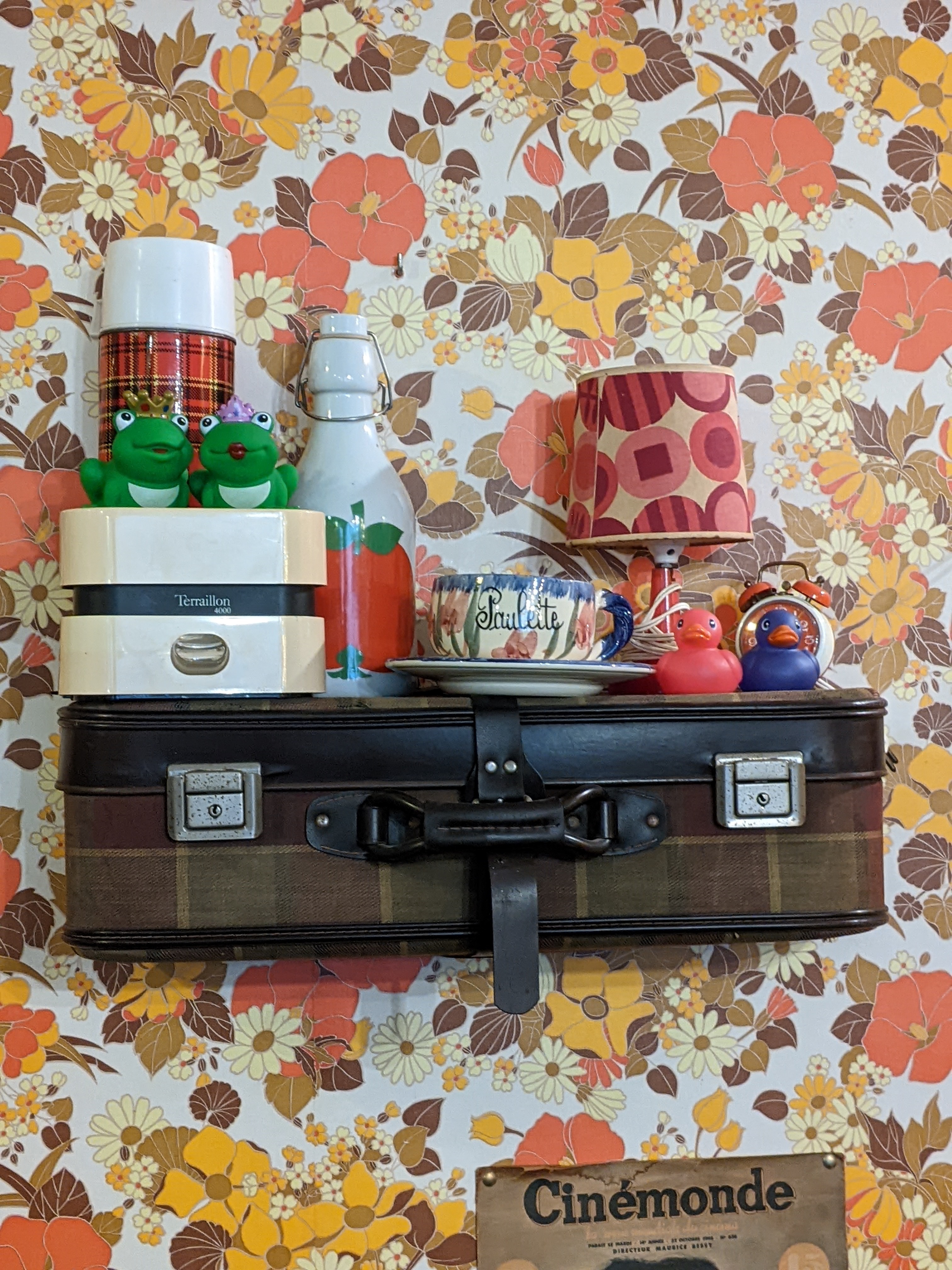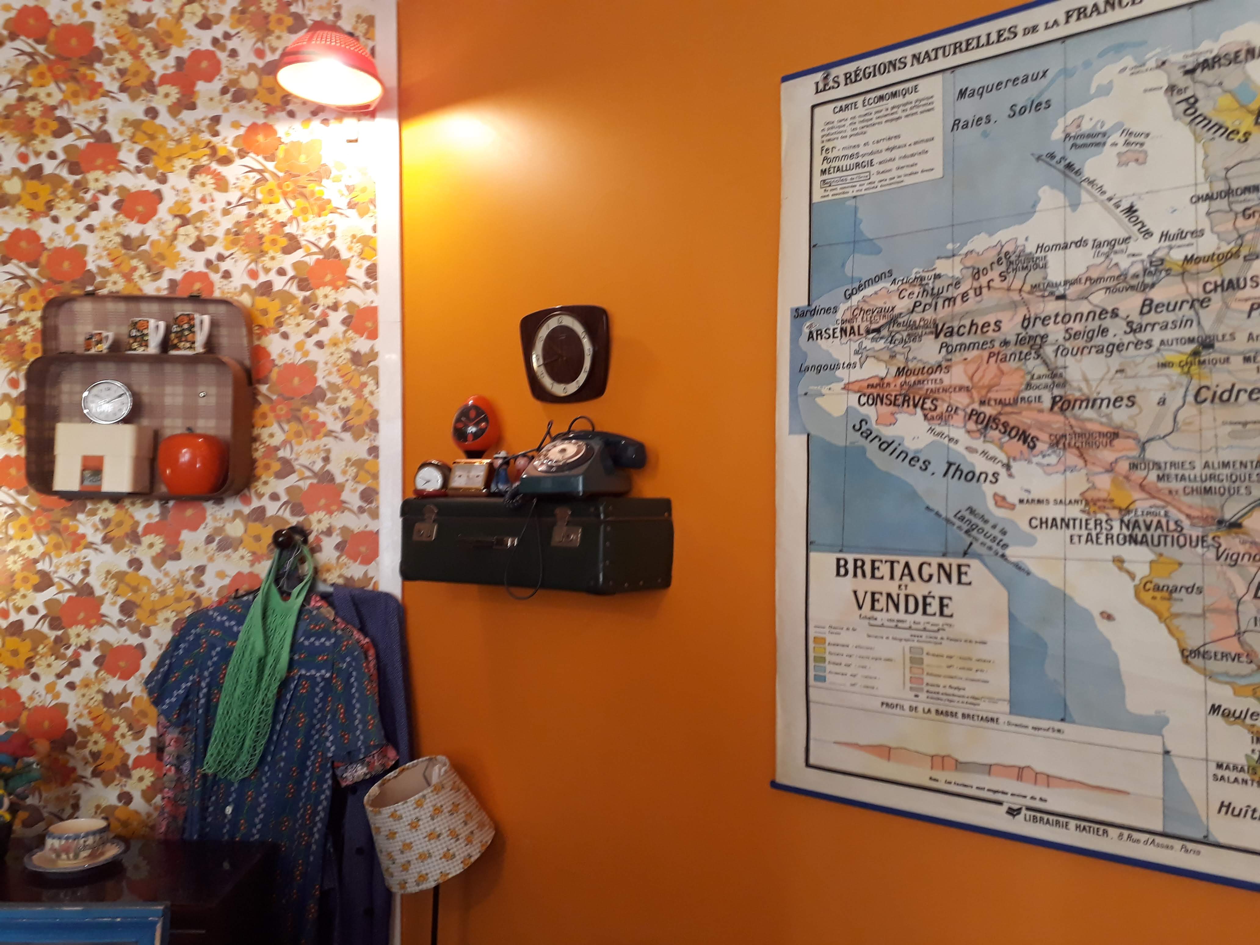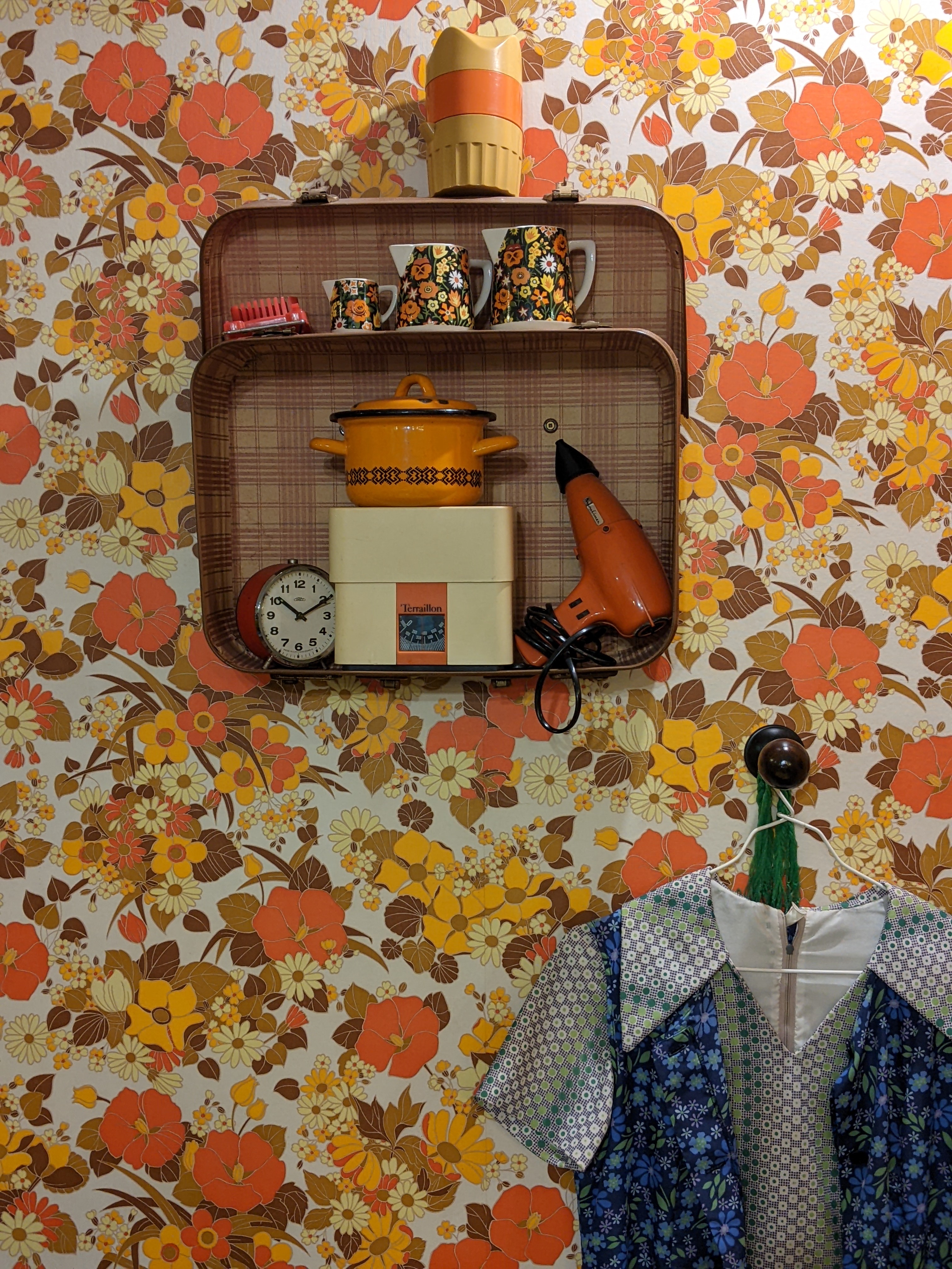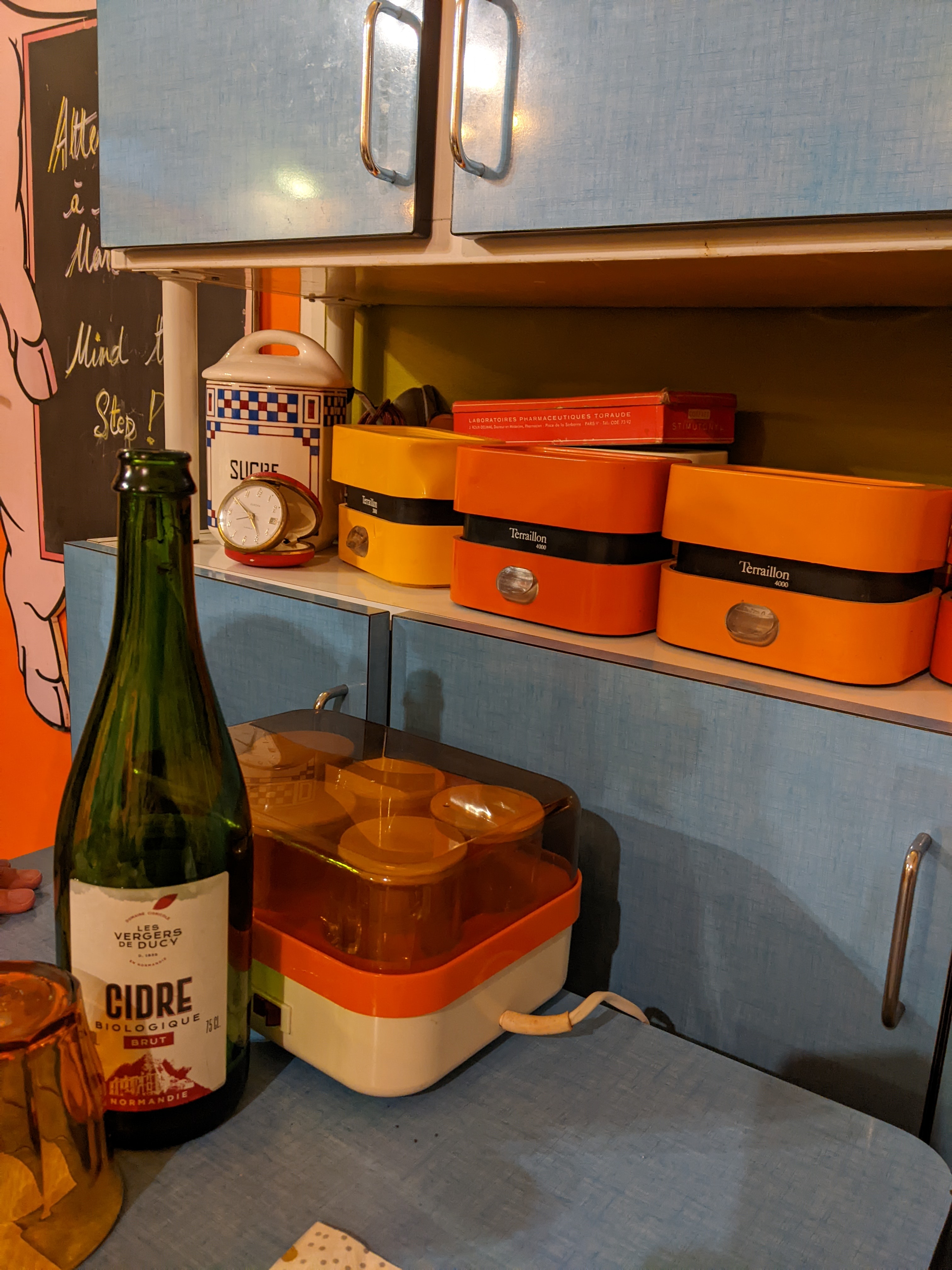 Dégustation de son délicieux bagel accompagné de ses légumes frais et d'une panacotta citronnée humm !! dans une ambiance décalée, une remontée dans les années 60-70 où chaque objet, chaque papier peint rappelle un souvenir .. la blouse de Mamie, les horloges colorées, des objets du quotidien de la ménagère de l'époque (couteau électrique qui coupait le rôti du dimanche, la balance de cuisine jaune/orange... ) Un excellent voyage gustatif et décoratif !!! ✨