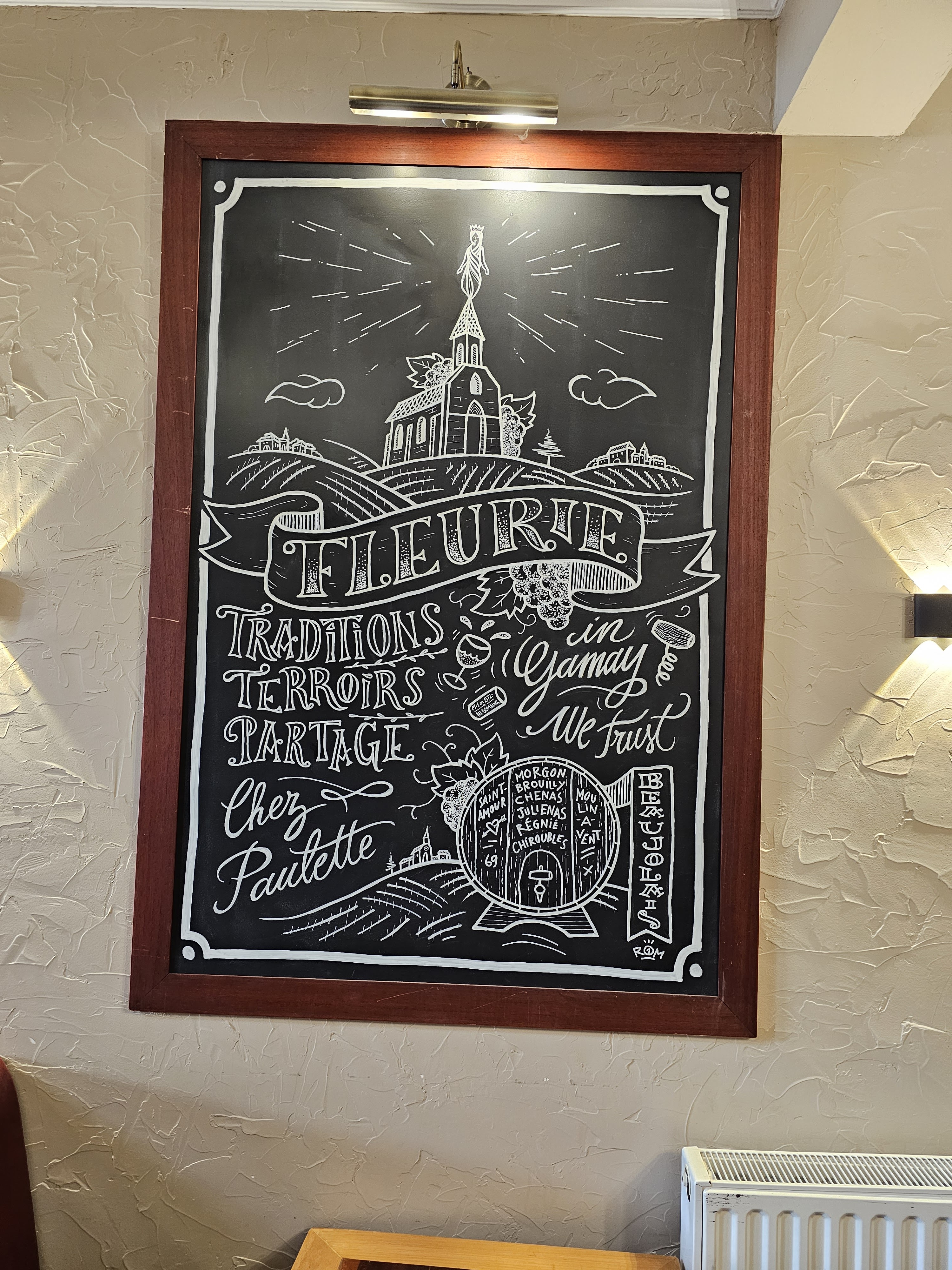 Un petit restaurant convivial et cosy au cœur du village de Fleurie. Malheureusement, nous étions au Beaujolais hors saison, c’est pourquoi il n'y avait donc qu'un plat de charcuterie pour le dîner. Mais le plat était très savoureux et juste ce qu'il fallait pour accompagner un bon vin rouge de Fleurie! Le service était sympathique et attentionné. L'atmosphère relaxe du restaurant était particulièrement agréable alors que les vignerons locaux venaient ici pour une gorgée de vin. Nous serons heureux de revenir lorsque Paulette est ouverte en été, afin de pouvoir goûter la cuisine délicieuse et les autres spécialités.