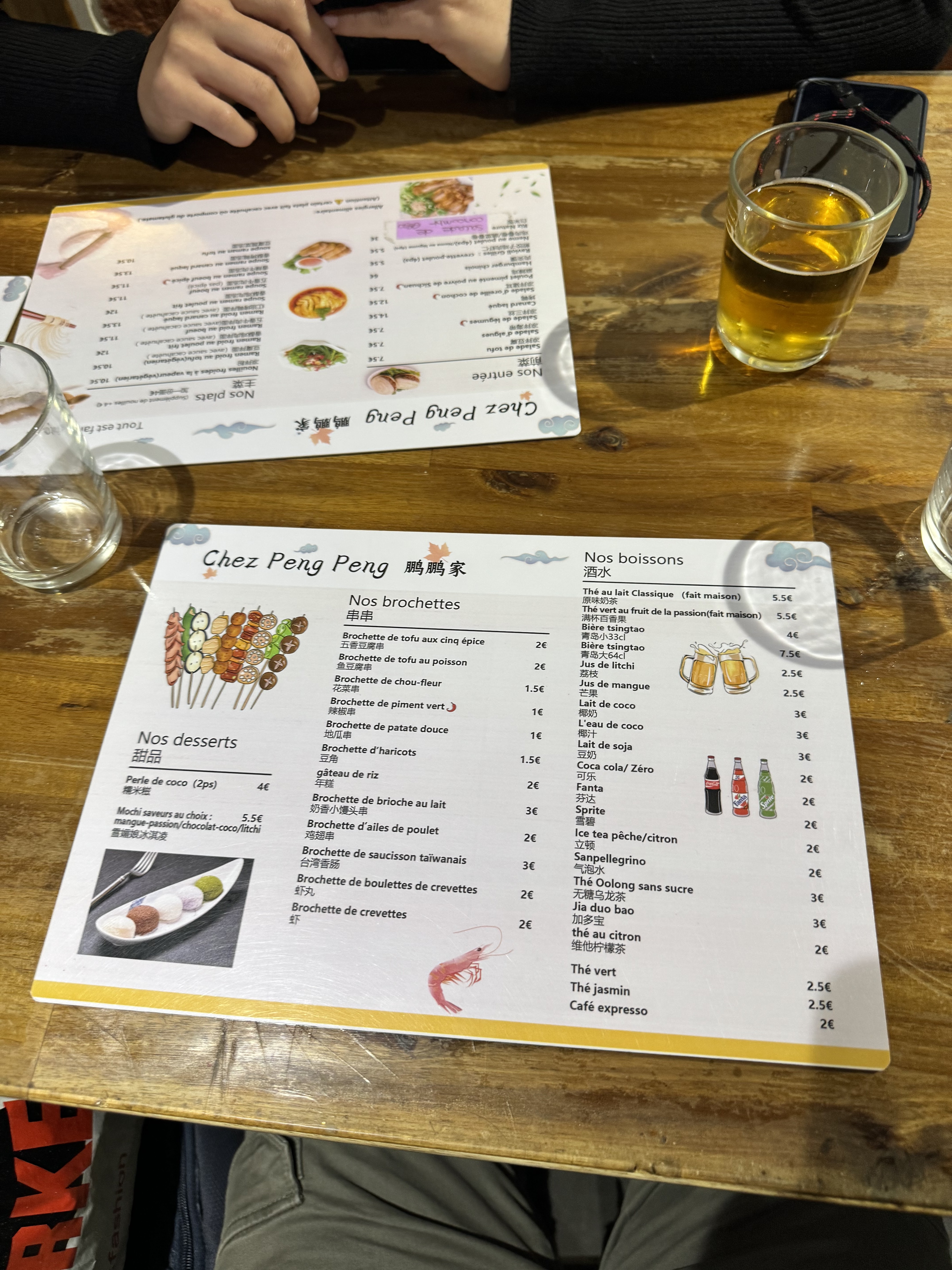Les plats que j'ai pu goûter (brochettes/burger chinois) étaient vraiment très bons. Les gérants sont aimables, les petits bonbons au moment de réglé sont une petite touche très mignonne. Les prix sont très attractifs, les boissons proposés (bière, thé froid au citron) sont aussi de qualités. Bref, du tout bon, je reviendrais.