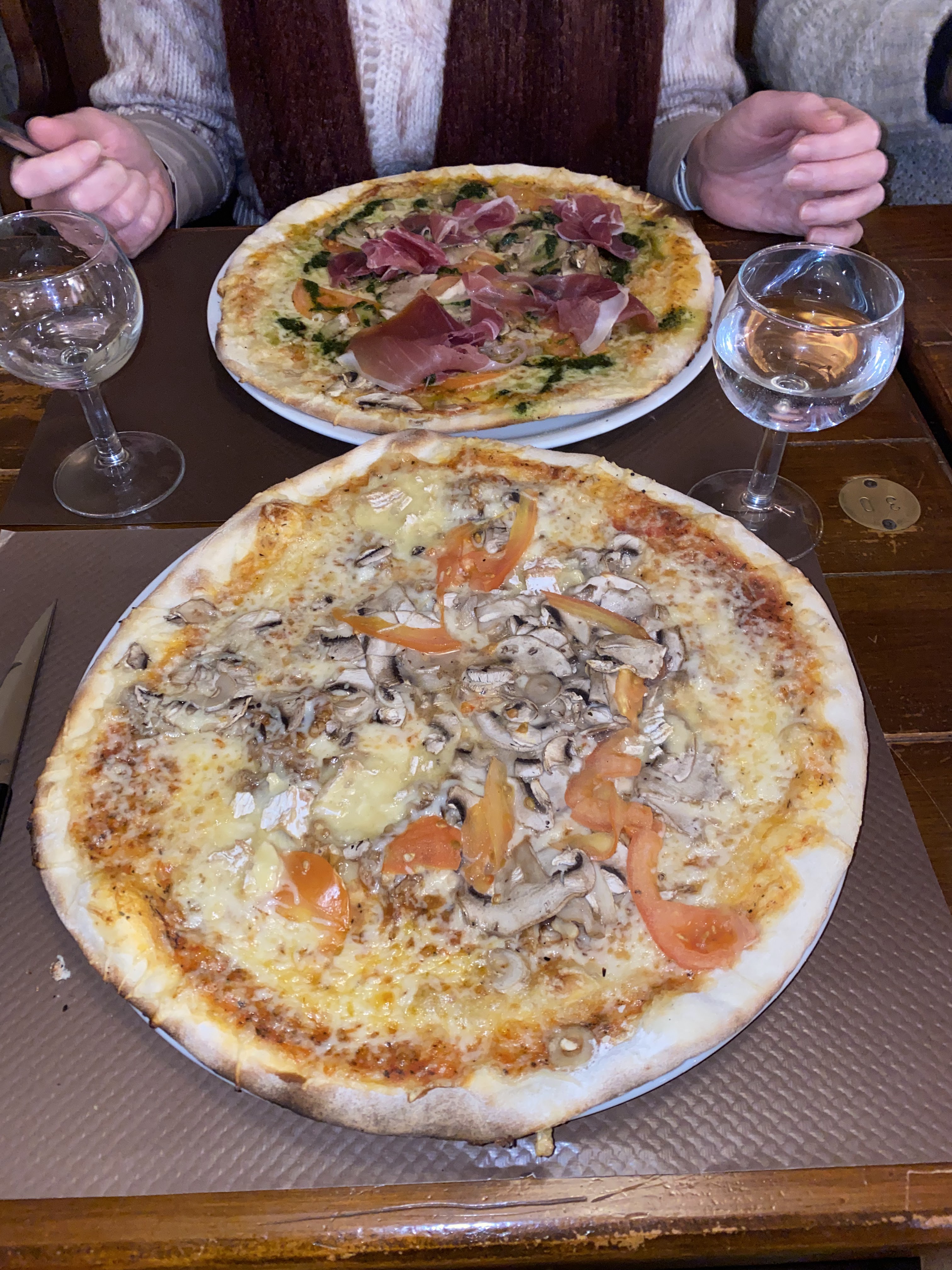 Commandé à emporter. Pizza belle à vue d’œil (lardons, champignons, pommes de terre, camembert), avec un gros lit d’emmental en dessous… pourquoi? De l’emmental partout sur presque toutes les pizzas de la carte. Aucunes saveurs des aliments, l’impression de manger une pizza 4 fromages, bourrative au bout de 2-3 parts… déçu par rapport au prix de manger ça.