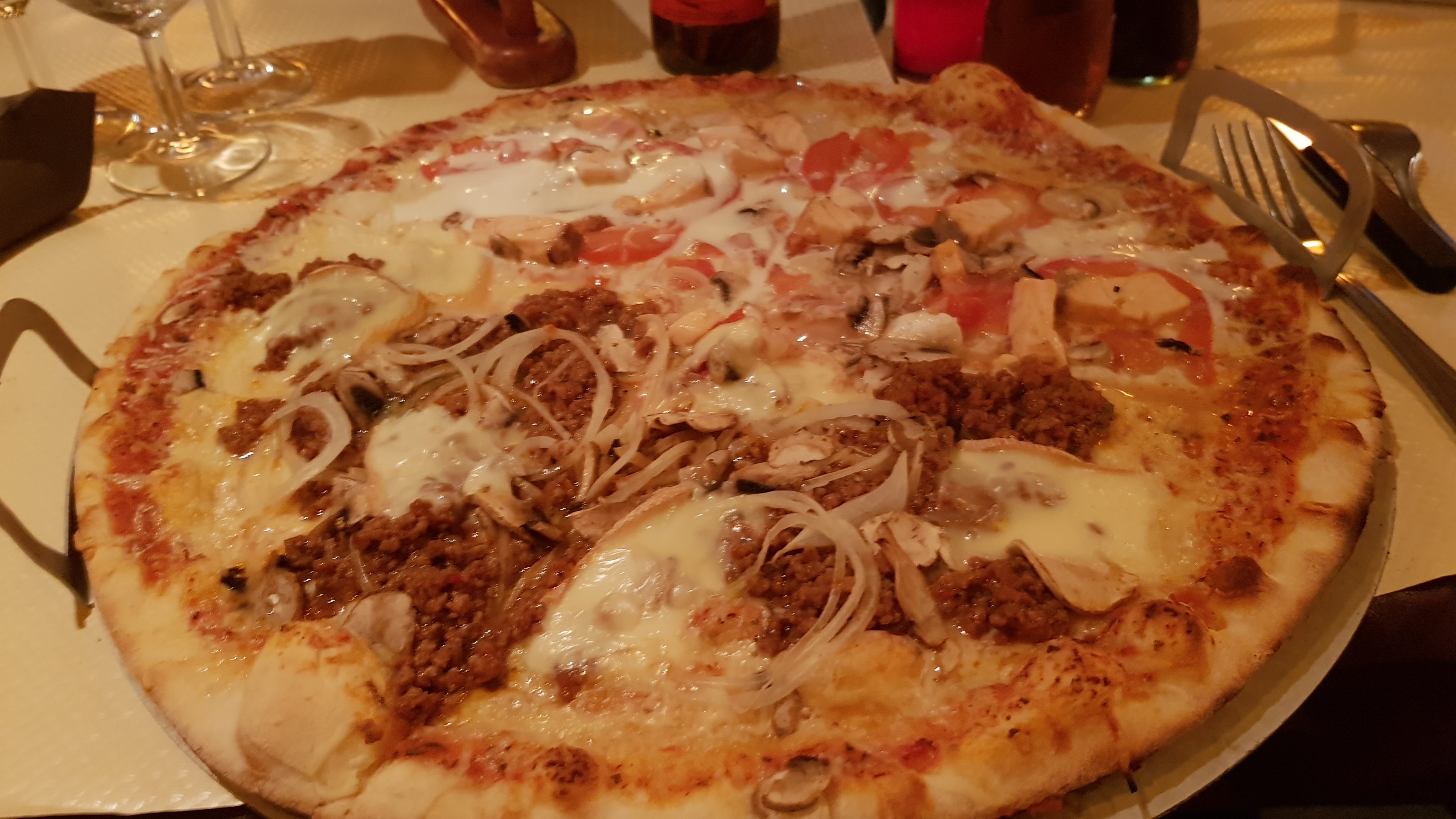 Nous avons voulu nous faire plaisir et commander 2 pizza en livraison . Le livreur se tromper d’adresse cela peux arriver . Pizza froide et le suroît que le cuisiner a du avoir la main lourde sur les ognons. Résultat une soirée en famille autour d’une bonne adress qui est juste maintenant l’ombre de son nom . Dommage encore un bon restaurant qui s’éteint .