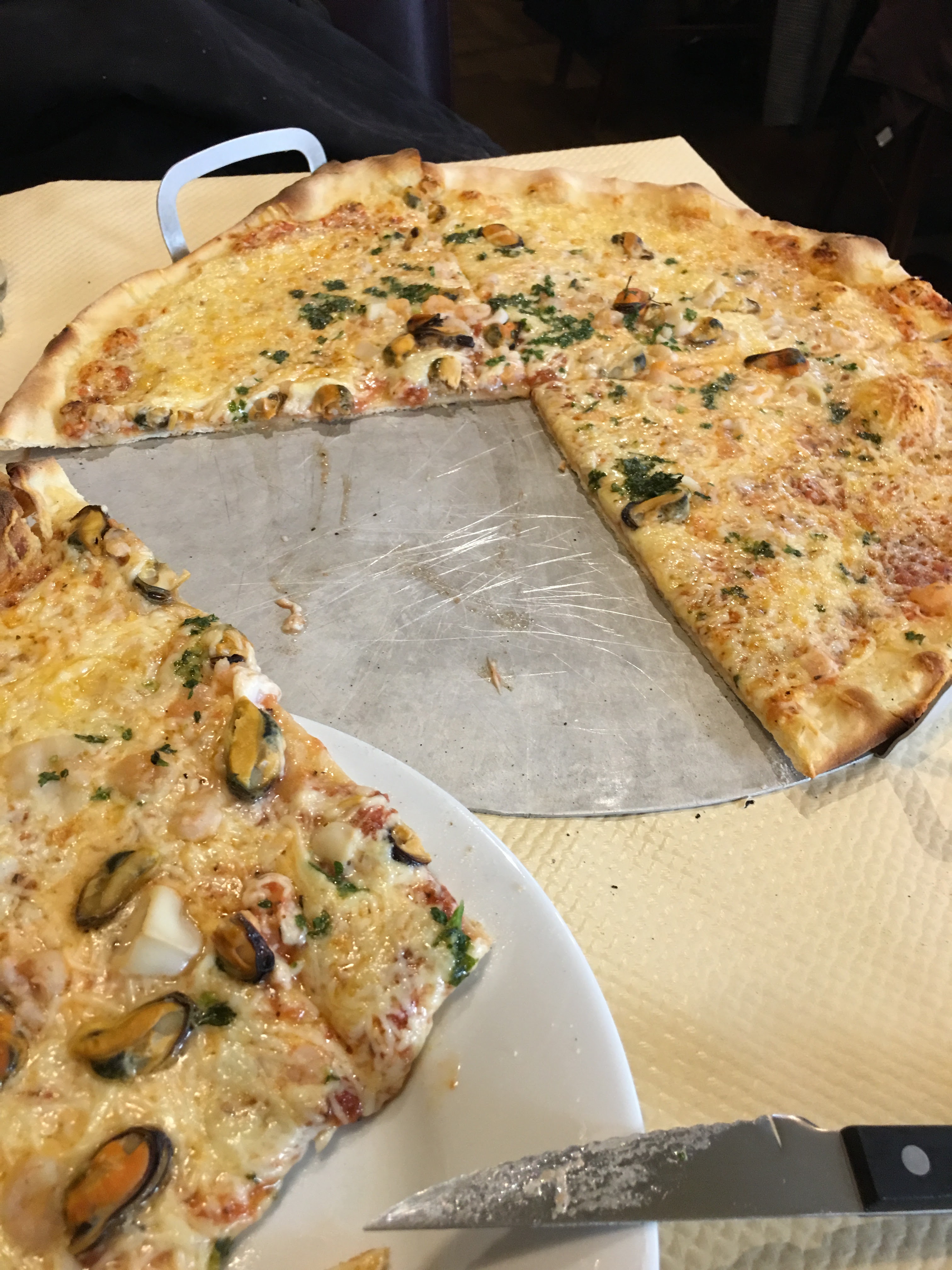 Très bonne Pizza fruits de mer pour deux très copieuse pour une personne et qui mériterait d’être servie en 2 services
