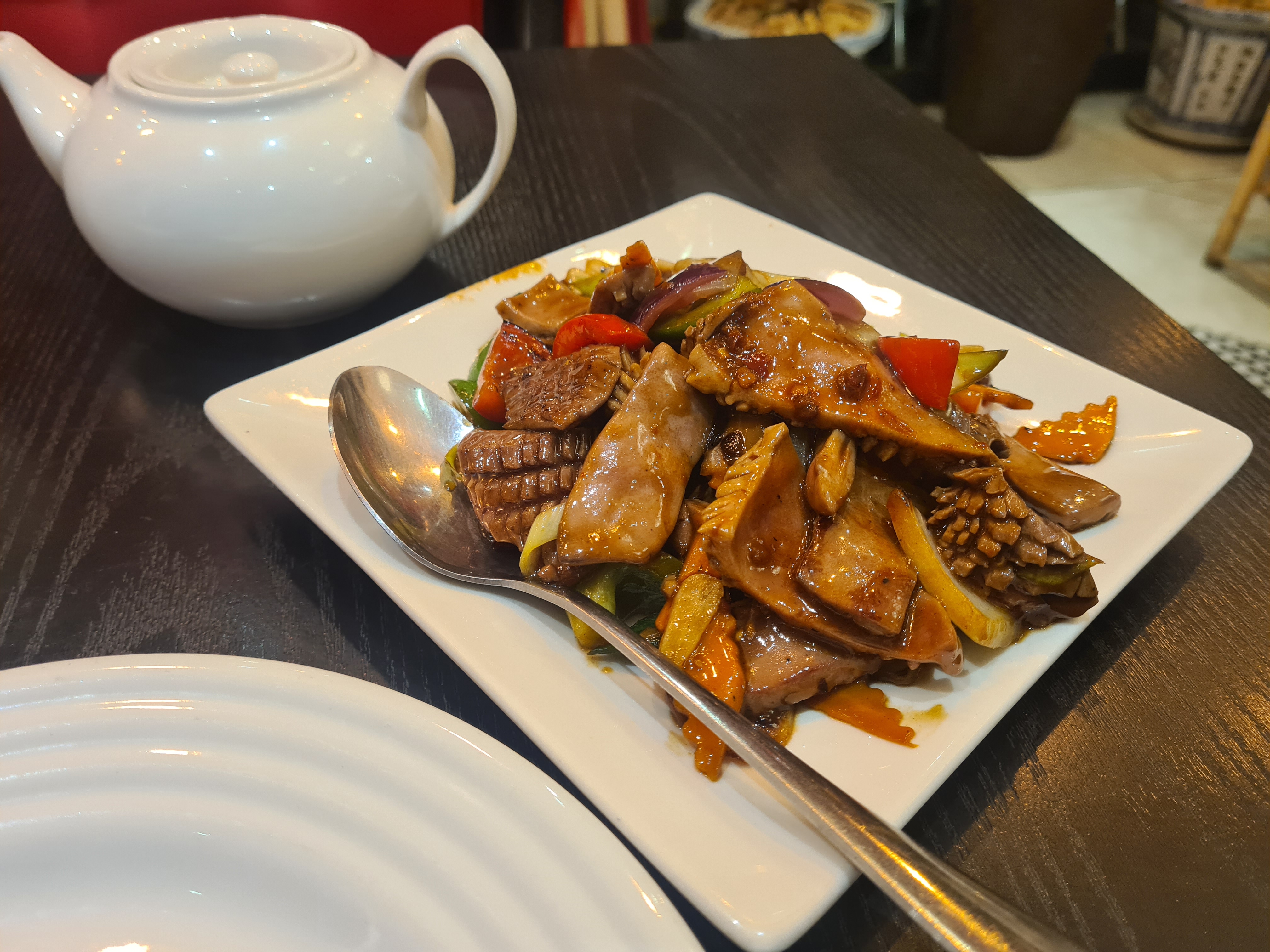 Un pas plus loin dans la cuisine sichuanaise avec ce sang de porc et intestins sautés...apres les rognons de porc sauce piquante hier ....toujours une très belle portion bien relevée et qui présente bien ...