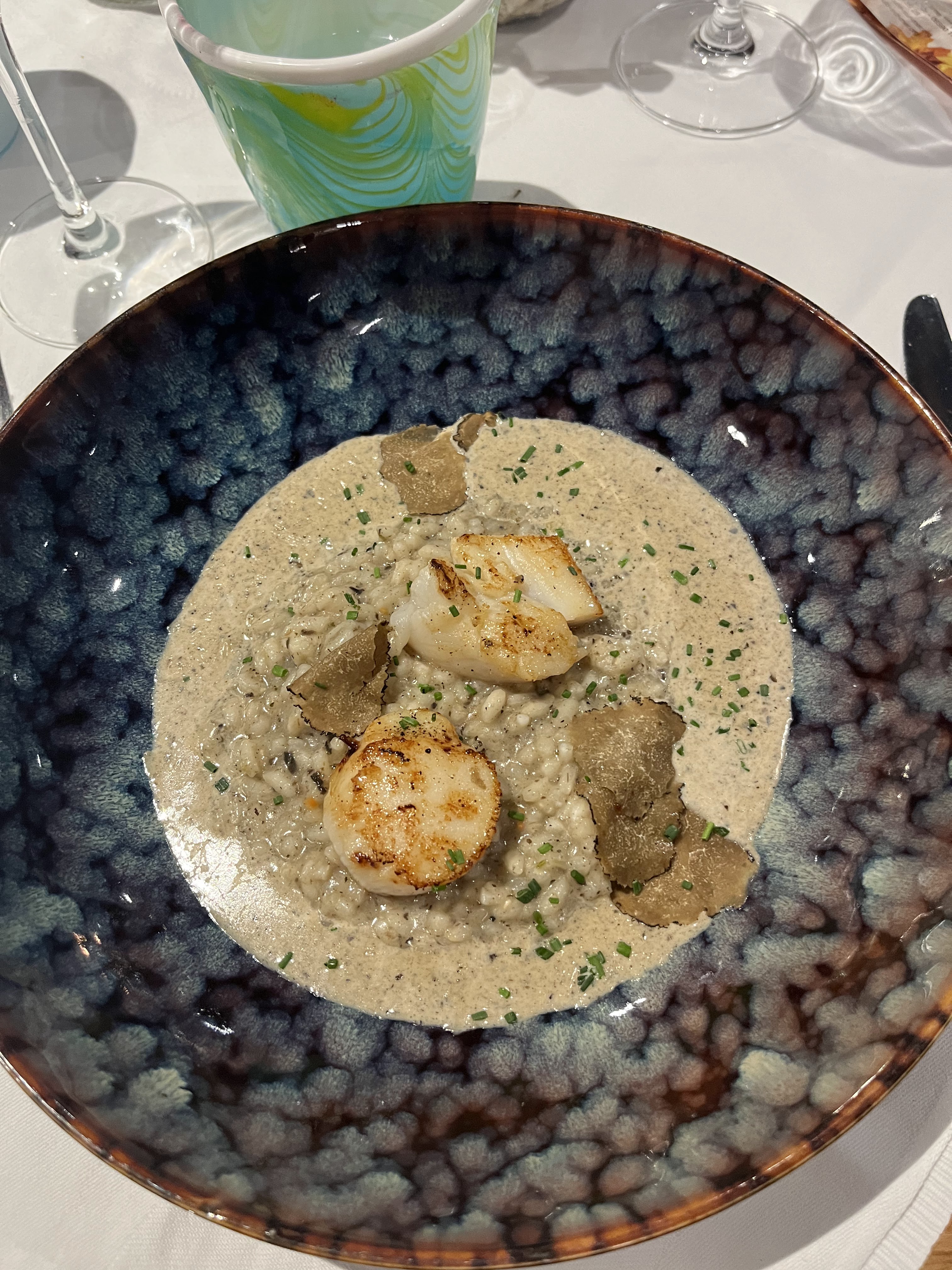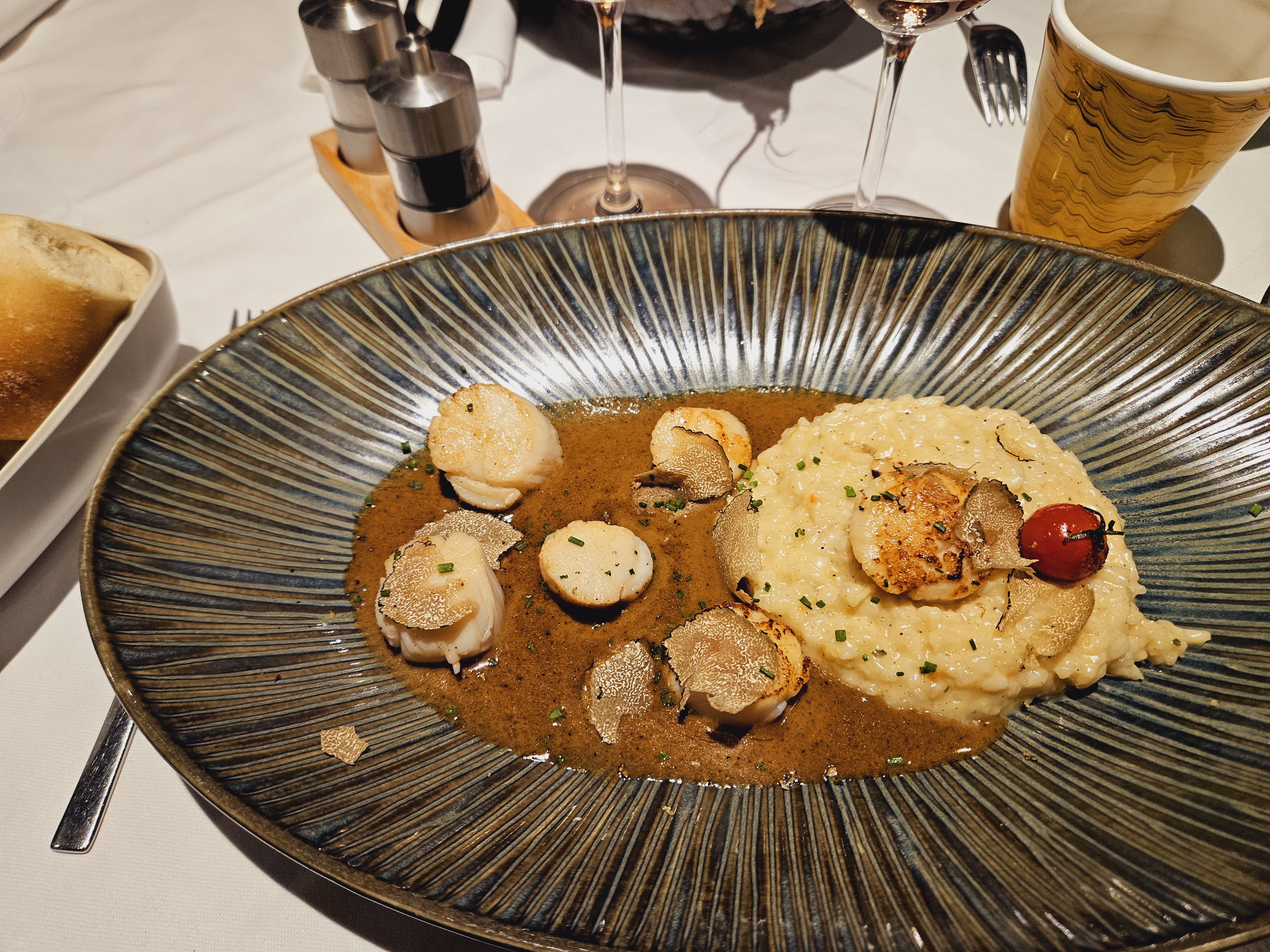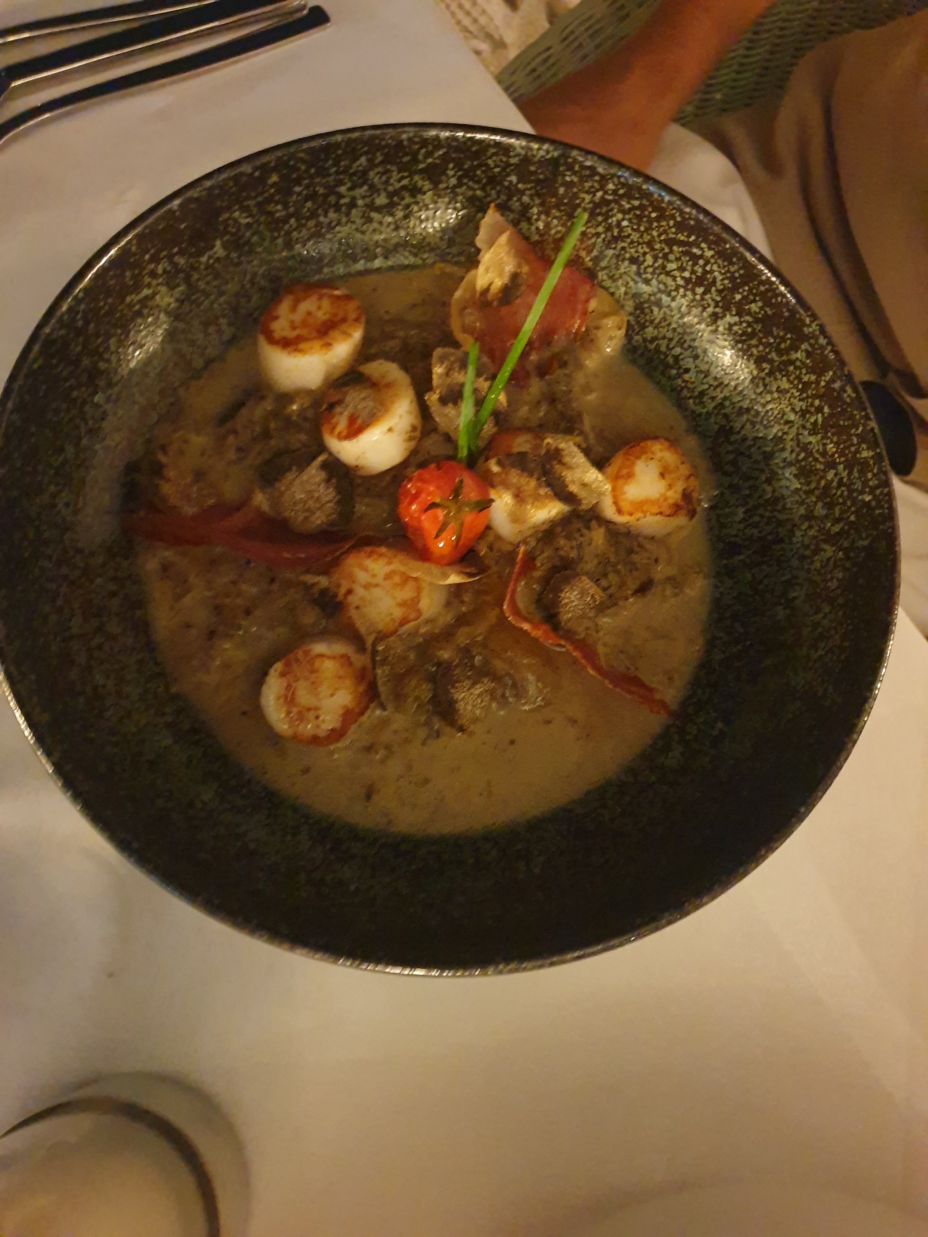 Toujours très bon, très fin et recherché ! Tataki de thon, queues de crevettes, noix de saint Jacques sur lit d'indices -speck et truffes ! Dessert : voir photo😋