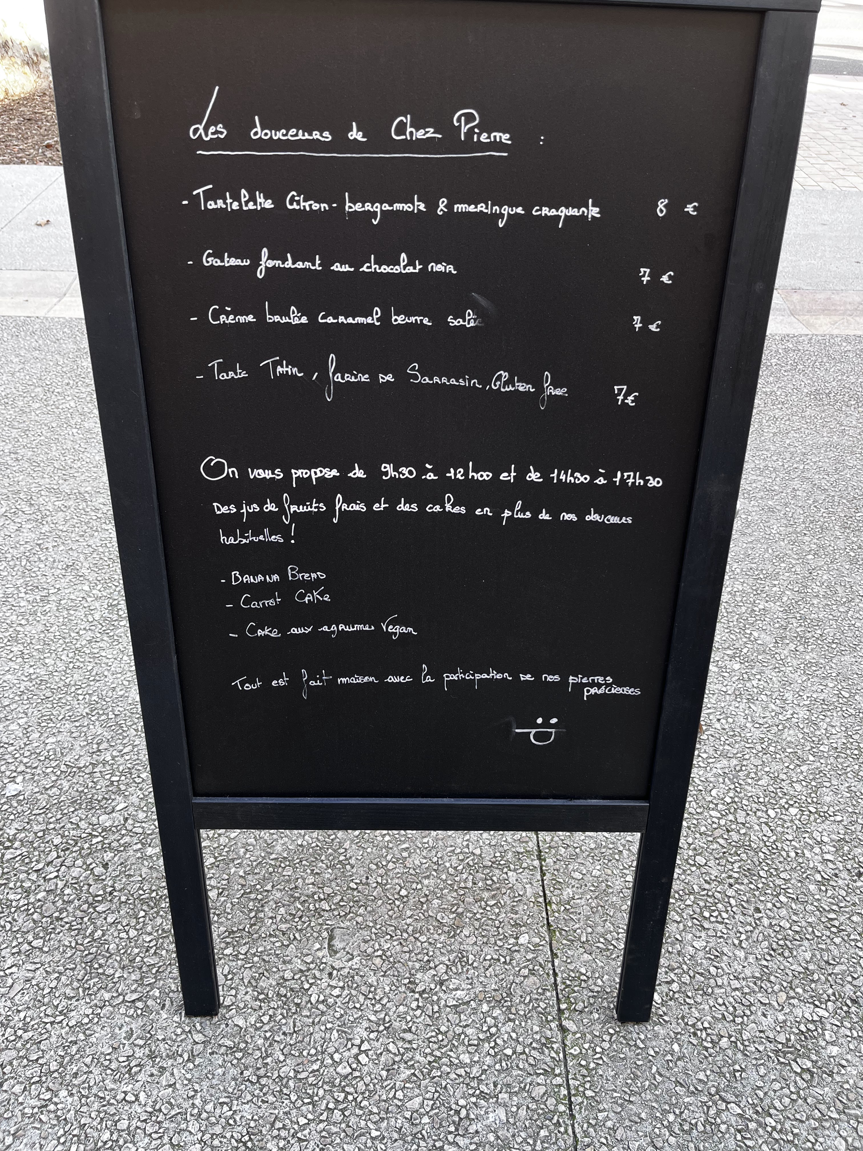 « Chez Pierre » est un super projet, un restaurant où on se sent bien (jolie déco et ambiance familiale) et où on mange bien. 3 plats à la carte : 1 viande ou 1 poisson ou 1 plat végé, de quoi satisfaire tout le monde ! 2 choix d’entrées également et plusieurs choix de desserts ! Pour être venue il y a plusieurs semaines ou mois, le menu était différent donc ça permet de varier d’une fois à l’autre. Enfin un grand bravo à Laurène d’avoir géré notre table de 10 :)