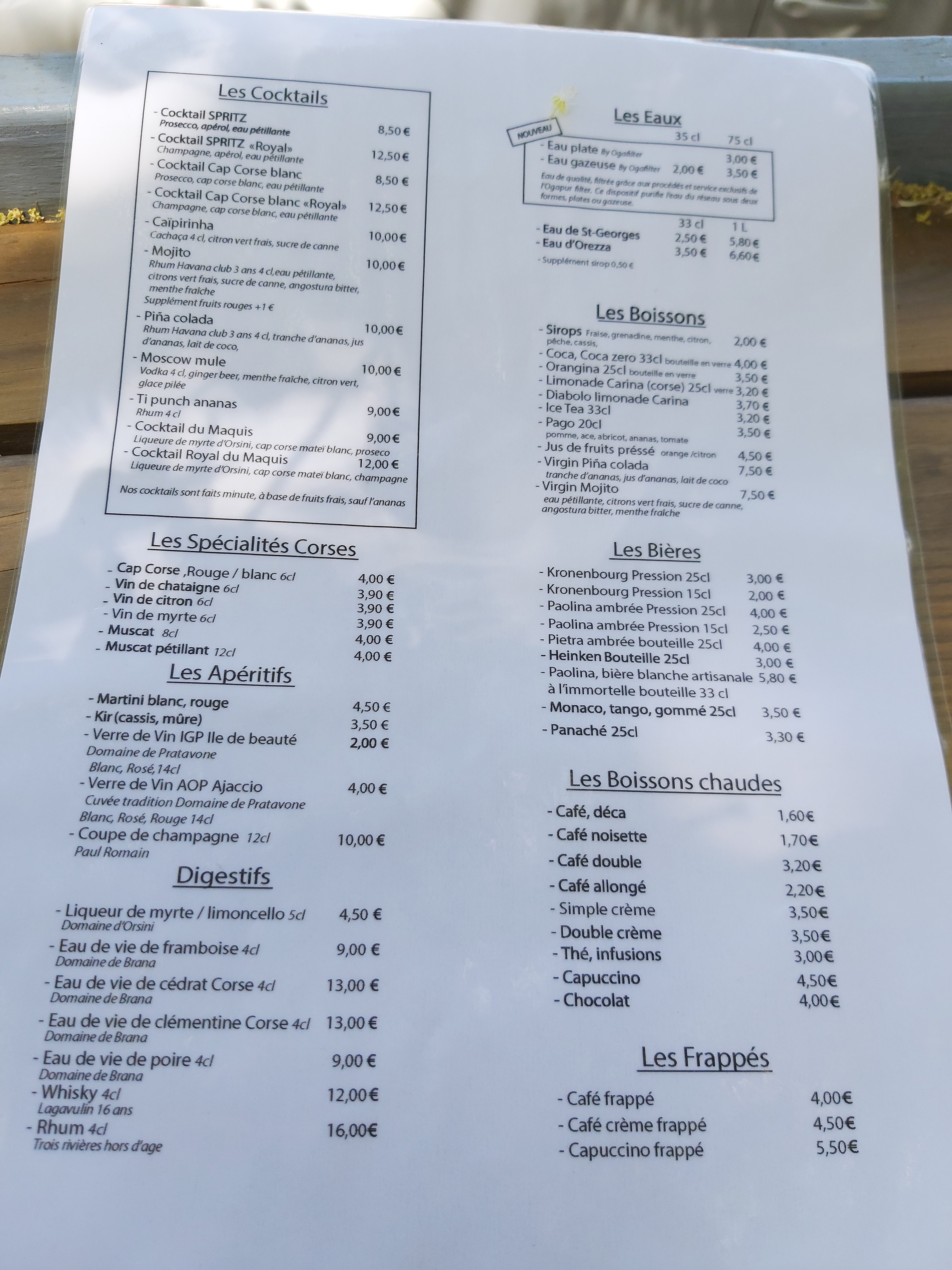 Il est préférable de réserver , idéalement placé en bord de mer Nous avons testé la soirée « menu identique pour tous » super 👍🏻 Produits corses de qualité Desserts « maison « Accueil chaleureux et le personnel aux petits soins Merci pour cette agréable soirée À recommander