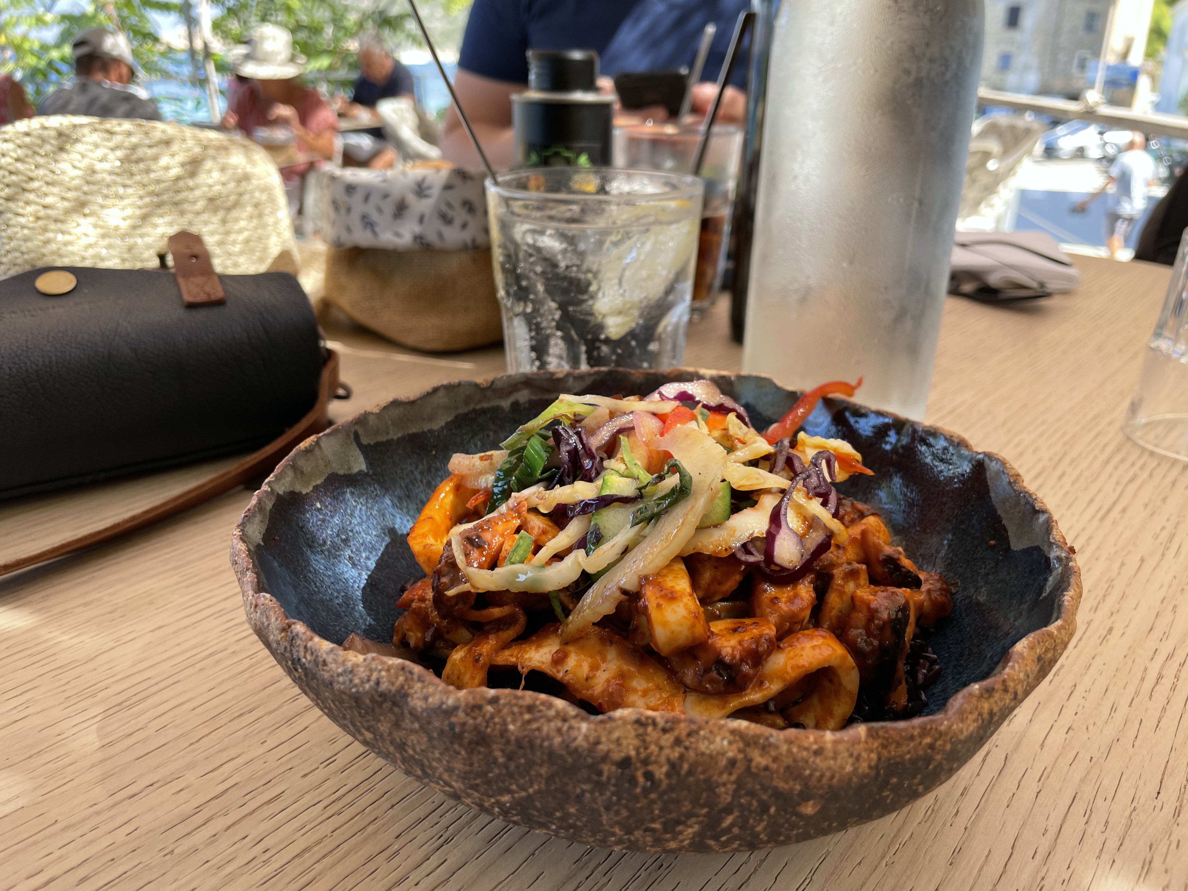 Meilleur poulpe (carrément entier) de ma vie ! Excellent ! Le thon était également d’une divinité extrême ! Miam miam miam Bravo le cuistot ! Et n’oublions pas les gambas en entrée succulentes !