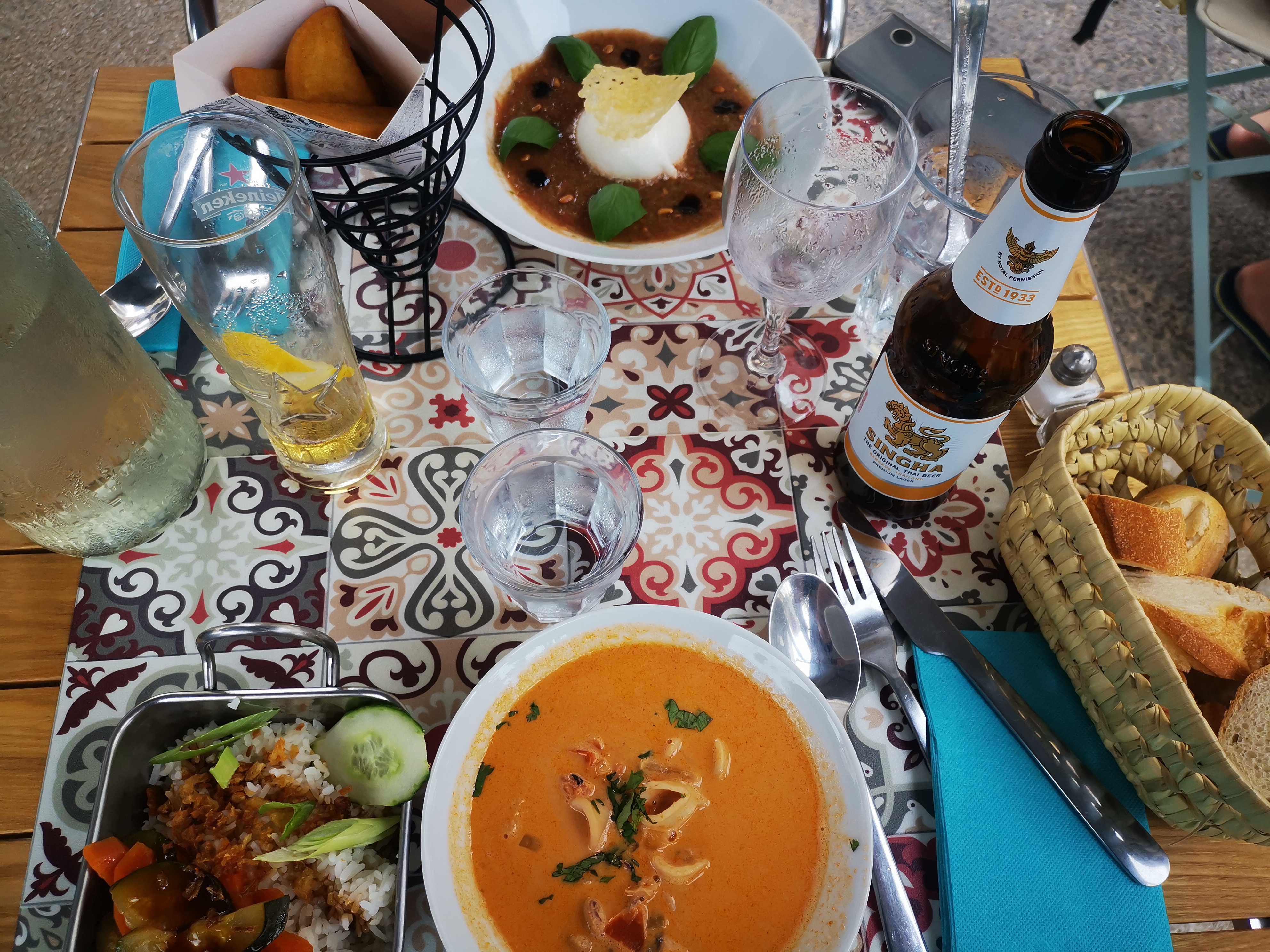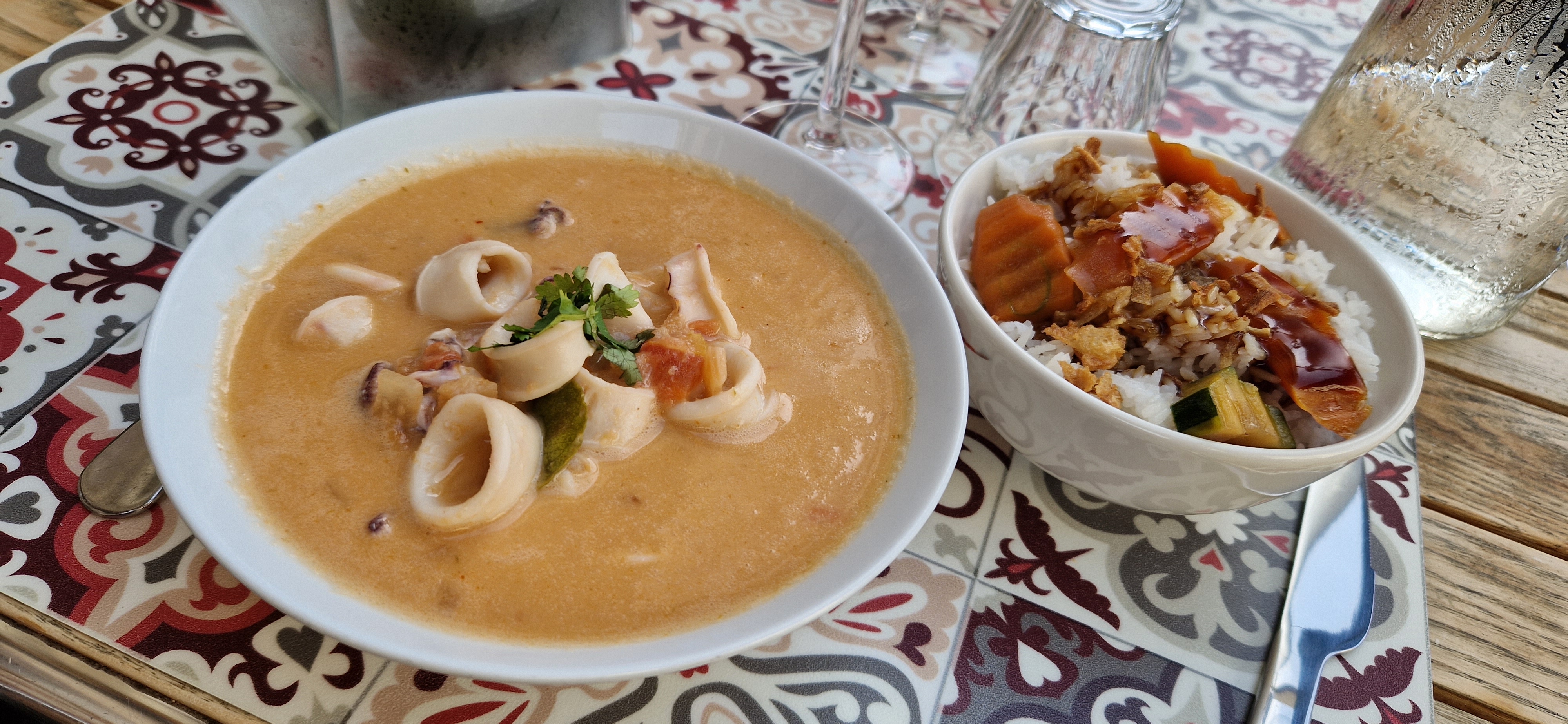 Calamar à la thaï avec riz blanc et légumes décoratif Bon mais très cher plat à 20 euros Plat qui ne nous à pas rassasié Voir photo du plat en question Quelques patates sèches dans un bol pour un petit enfant payé 5 euros... Execcivement cher Boissons à 4,50 l'unité Rapport qualité prix à revoir Personnel agréable Je reste déçu du repas car je m'attendais à mieux , vue les évaluations positives