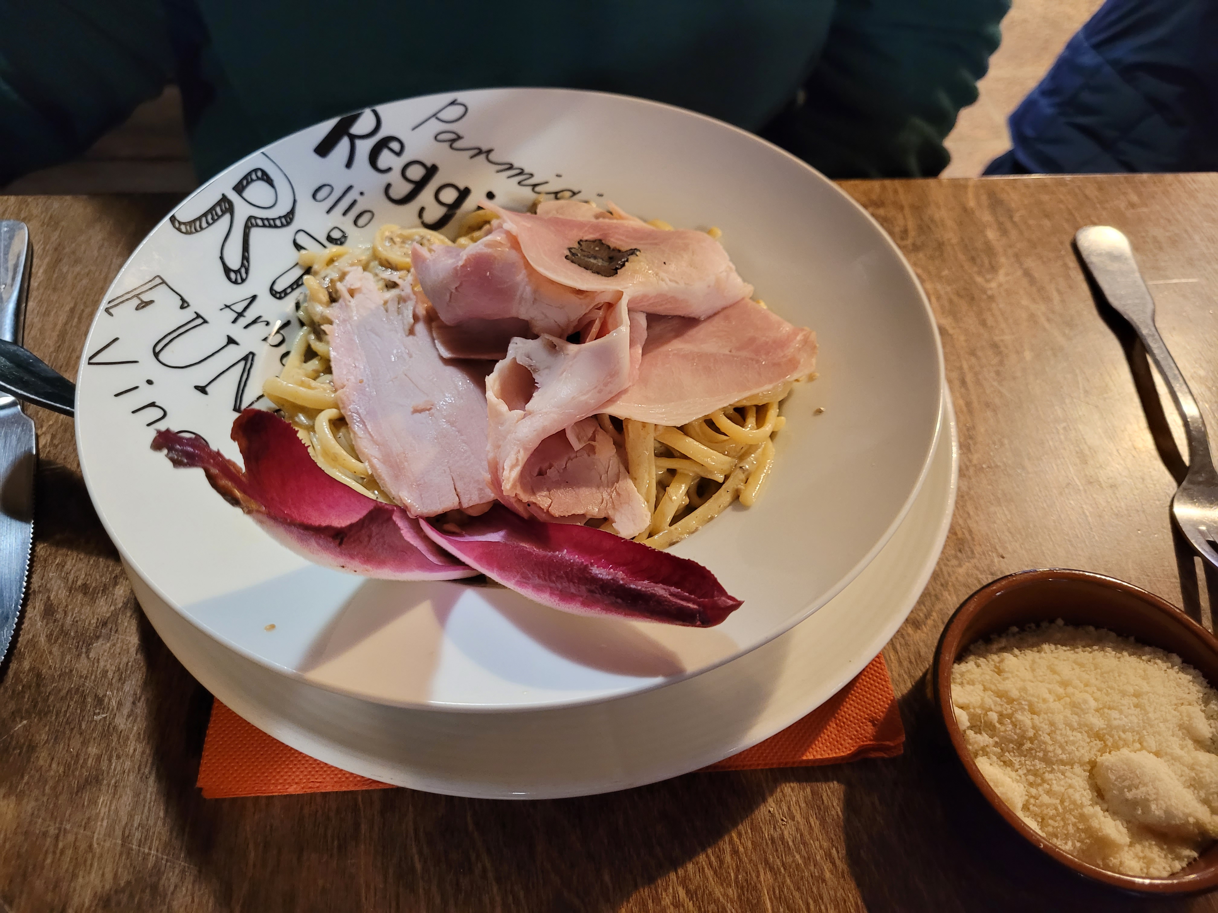 Les pâtes sont délicieuses et copieuses Nous avons pris une tarte normande excellente Service attentionné et rapide Juste dommage pour les enfants le menu ne comporte pas de boisson ni de légumes