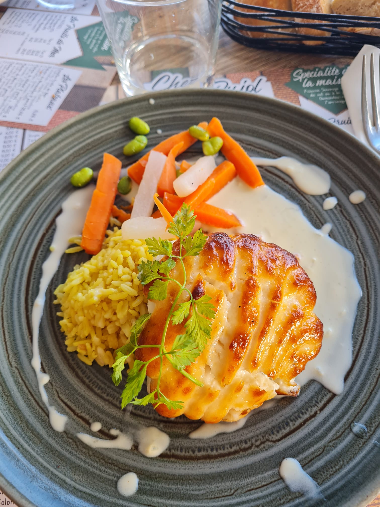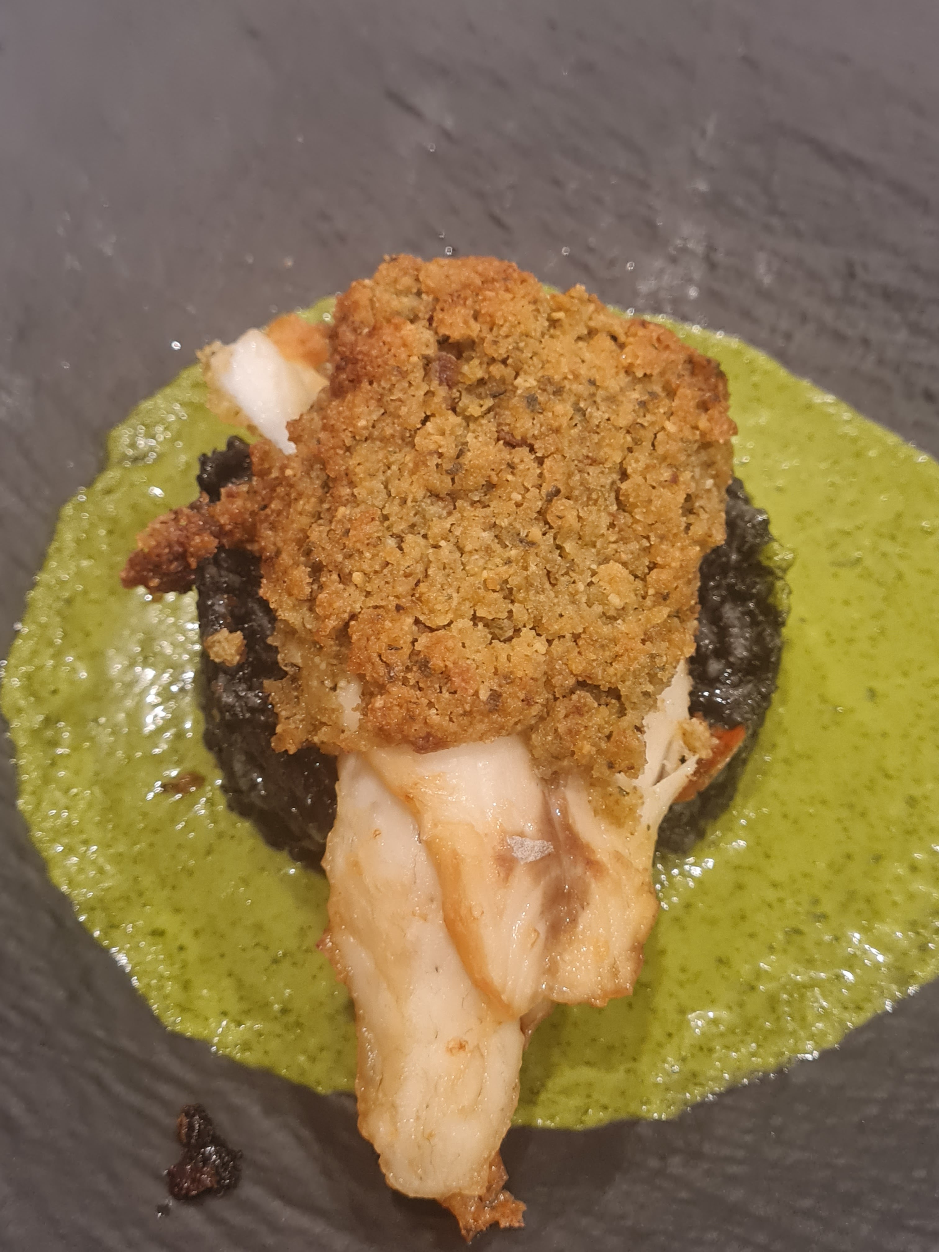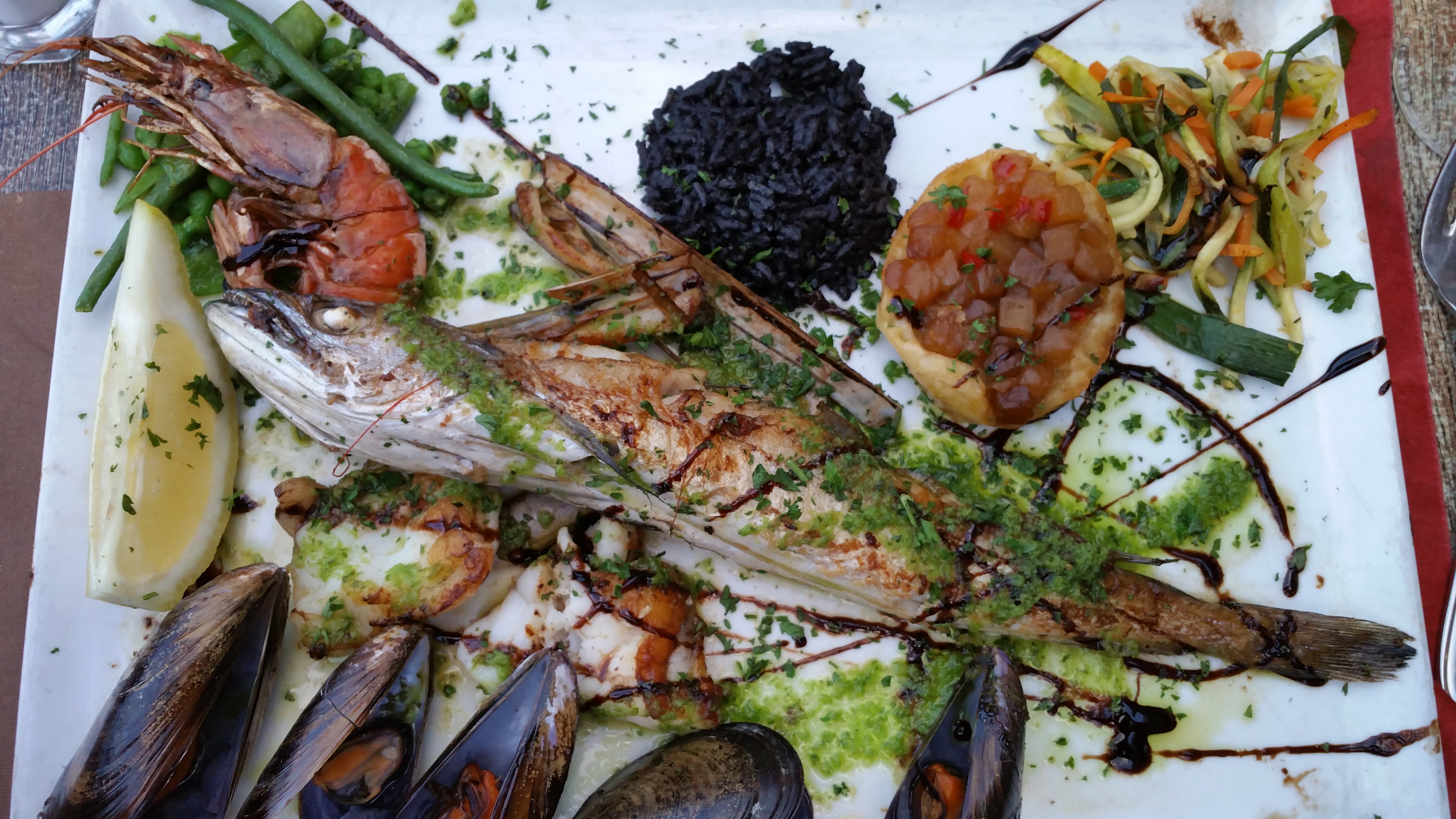 Nous avons été bien accueillis et surtout bien conseillé sur nos envies du moment, un bar en croûte de pesto avec riz à l'encre de seiche et jus aux herbes et une sole choisie sur l'étalage cuite simplement et servi avec des légumes croquant accompagné à côté d'une sauce au beurre