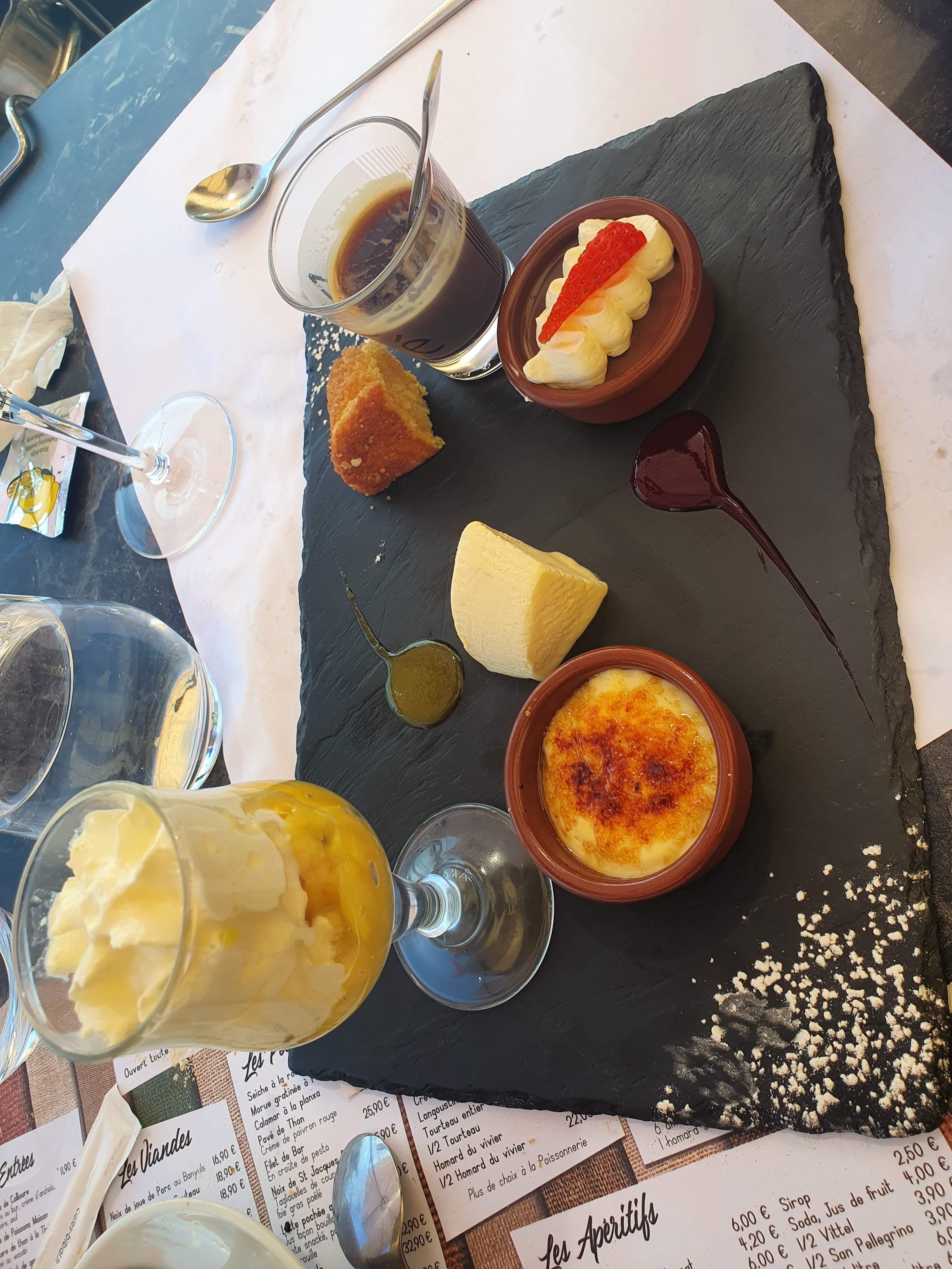Très bon plateau de fruit de mer pour 2. Crème catalane et pavlova aux fruits exotiques boule de glace noix de coco un vrai délice. Repas pris sur la terrasse face à la mer (dommage qu'il y ait la route entre les 2, mais cela un reste un très bon moment)