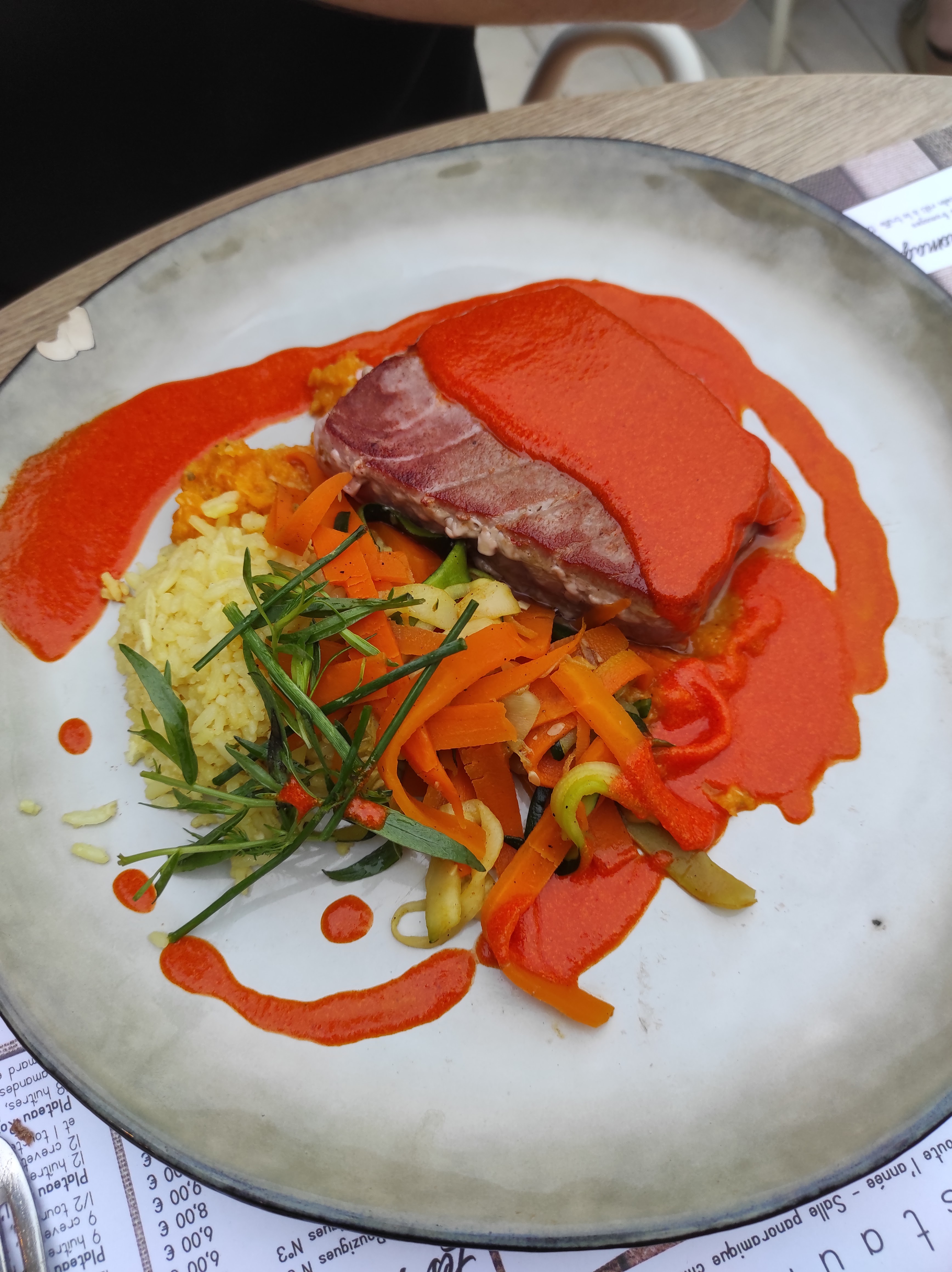 Menu déjeuner avec tataki de thon frais et gambas au pesto Dîner avec assiette de la mer et assiette de tapas Très bonne carte des vins Très bon, frais, TOP ACCUEIL TRES PRO & SOURIANT Bravo Continuez ainsi !