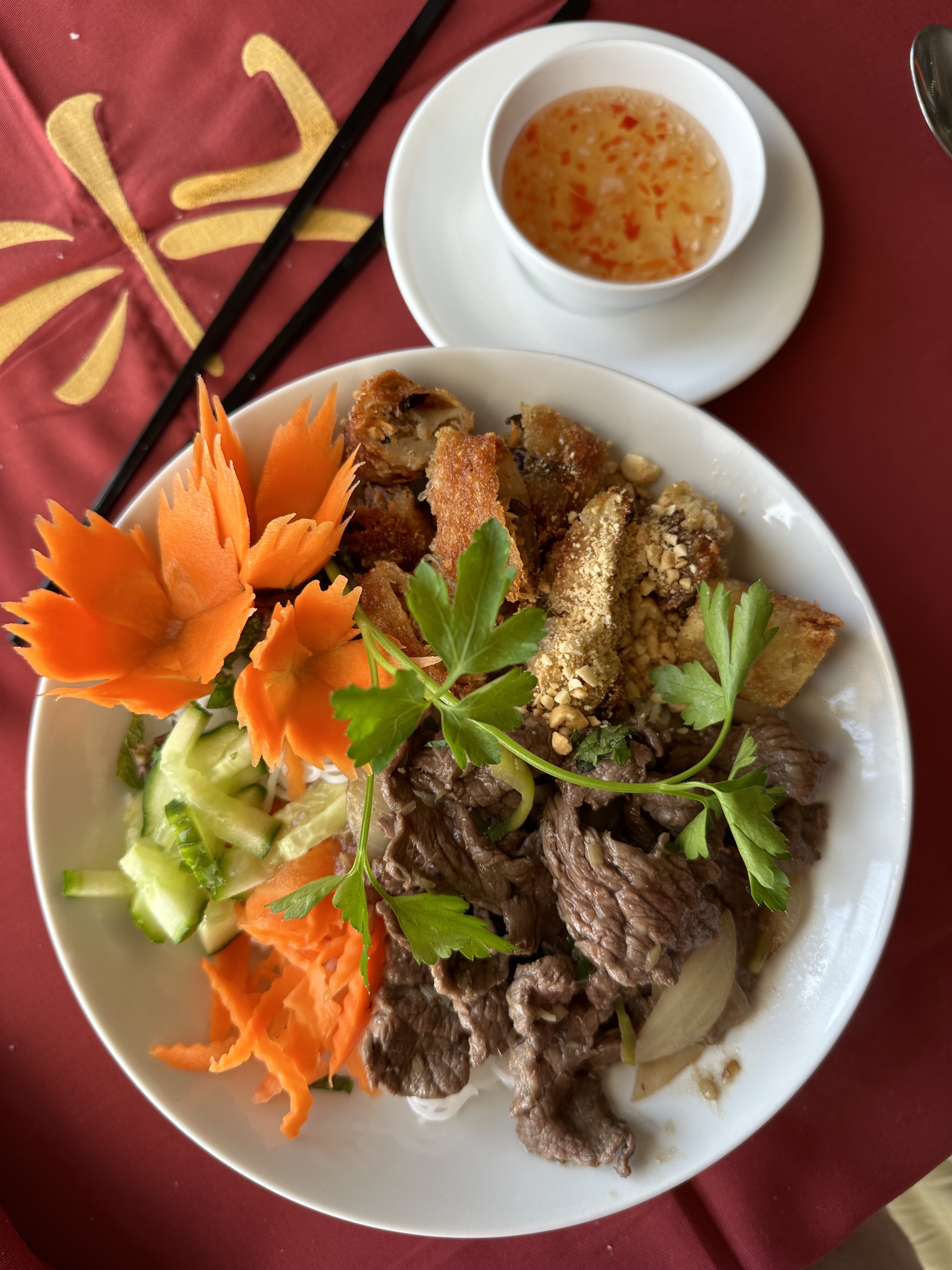 Pour ce qui est de la soupe et du bœuf saté mon mari a trouvé les deux très bons mais pour moi un assortiment de beignets et nems’ Vraiment trop gras et pas excellents. Les nems étaient noirs à l’extérieur comme si l’huile de friture n’était pas propre. Dans la nuit j’ai eu des maux d’estomac et des vomissements. Ce matin après un jus de citron pour nettoyer tout ça je suis encore un peu nauséeuse. Surveillez donc vos bains d’huile.