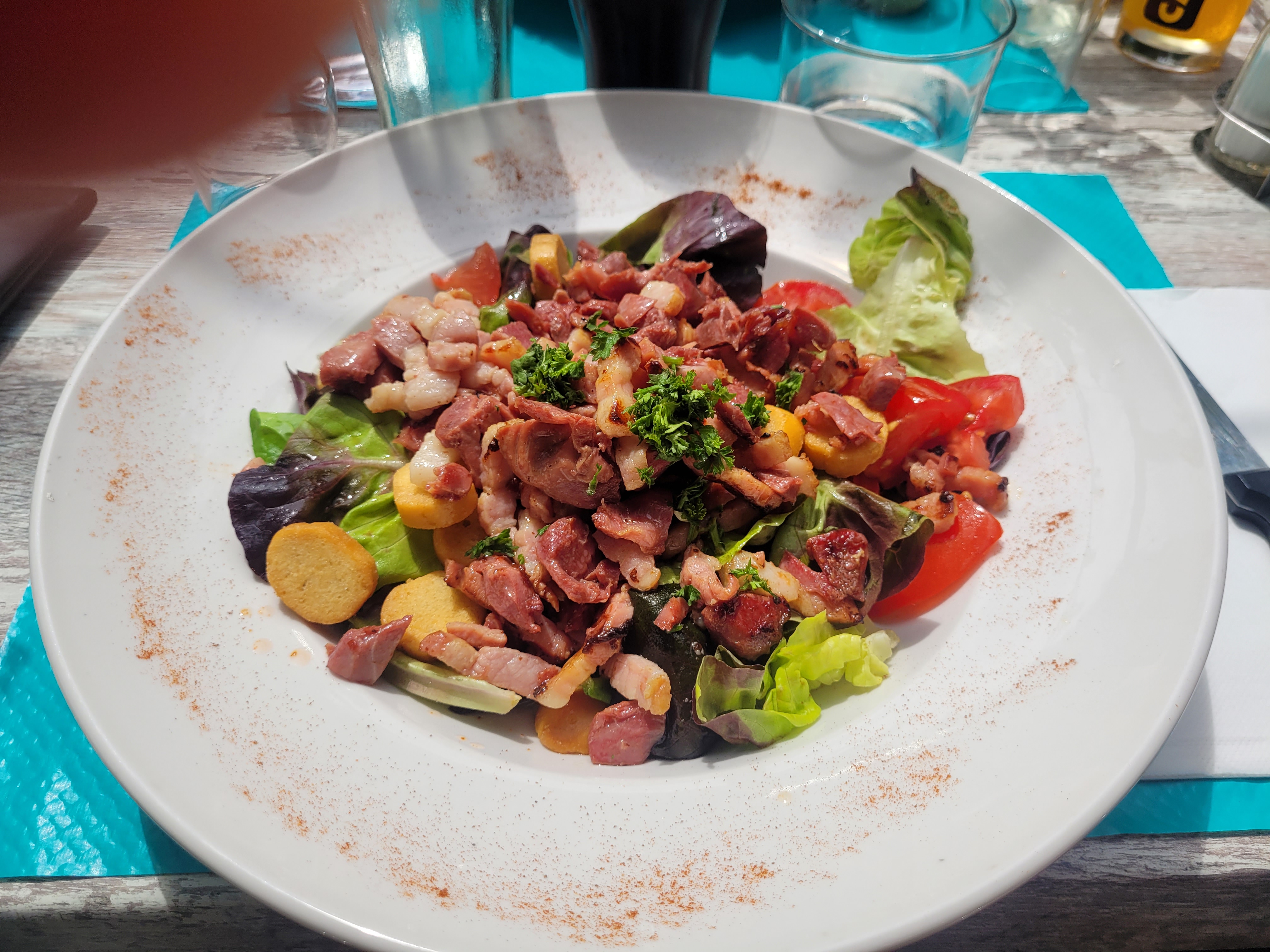 La salade de tomates sans vinaigrette... On a l impression que le confit est cuit à la friteuse... L andouilette de Monsieur n était qu à peine cuite... Faut demander pour avoir de l eau ou du pain... Je ne recommande pas !!