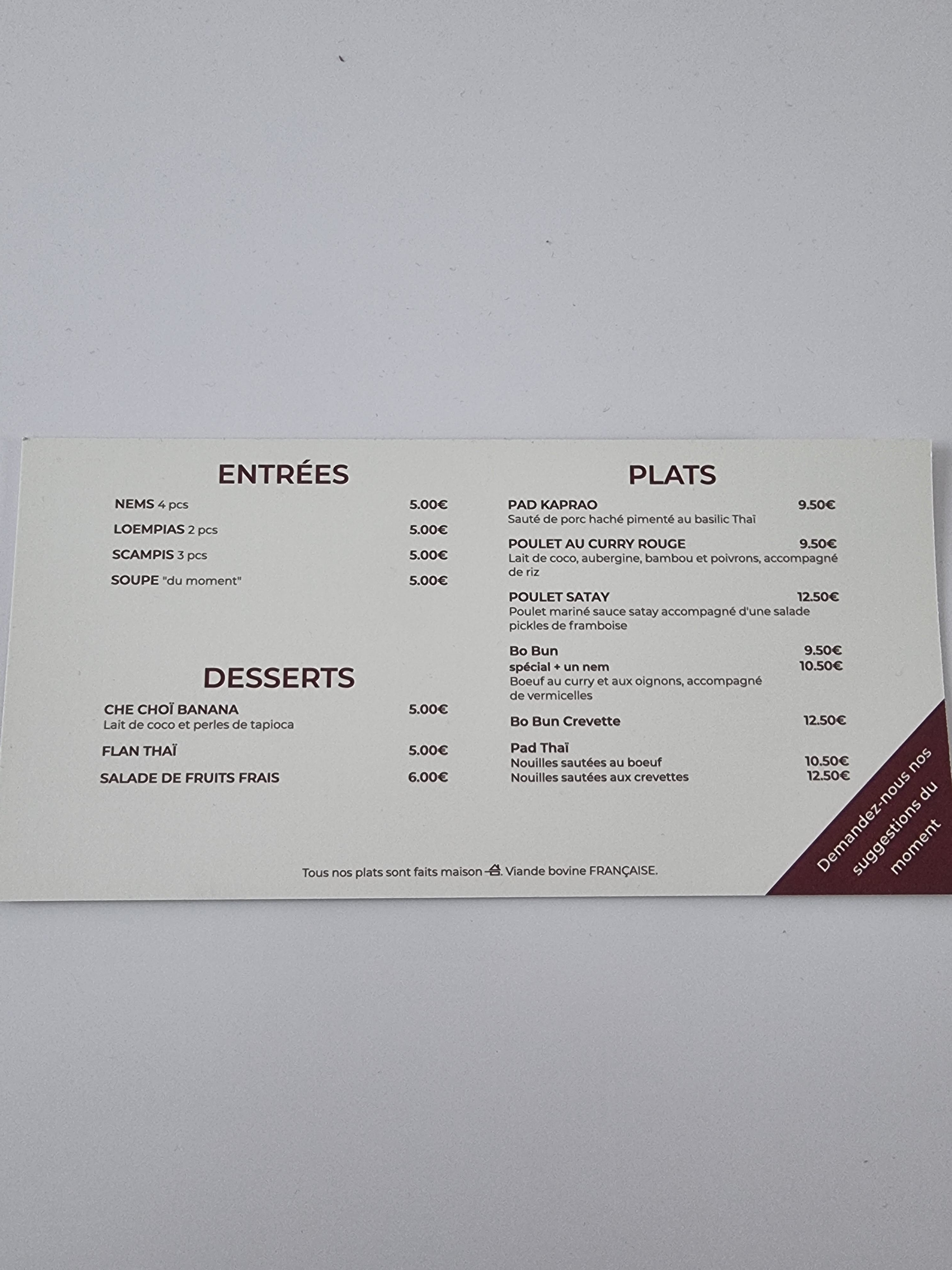 Personnel très accueillant et très bon rapport qualité prix. On retrouve vraiment les saveurs thaïlandaise dans les plats. Le restaurant est bien situé avec une belle décoration. Je recommande sans hésitation.