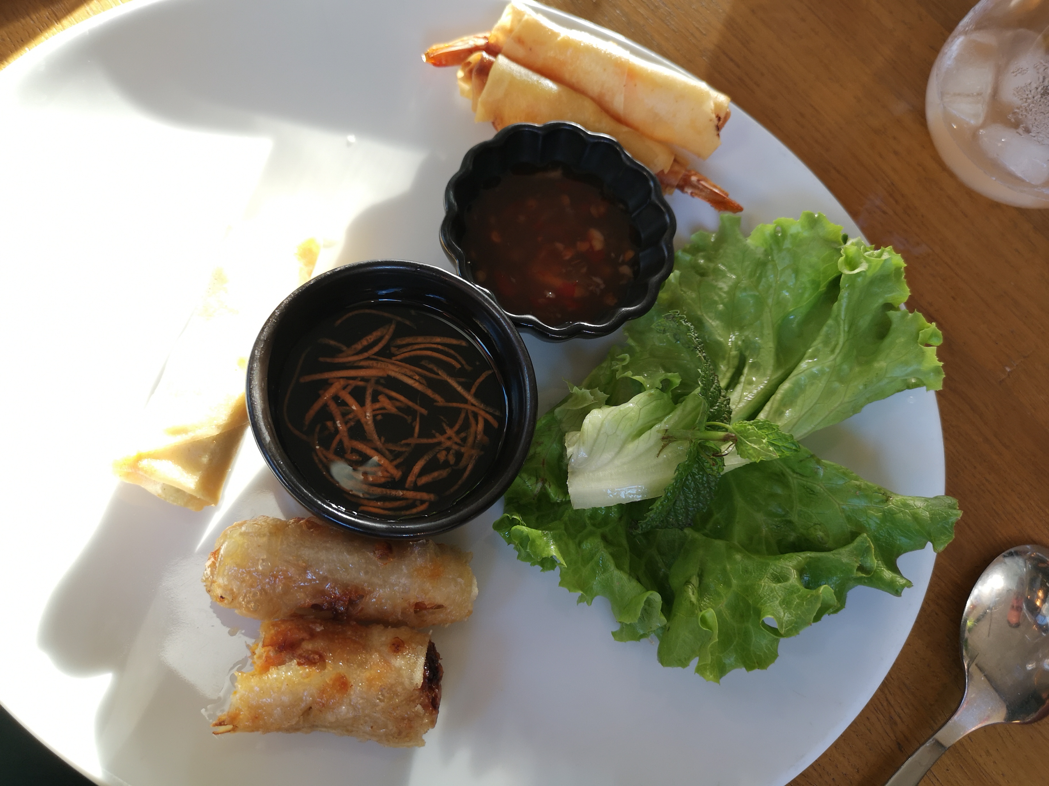 Plats frais et delicieux. Mentions spéciales pour la soupe coco légumes et le dessert lait de coco tapioca banane