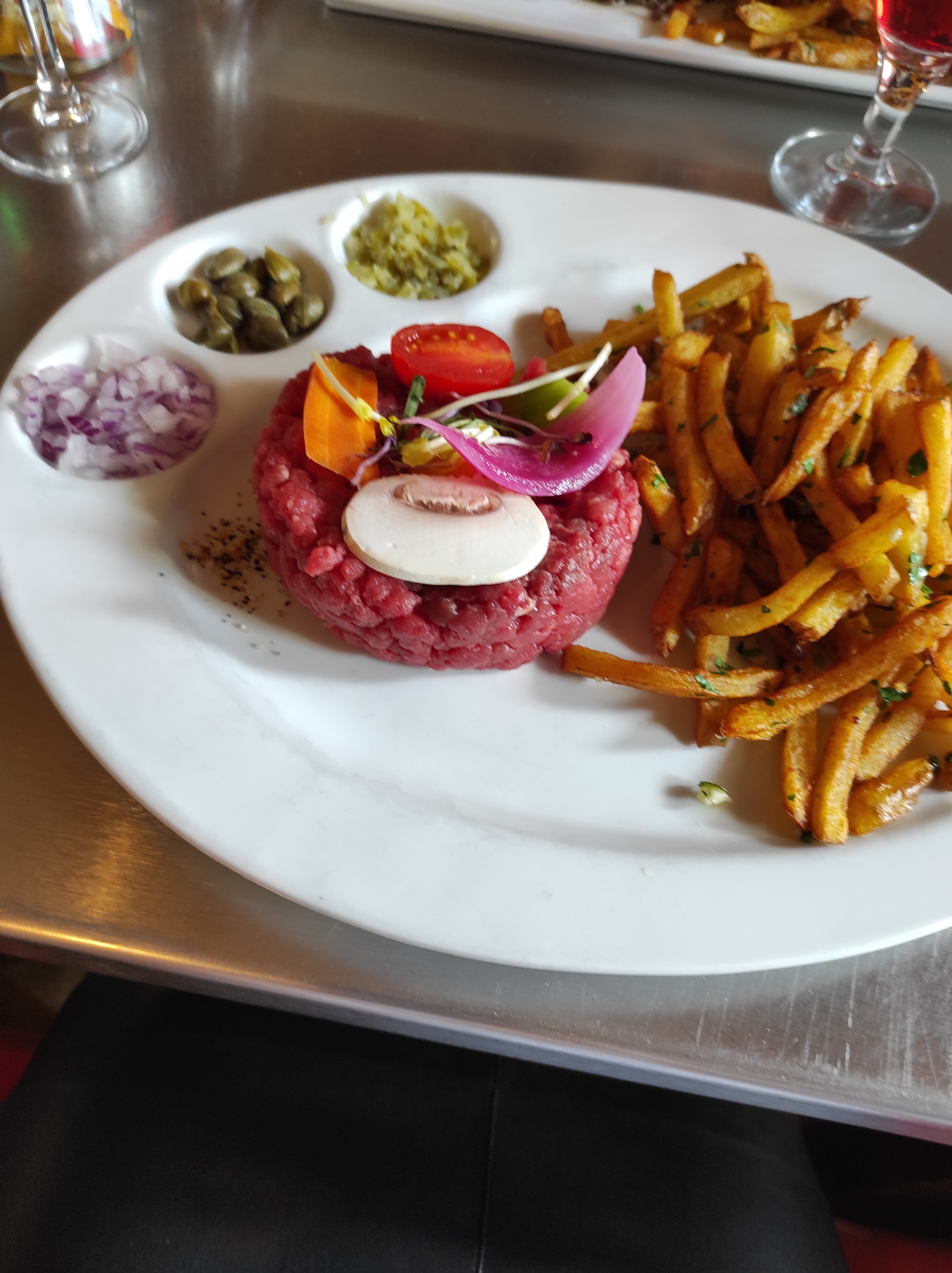 Je suis arrivé emballé par la carte . Amoureux de bonne viande , j'avoue ne pas avoir été déçu . La qualité , la cuisson au rendez-vous . Par contre , une belle assiette certe , mais la viande d'un côté les frites de l'autre banalement posé m'a fortement étonné. Un plat a 23 euros mérite un peu plus d'attention , surtout quand regardant mes voisins le plat du jour , a 14 euros, était lui extrêmement bien présenté en comparaison , deco dressage, j'espère avoir été victime d'une inattention. Ps : ca vaut quand-même le détour.