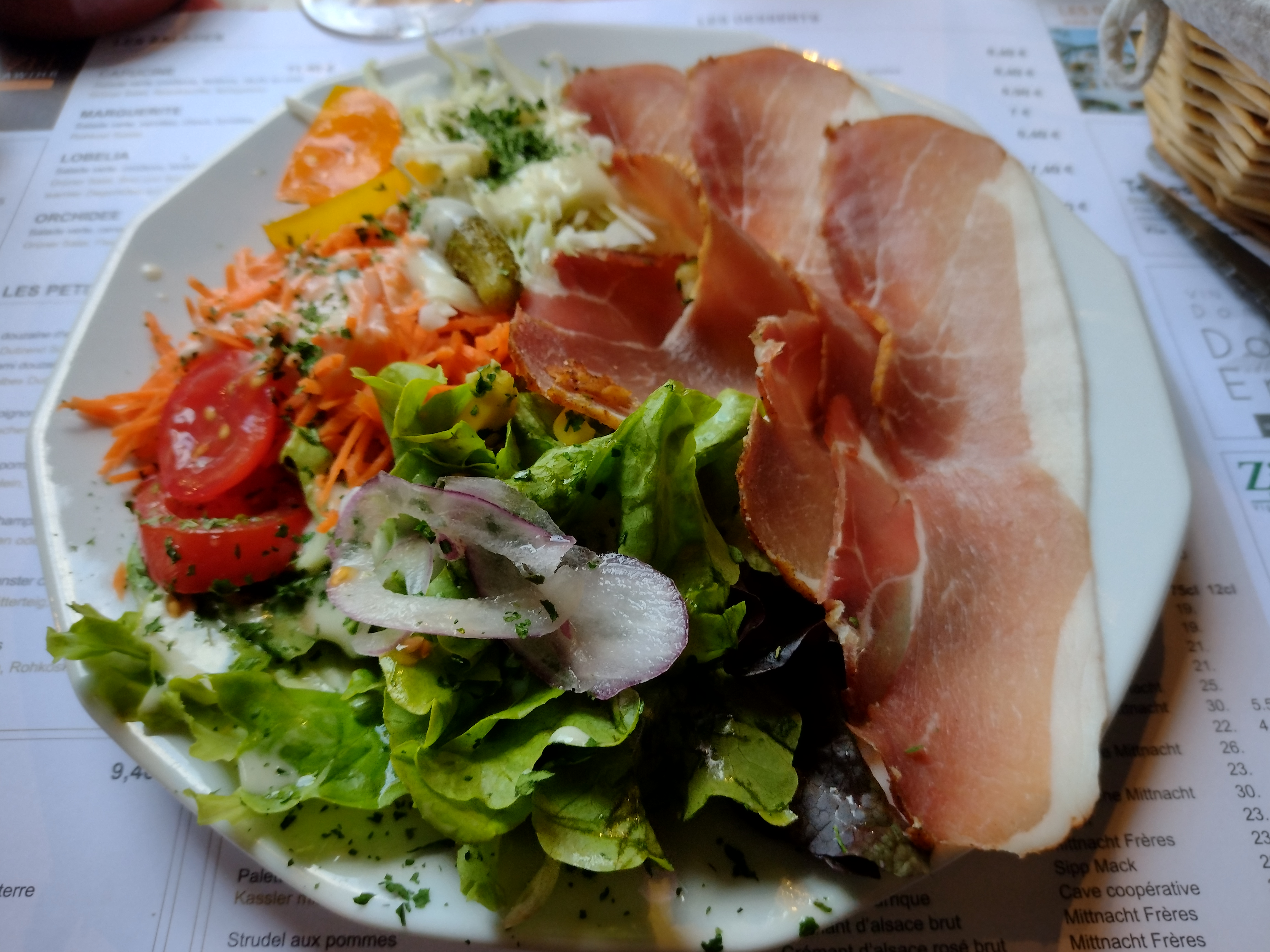 Délicieuse cuisine alsacienne. Viande Schnaka mangée avec des pommes de terre frites. C'était super savoureux. Le Riesling convenait également. Le prix du vin est peut-être un peu trop cher.
