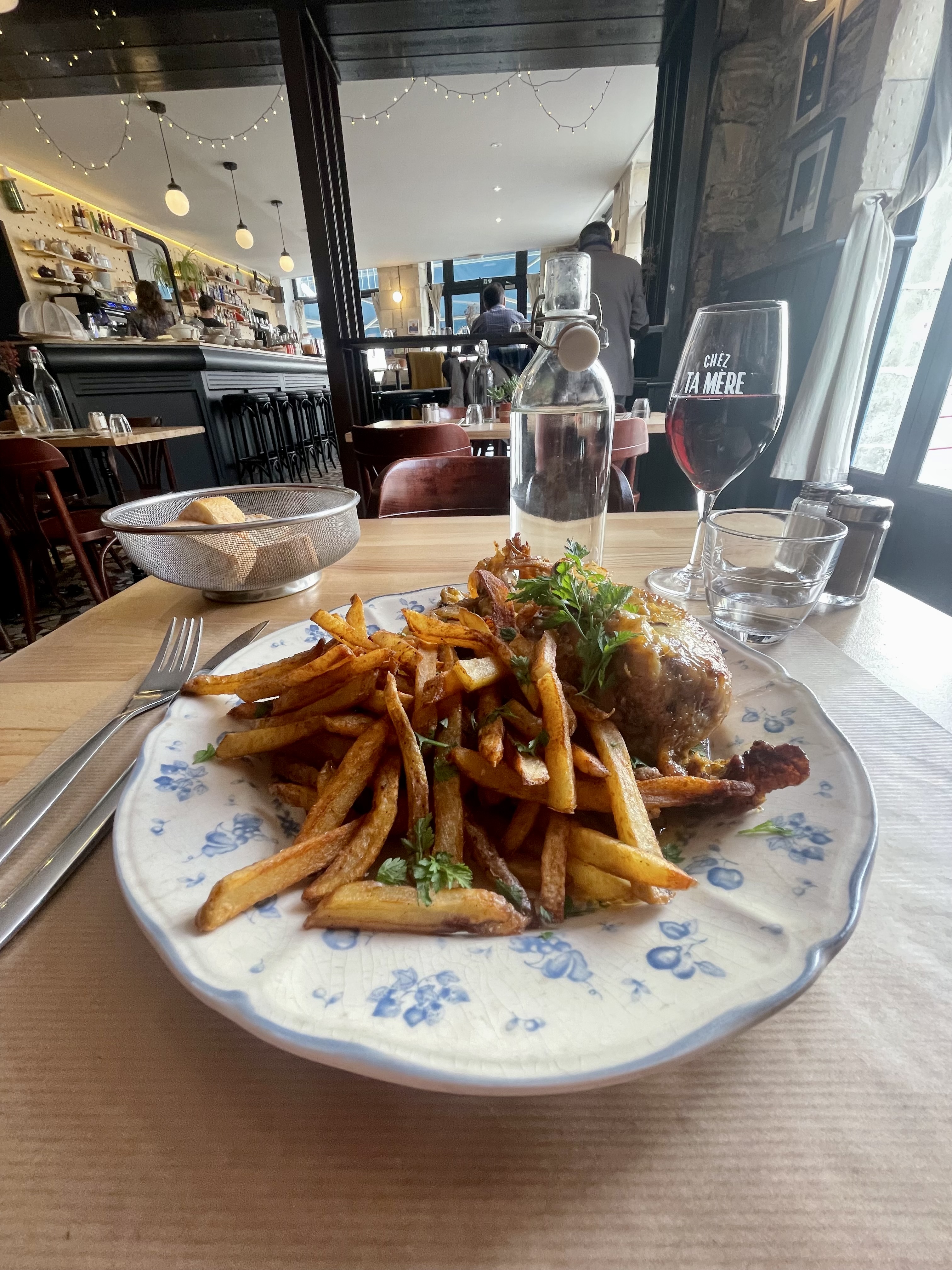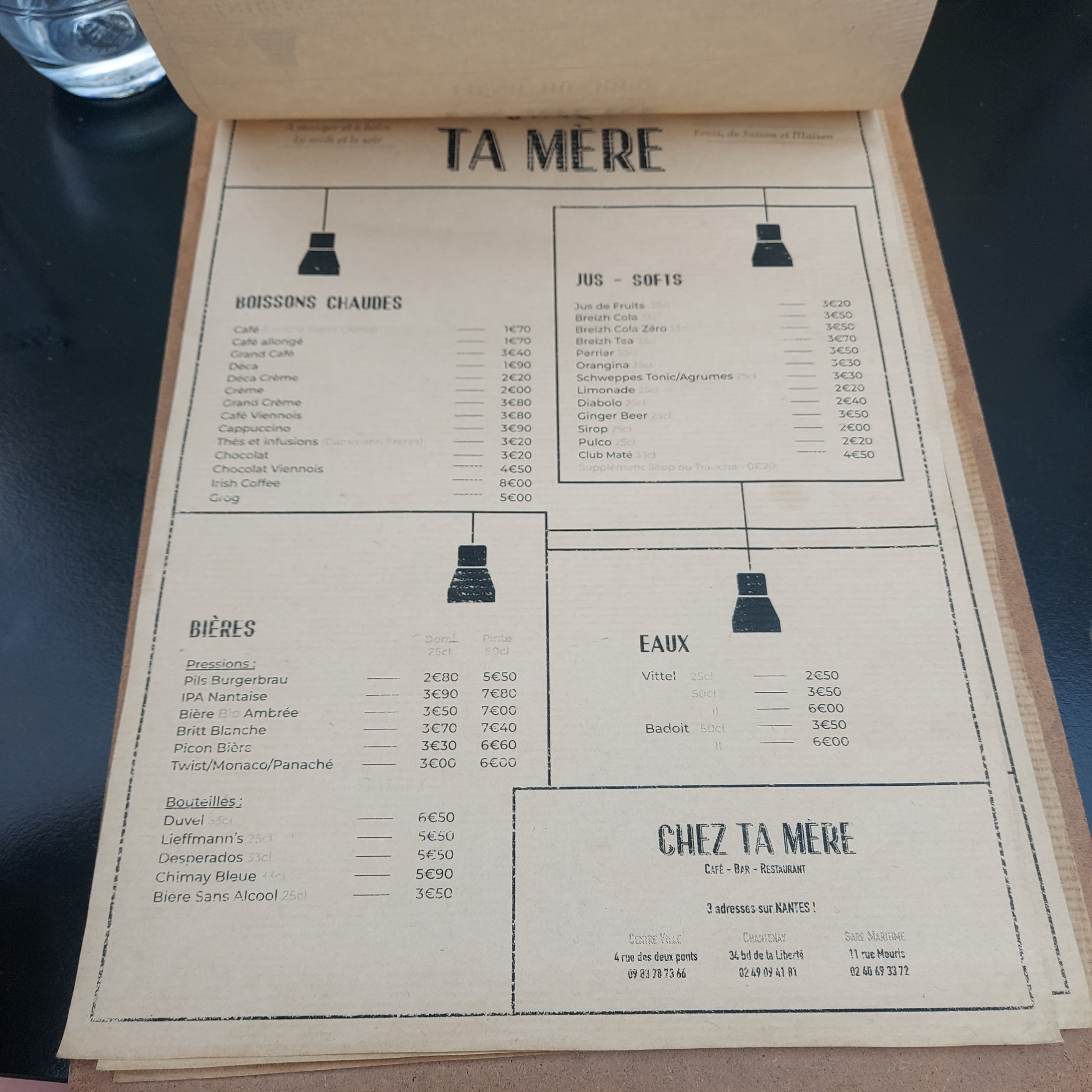 Bar et restaurant à la fois, c'est 2 salles, 2 ambiances. Plutôt festive/étudiante pour le bar et conviviale pour le resto. La déco du restaurant est simple et raccord avec le nom sans mauvais goût. L'accueil est sympathique et Chez ta mère on a appris la politesse visiblement 👌. Pour les plats..: ils sont corrects, bons.... sans casser 3 pattes à 1 canard. Les prix sont corrects. On recommande ce lieu.
