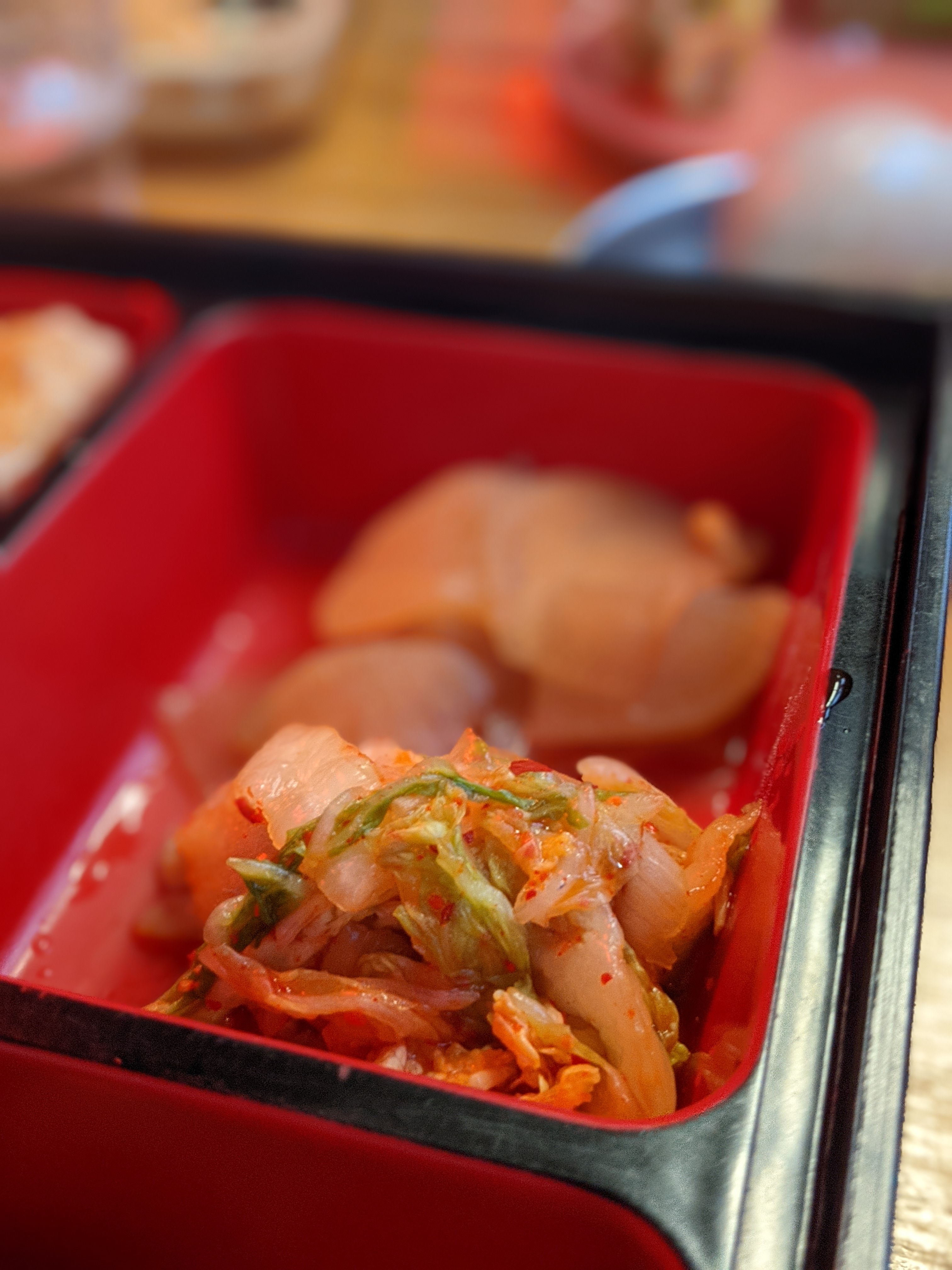 Bento karaage au très bon rapport qualité/prix. Les accompagnements, radis et choux marinés ainsi que les nouilles transparentes sont bons. Le karaage est bien croustillant avec une panure pas trop fine ni épaisse. Un ensemble bien équilibré.
