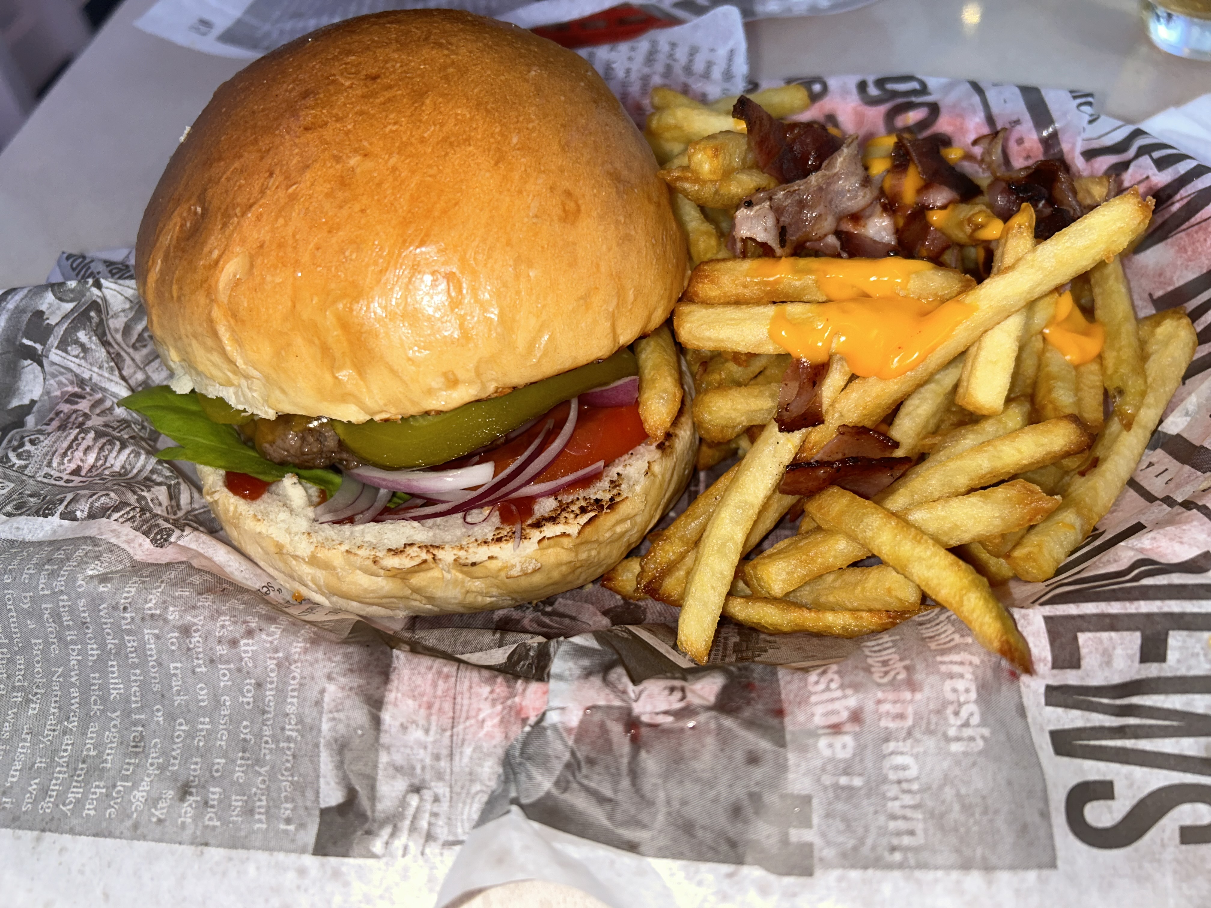 Immergé dans la culture américaine des années 80, l’expérience était très bonne. Un restaurant avec bon rapport qualité-prix, de la viande de qualité et très bien cuit, un Burger très bien équilibré, des frites maison comme ont les aimes. Et un jeune monsieur très serviable et souriant. Je recommande et j’y retournerai.