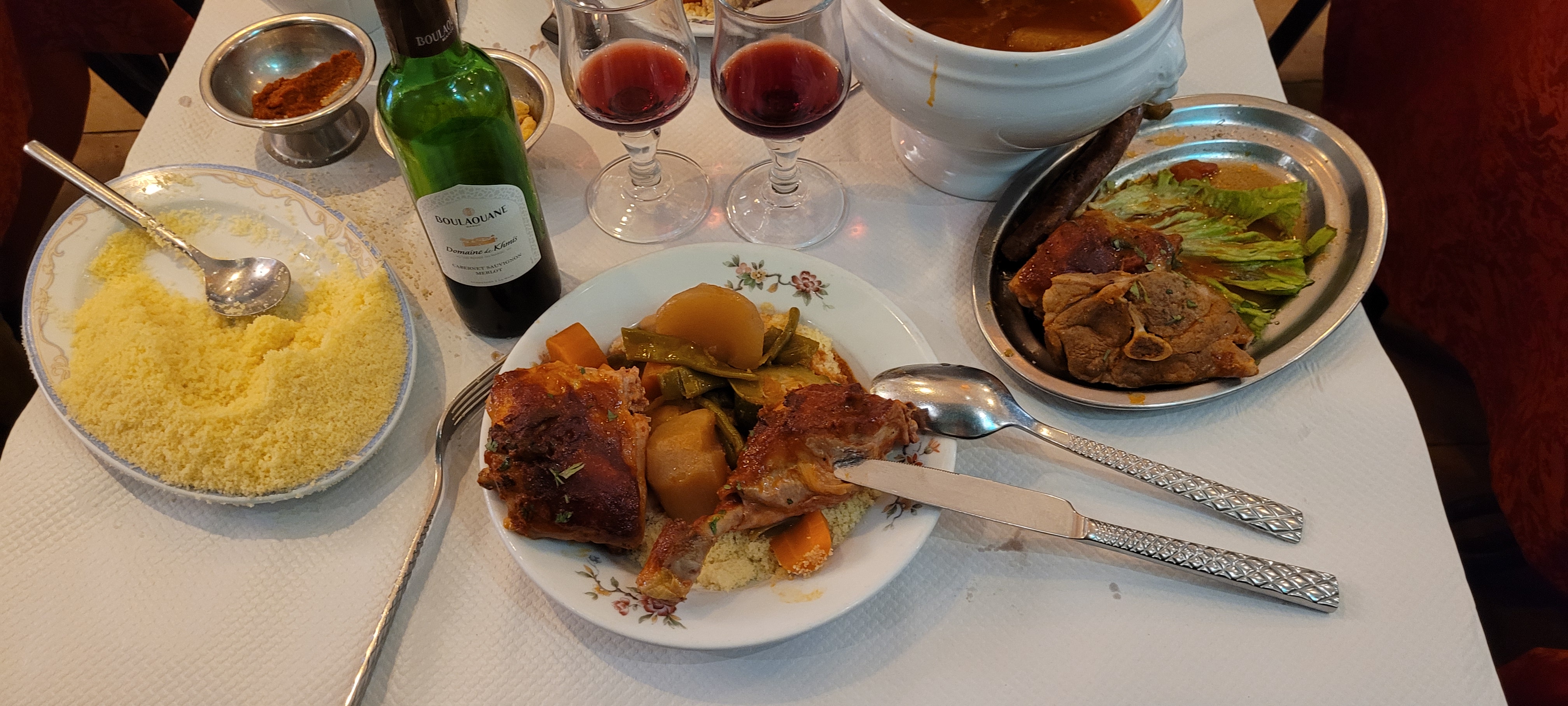 Un bon accueil, un service impeccable viennent compléter un repas très correct sans être exceptionnel ! Nous avions pris des couscous; bonne semoule, bonne viande.. un peu chiche sur les legumes (peu de variété , 2 rondelles de courgettes, 2 morceaux se carottes se battaient en duel! ), une minuscule soucoupe de pois chiches et raisins sec.. Excellentes pâtisseries.
