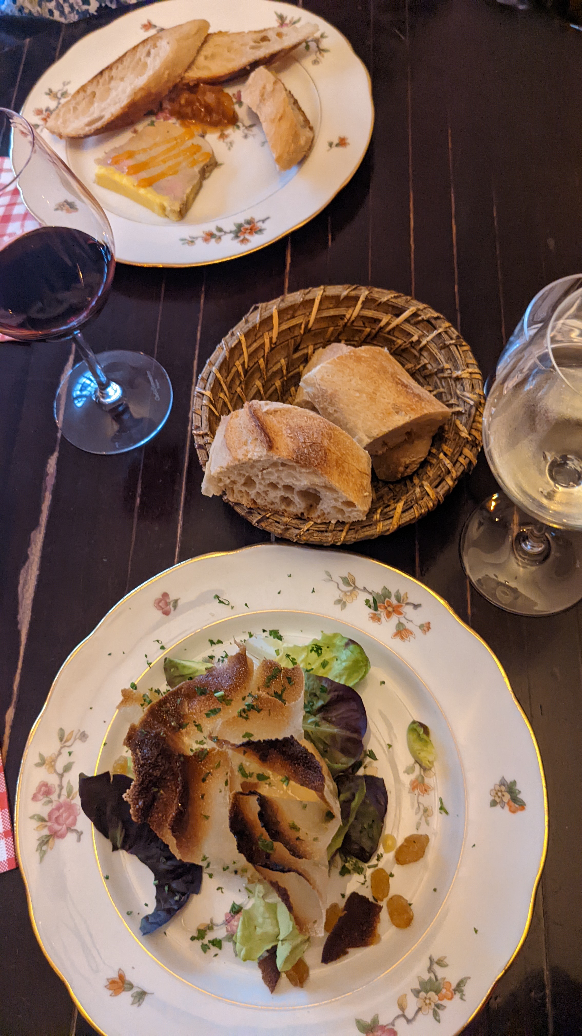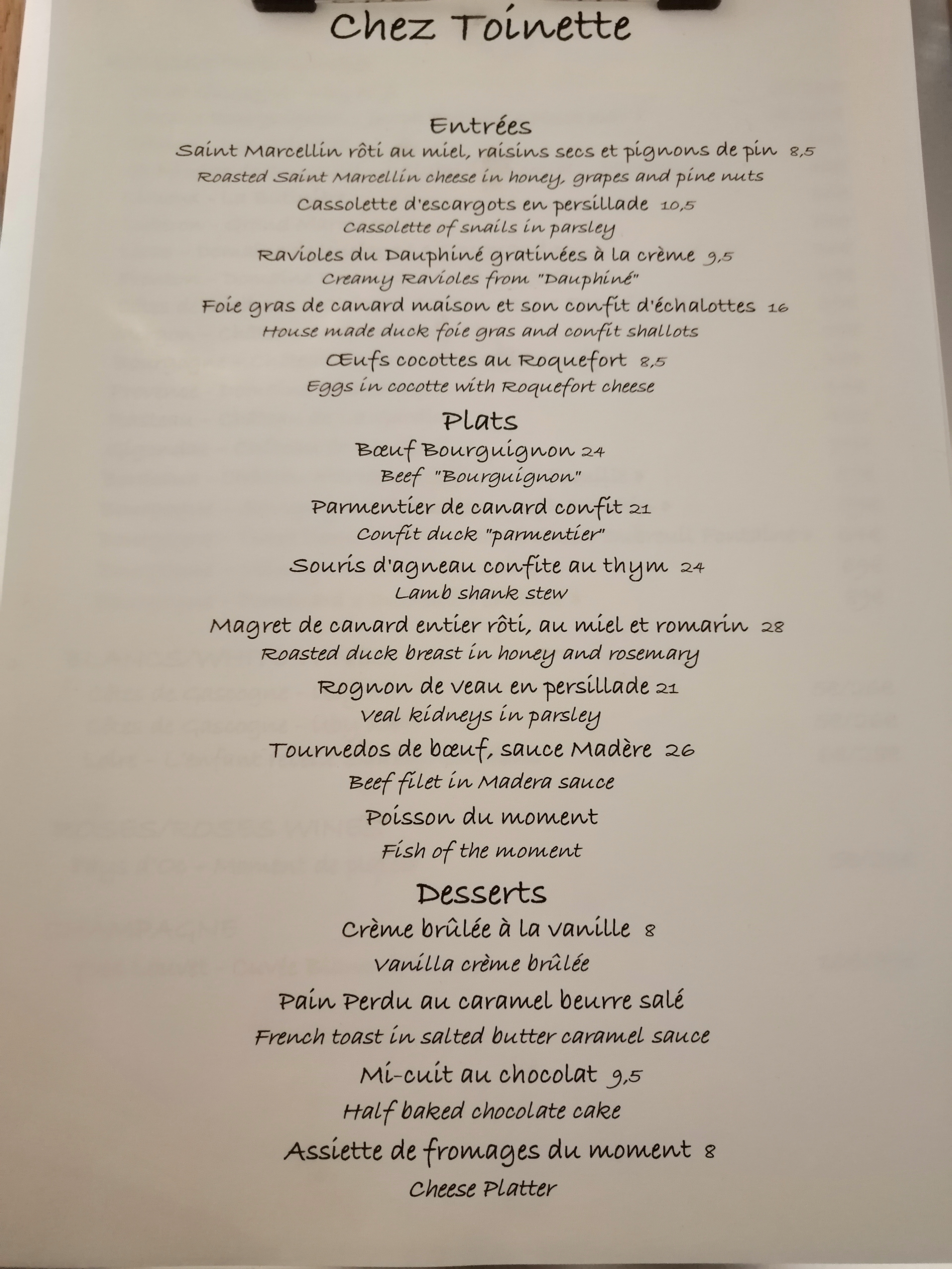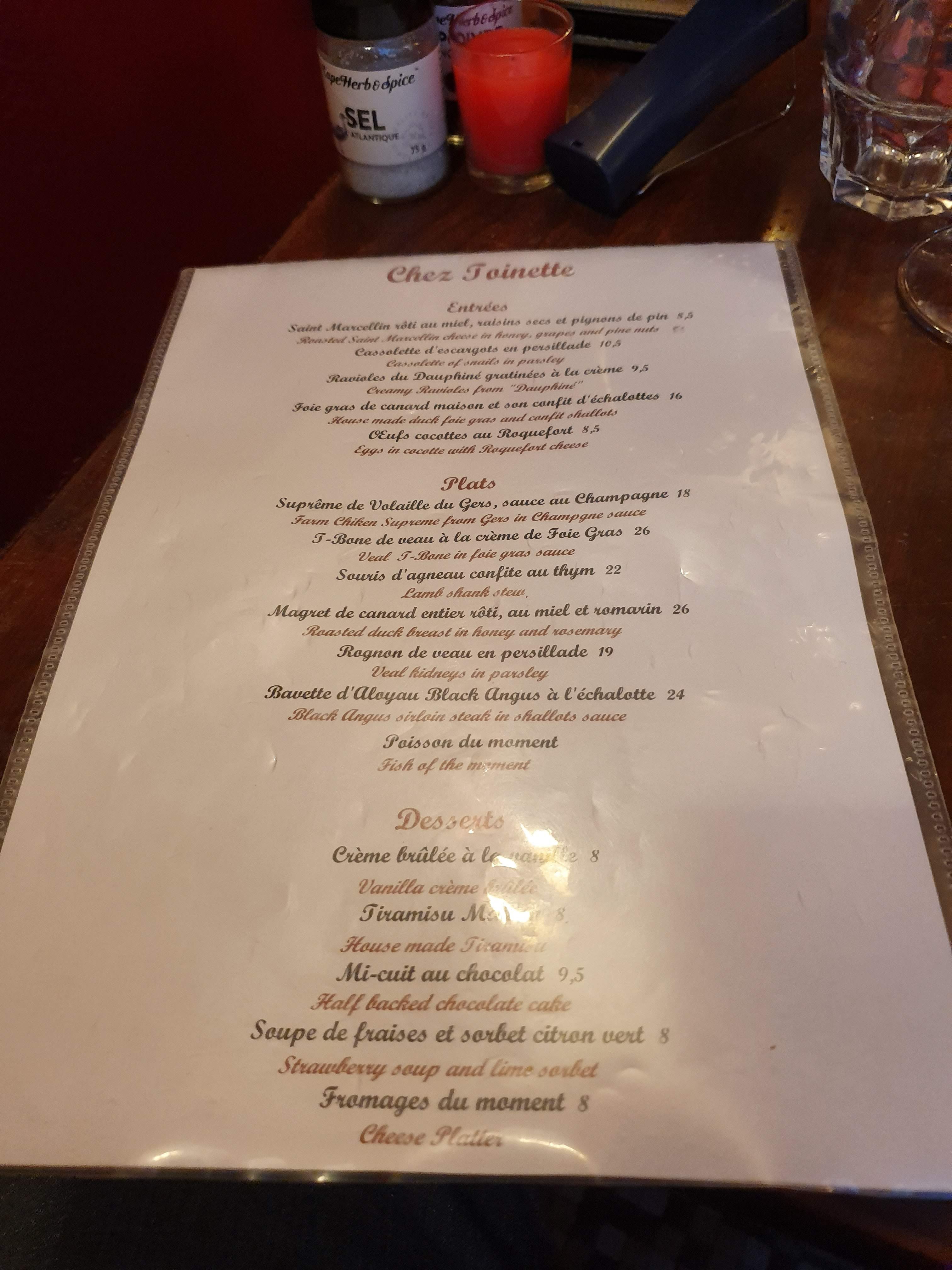 Nous avons eu un merveilleux dîner : escargots, os à moelle, bœuf bourguignon, souris d'agneau et un plateau de fromages pour les desserts. Le bœuf bourguignon était exceptionnel et les autres plats étaient très bons. Excellent service et bons vins au verre. Chez Toinette est un petit endroit romantique, je le recommande vivement !