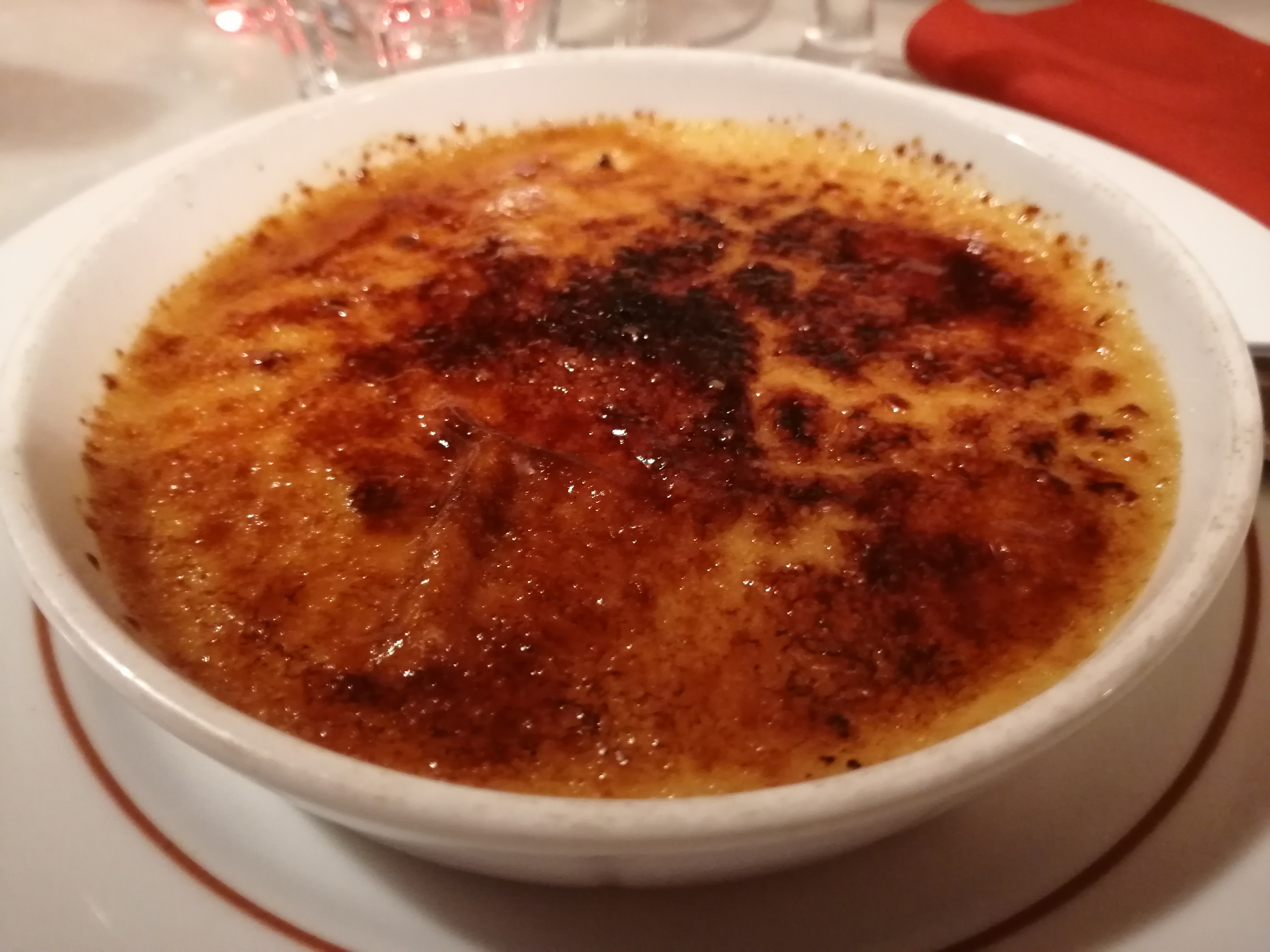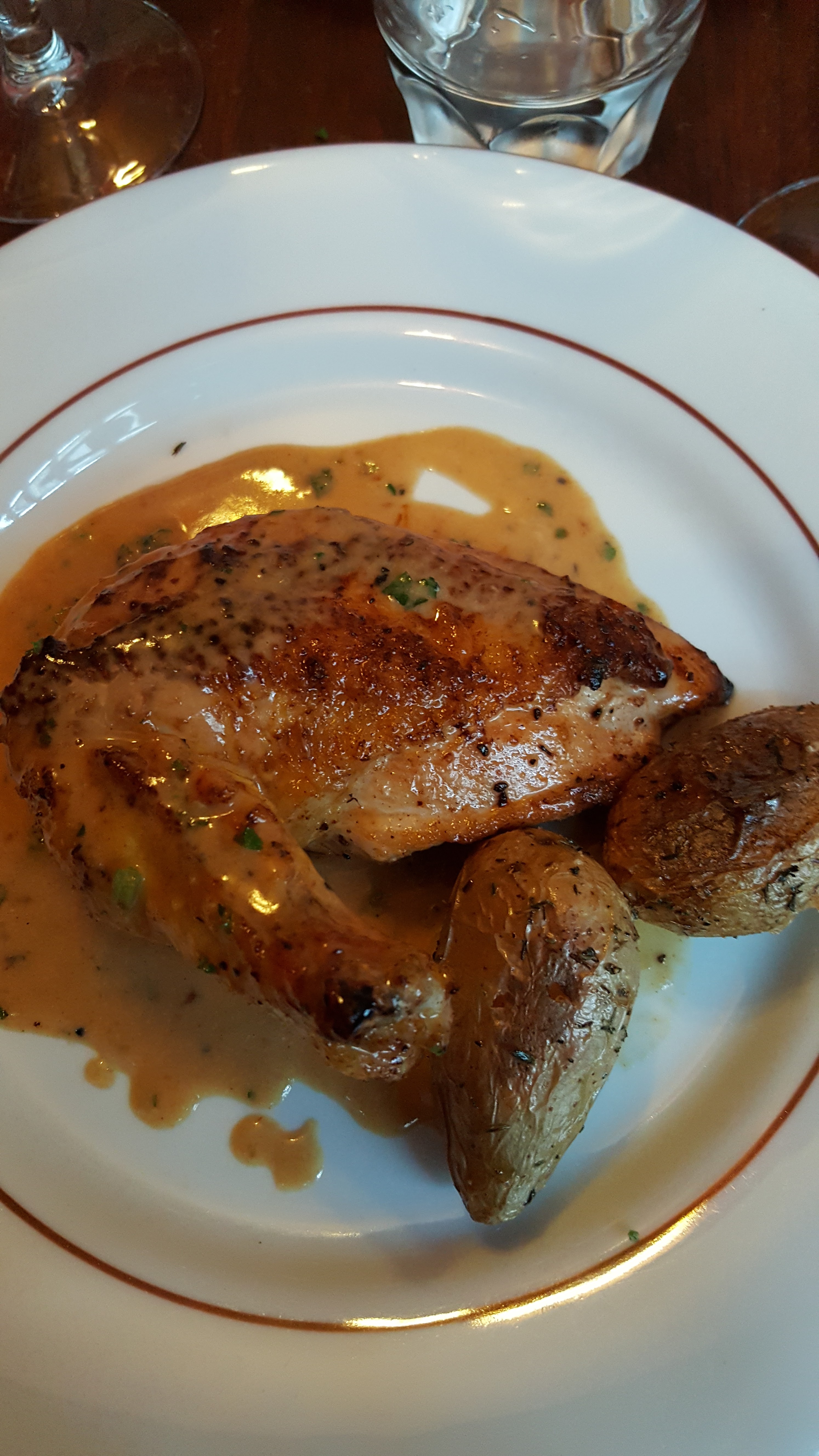 J'ai réservé en ligne pour une table et à notre arrivée, la très gentille serveuse connaissait notre réservation. Le restaurant se trouve dans une rue calme et son intérieur est peint en rouge avec des meubles en bois sombre. C'était un décor rustique. La nourriture est la star ici. Nos entrées étaient incroyables, un foie gras de canard accompagné de beaucoup de pain, ce qui est un bonus pour moi car je n'en ai jamais assez, le pain était également excellent, tout comme les échalotes caramélisées. Pour le plat principal, j'avais un steak de veau à l'os qui fondait dans ma bouche et les pommes de terre écrasées étaient belles et beurrées. Mon partenaire a pris le steak Black Angus qui était encore une fois excellent. Pour le dessert, nous avons tous les deux dégusté une très bonne crème brûlée. Cet endroit vaut le détour et la nourriture est excellente.