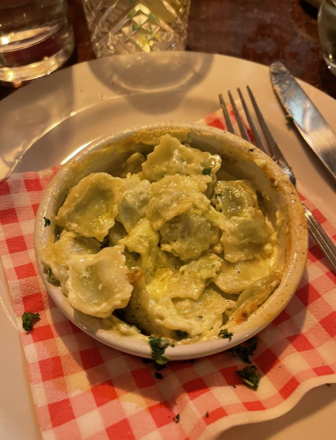 Commençons par l'attente, il n'y en avait pas, je venais de finir de boire un cocktail Absinthe dans la rue et ils n'étaient même pas encore ouverts... ma mauvaise mdr. J'adore le personnel ici et j'ai l'impression qu'il était sympathique, invitant, même pour un ivrogne comme je l'étais à ce moment-là. En allant aux toilettes, je me suis dit : « Levez-vous avec détermination, essayez de ne pas utiliser vos mains pour vous stabiliser ». Les crevettes (raviolis) sont arrivées rapidement et étaient délicieuses au fromage. Honnêtement, je ne sais pas si j'ai commandé un repas principal, j'essayais de revenir rencontrer cette fille que j'aime bien et je l'aurais peut-être laissé dans le taxi mdr. Je pense que c'était du jarret d'agneau mais je ne suis pas exactement sûr, j'espère que quelqu'un le fera.