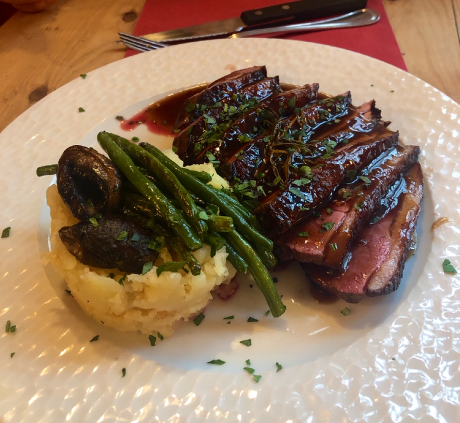 La nourriture (steak et canard) n'était tout simplement pas bonne. La viande était dure, la purée de pommes de terre insipide. De plus, il est préparé avec négligence et en portions plutôt petites. L'entrée était médiocre (pâtes au fromage). Malheureusement, nous avons mangé bien mieux dans tous les autres restaurants de Paris.