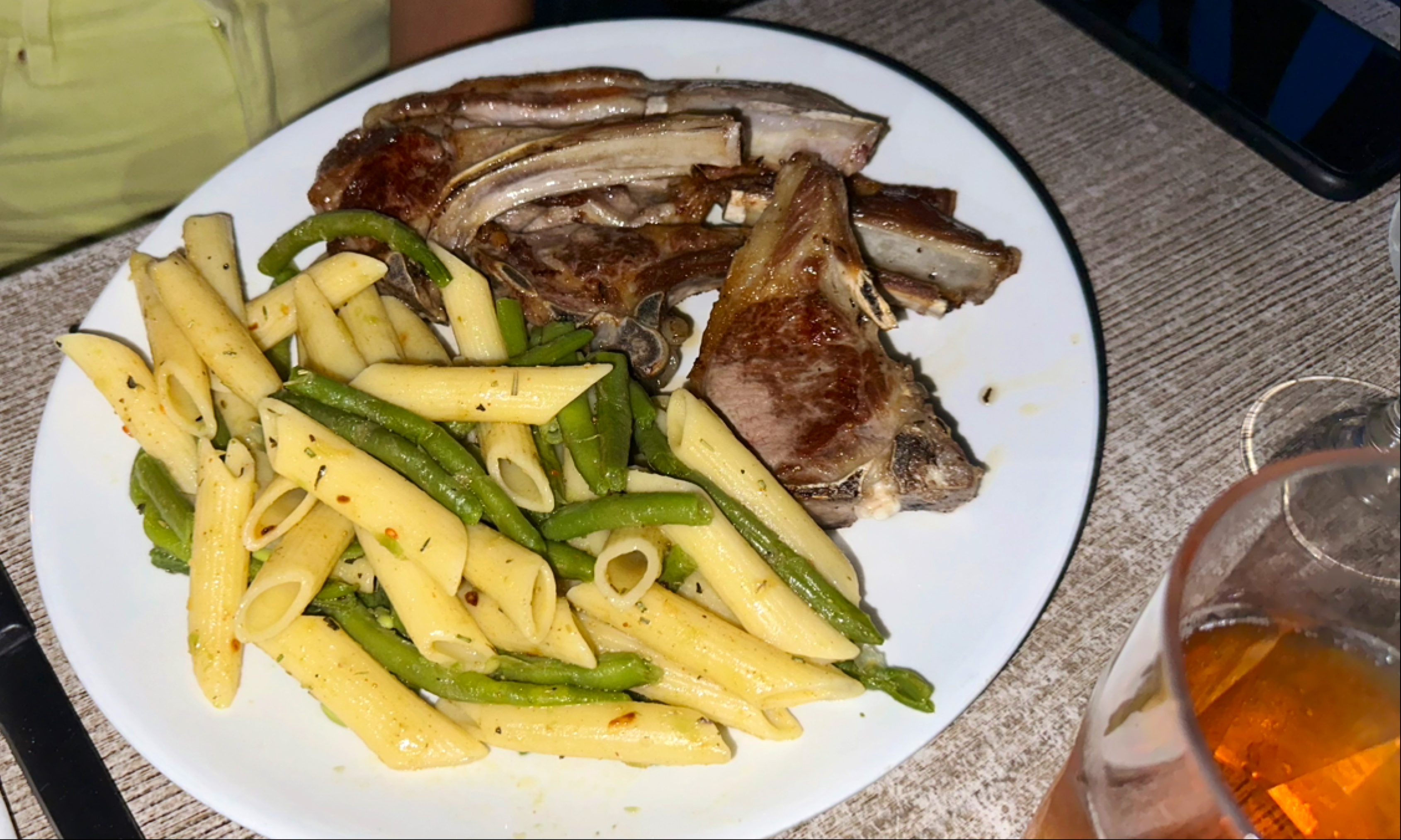Nous étions de passage d'Espagne en Allemagne, avons passé la nuit dans un hôtel local et voulions manger quelque chose peu après 20 heures. Lors de la commande, nous nous sommes appuyés sur les recommandations du propriétaire et avons obtenu une longe de porc et des côtelettes d'agneau parfaitement grillées chez la boucherie de l'autre côté de la rue. Au préalable il y avait de la bagutte et de la salade fraîche ainsi que 2 verres de vin avec le repas.