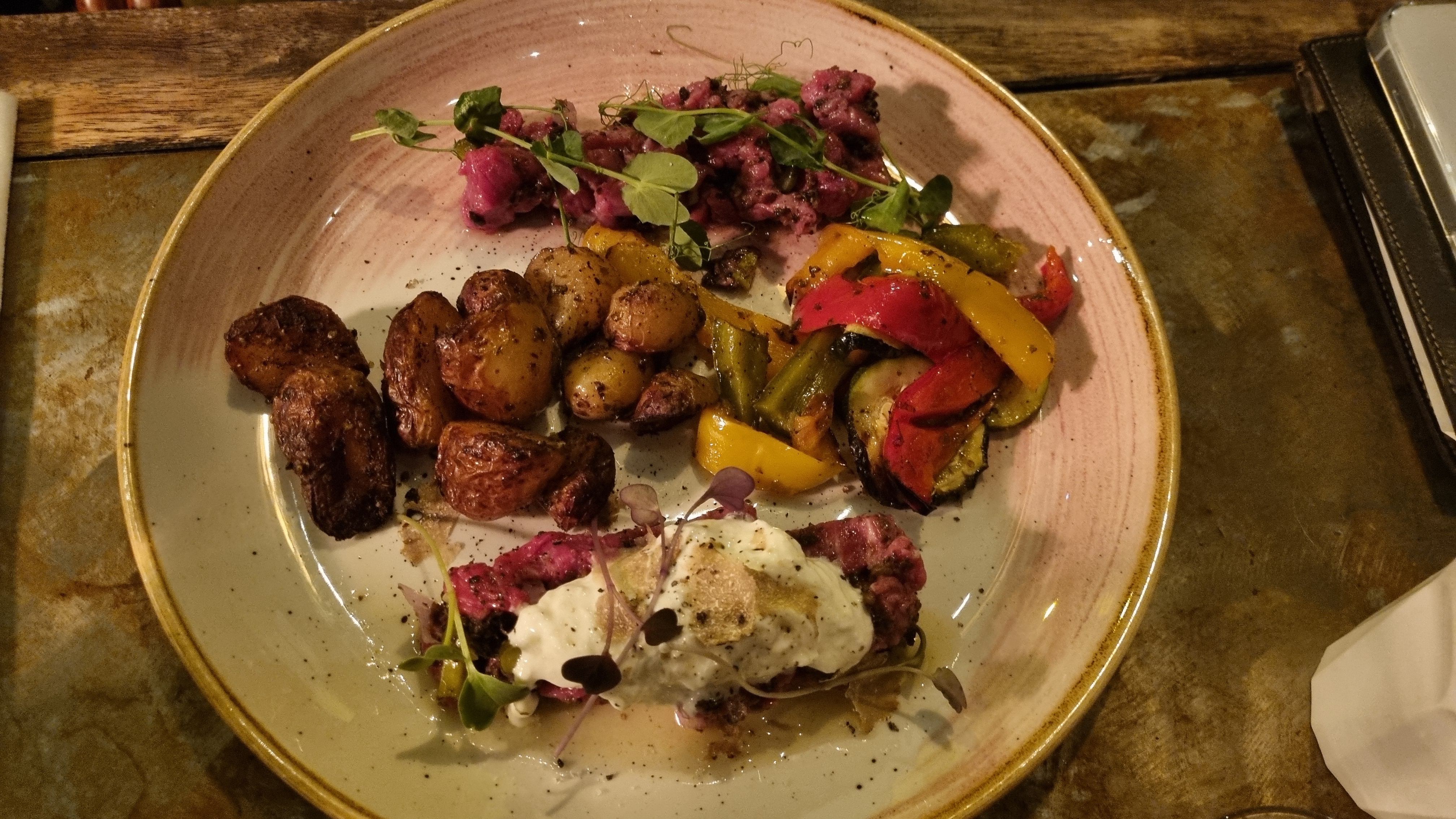 L’entrée (carpaccio de coppa) et les desserts (gaspacho de fraise et pavlova) étaient incroyables. Les plats moins bien mais restaient plutôt bons. Par contre le service était vraiment très très long, et l’une des entrées commandées n’a pas été servie.