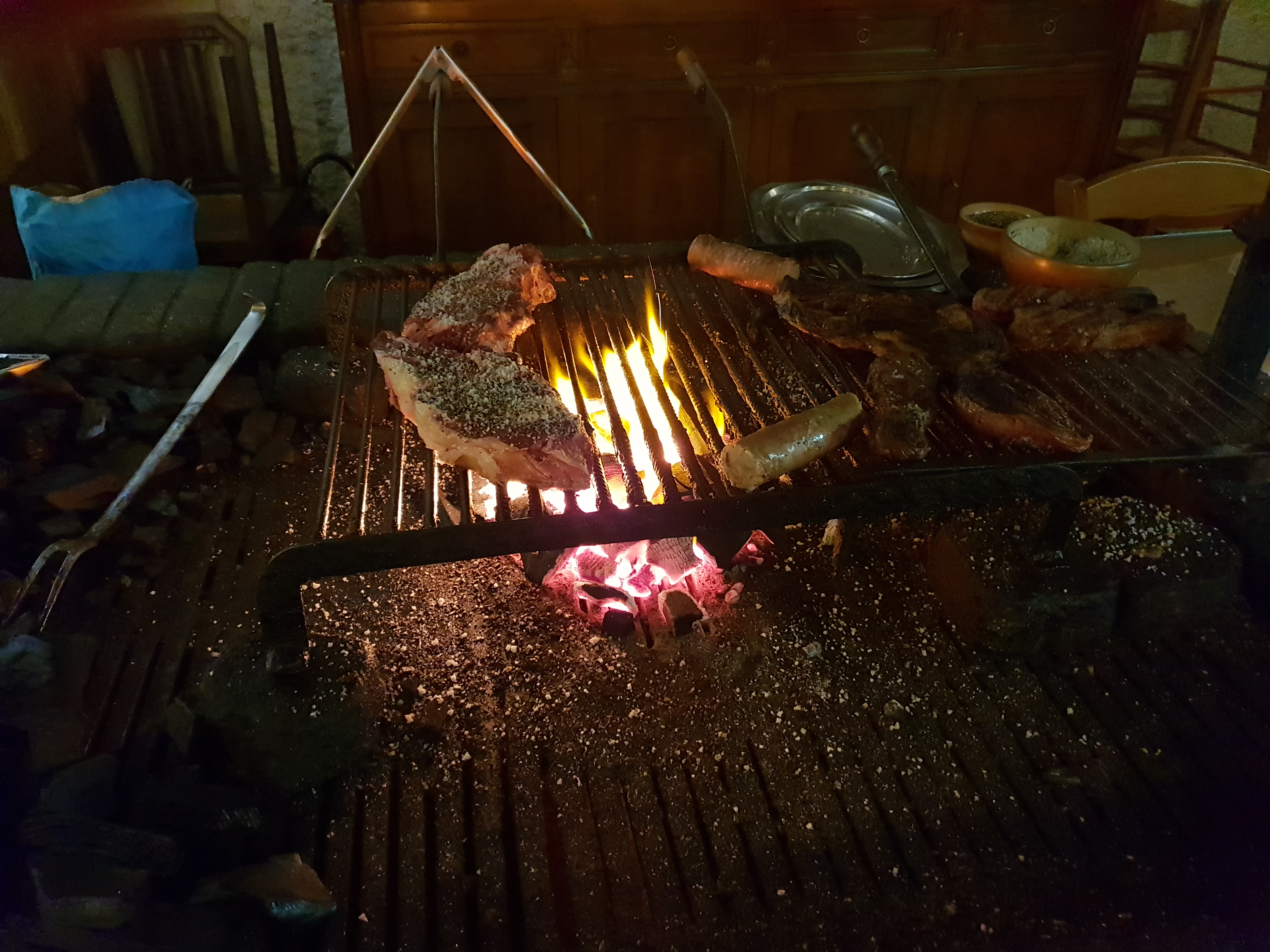 Belle table a l'ancienne. La viande est a l'honneur avec cuisson au feu de bois .