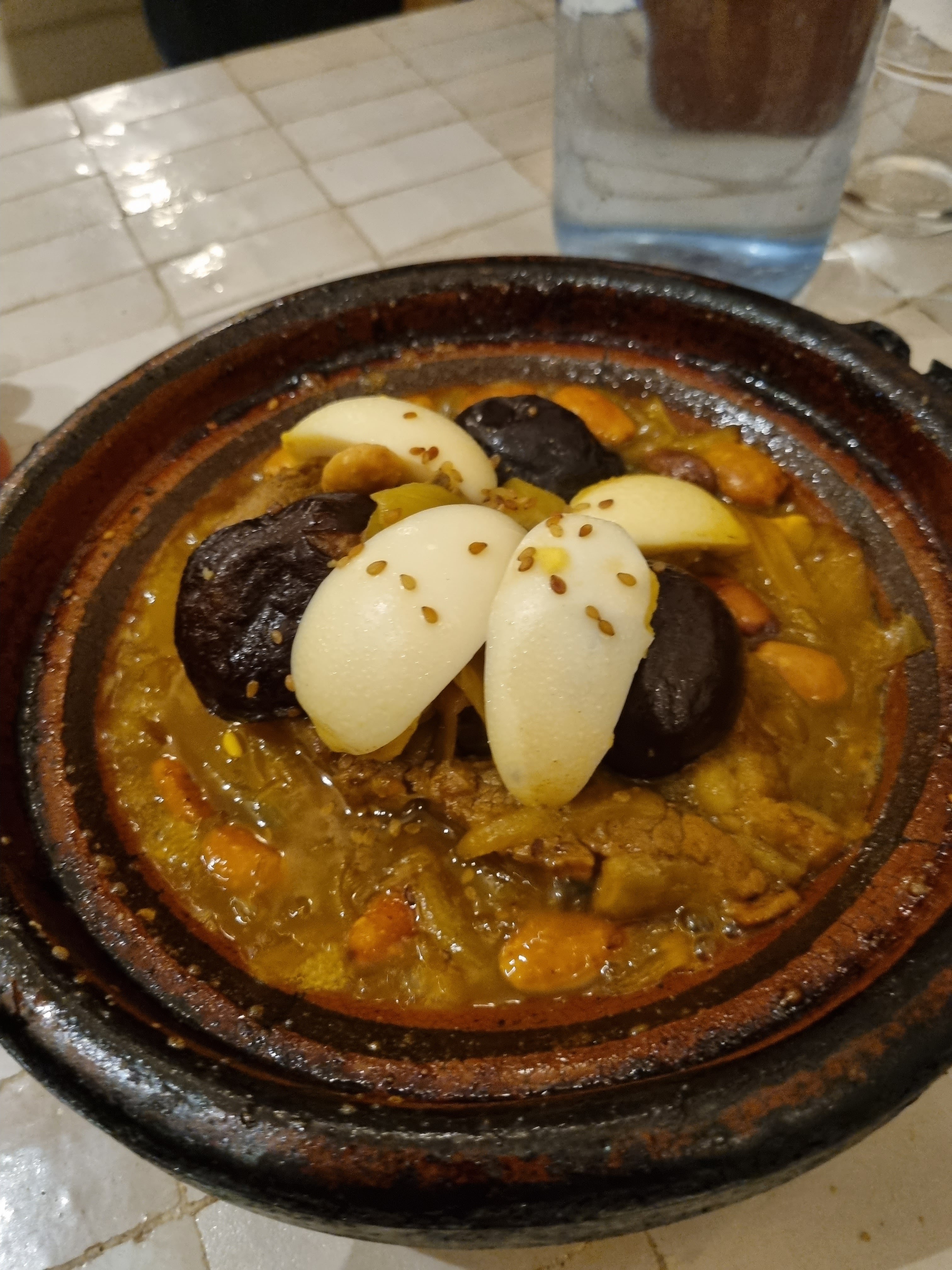 Alors mon avis est à prendre avec des pincettes Première fois que je mange dans un restaurant oriental et première fois que je mange un tajine et ma maman de même. Nous avons trouvé cela assez fade et pour ma part maigre en viande ,j'ai eu pas loin de 50grammes de viande sur mon agneau j'ai eu plus d'os que de viande 2/3 d'os ,j'ai peut être pas eu de chance sur ce point. On nous a donné une crêpe au miel pour s'excuser. Ma mère n'avait pas assez de jus dans son tajine on lui en a donné en plus et sincèrement le jus était très fade c'était du jus avec des oignons. C'est gentil quand même Les tables méritent d'avoir un set de table je sais que ça ne doit pas être très oriental mais quand on arrive et que la table garde les restes alimentaires après nettoyage parce que la table est avec une sorte de mosaïque on pas trop envie de poser son pain et son bras sur la table Le service est pas mal Comme dit précédemment je n'ai aucune réel connaissance sur ces plats donc aucune comparaison ainsi je donne uniquement mon avis sur le plat J'irai ailleurs pour comparer Merci quand même