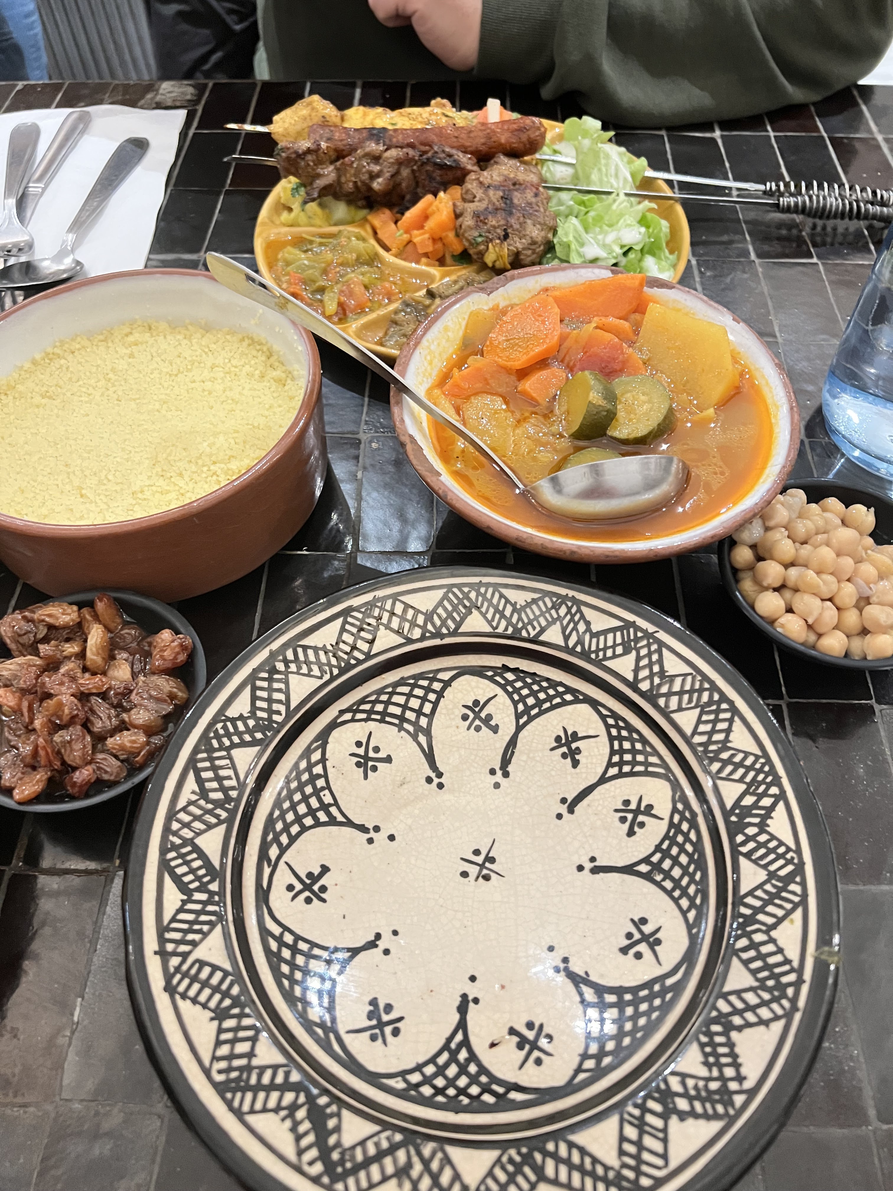 Une expérience à recommander. Je commence par l’accueil qui était si chaleureux, par un thé et une soupe marocaine offerts par le restaurant. On avait pris des grillades de Kefta et un plat de couscous à l’épaule d’anneau qui étaient copieux et si bons. L’ambiance est arabe avec une variété de chanson douces et calmes ainsi que le design est apaisant. J’y reviens.